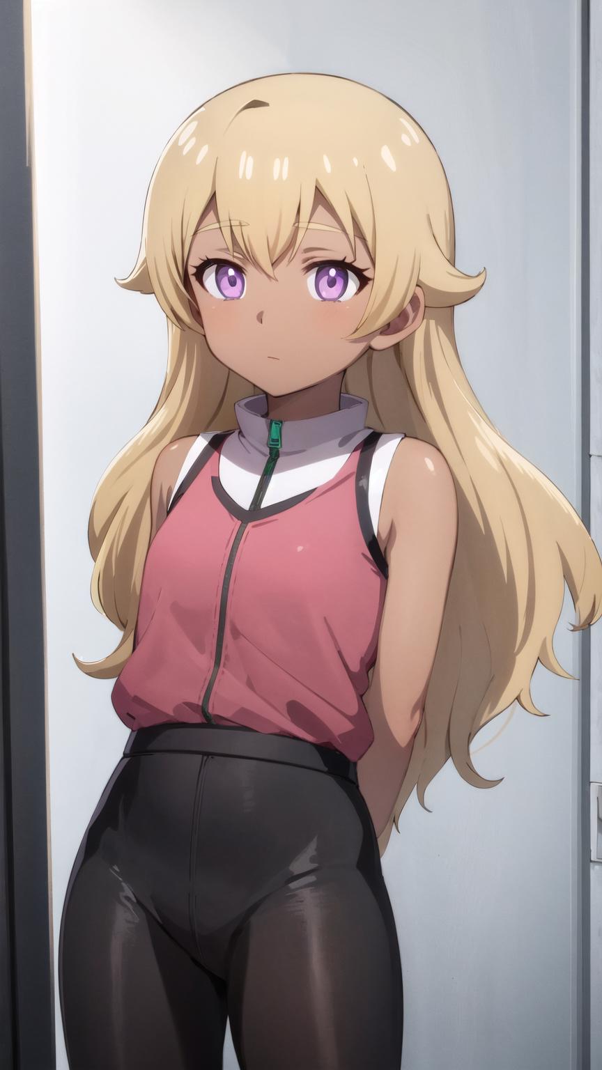 blonde hair, long hair, anime coloring, purple eyes, dark skin, dark-skinned female, hair ornamemt