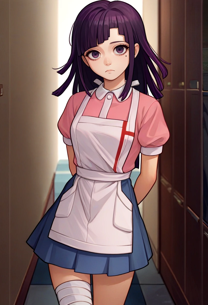 pink shirt, puffy short sleeves, white apron, blue skirt, bandaged leg, bandaged arm