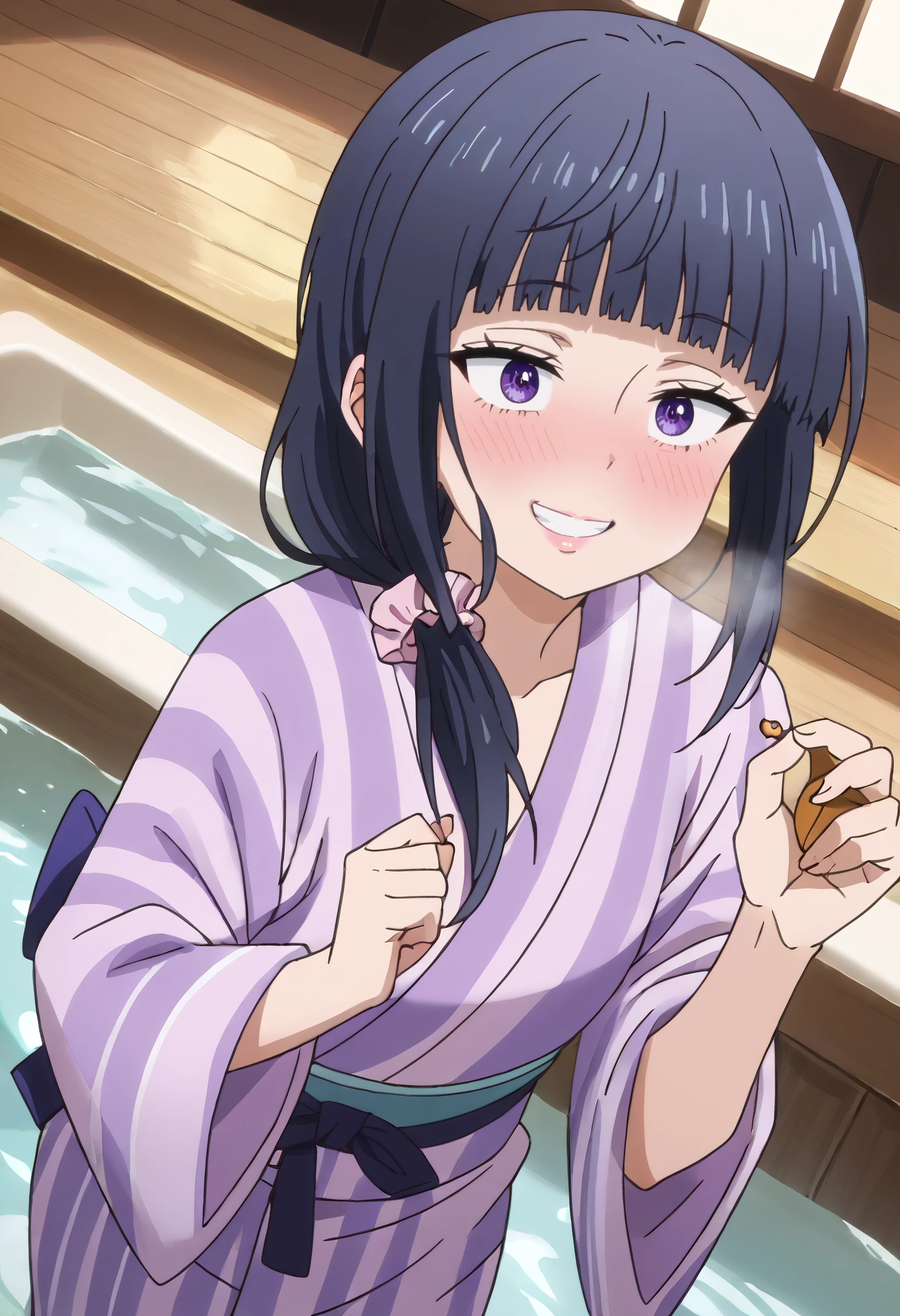 RiriKimono, japanese clothes, kimono, yukata, hair ornament, scrunchie, hair scrunchie, hair over shoulder, bath yukata, bathrobe, side ponytail, pink scrunchie, low ponytail, robe, grey kimono, wide sleeves, slippers,