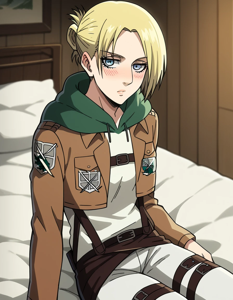 <lora:anni-leonhart-s1-ponyxl-lora-nochekaiser:1>, annie leonhardt, short hair, blue eyes, blonde hair, folded ponytail,