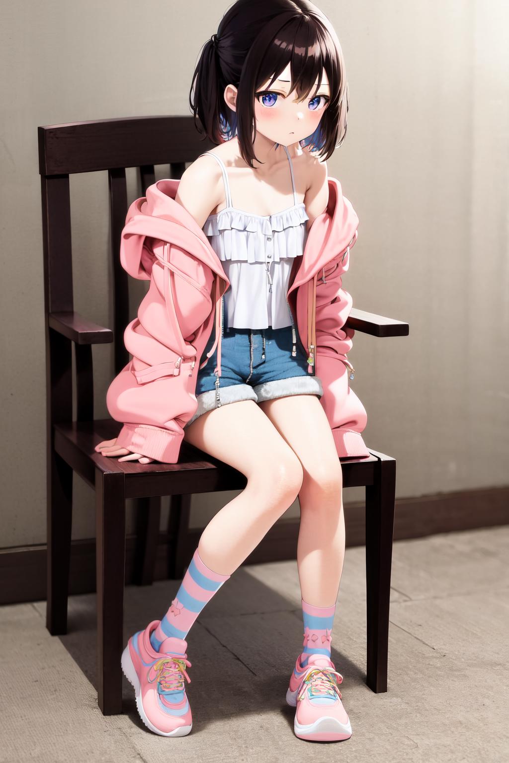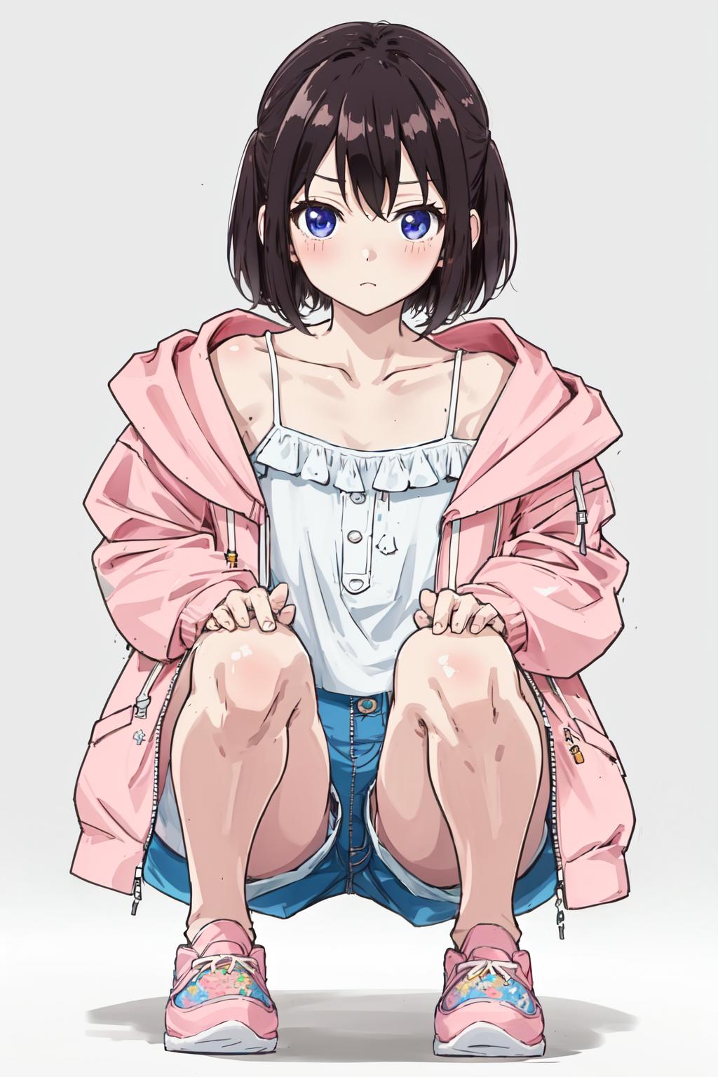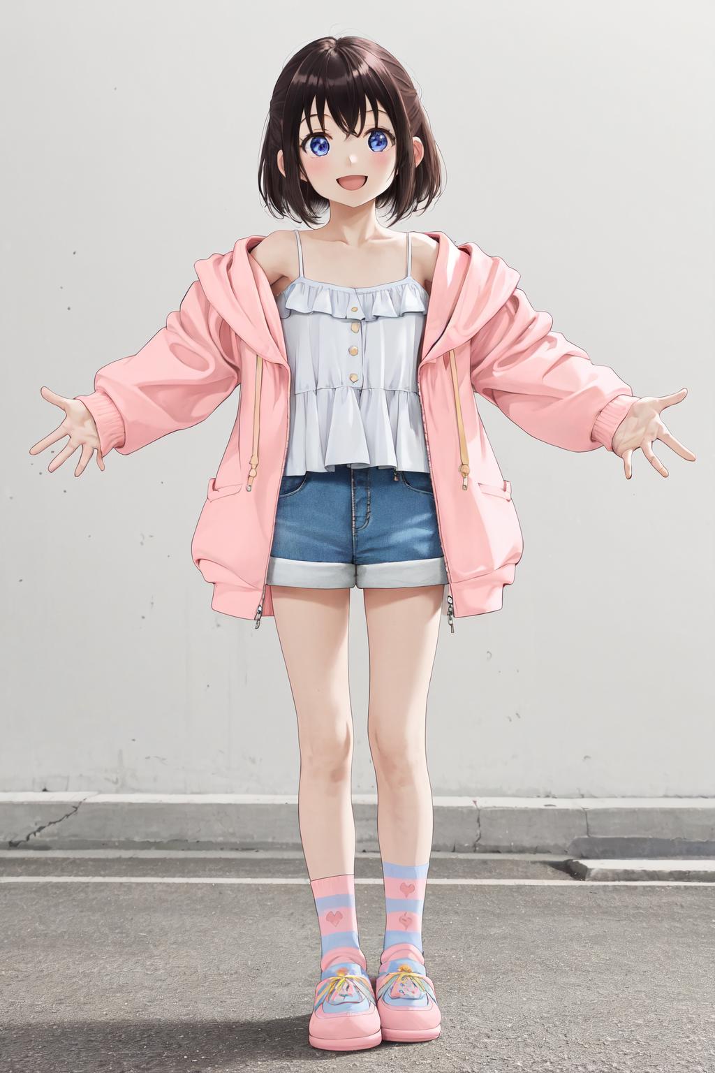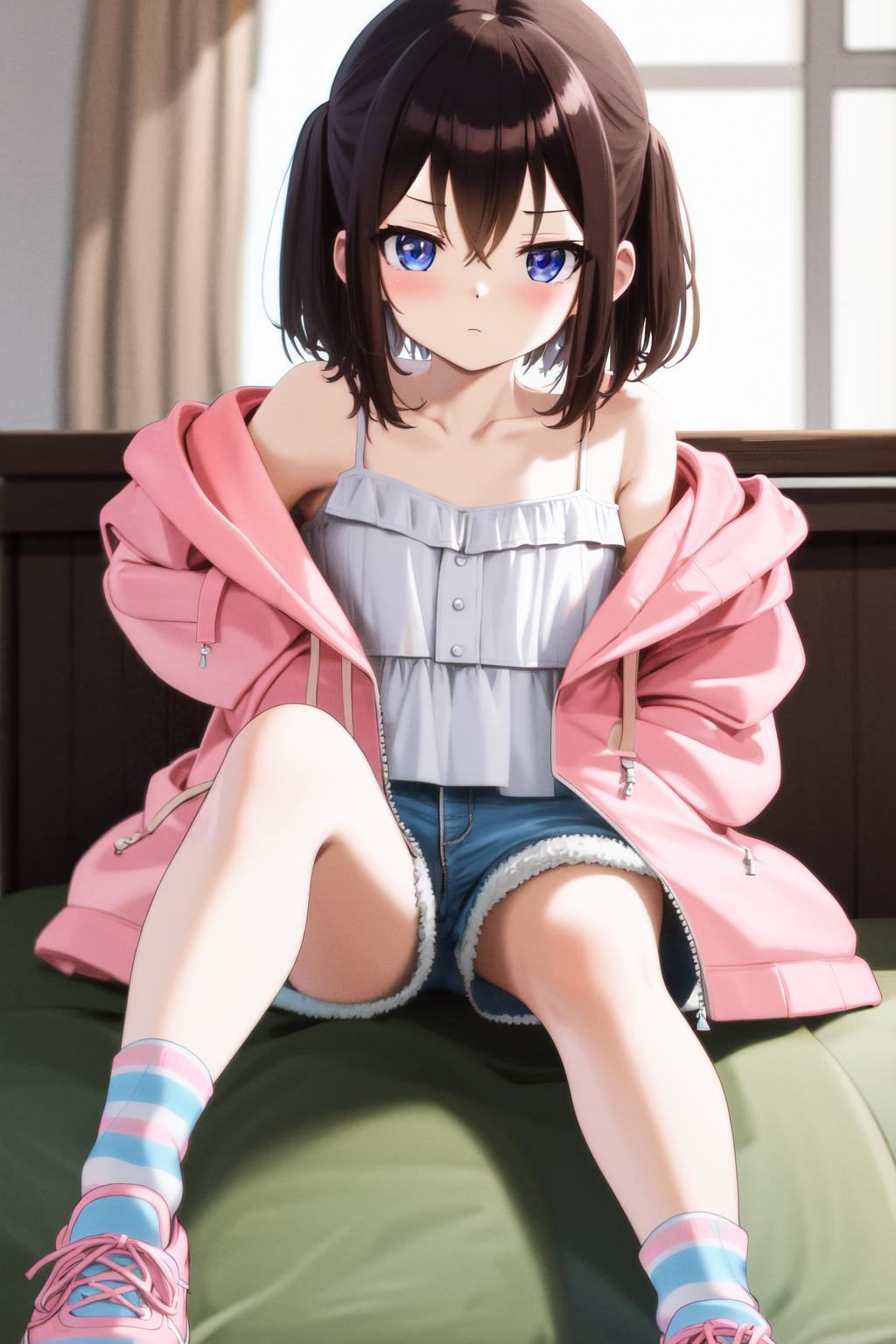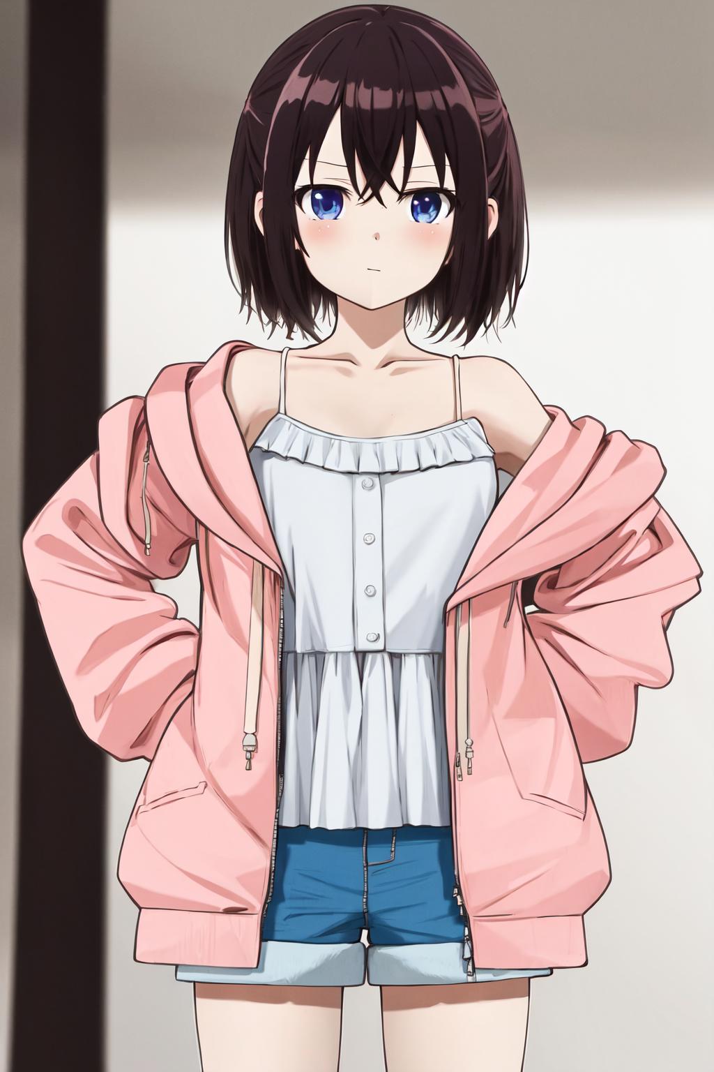 Default outfit: blue shorts pink jacket hooded jacket white camisole bare shoulders