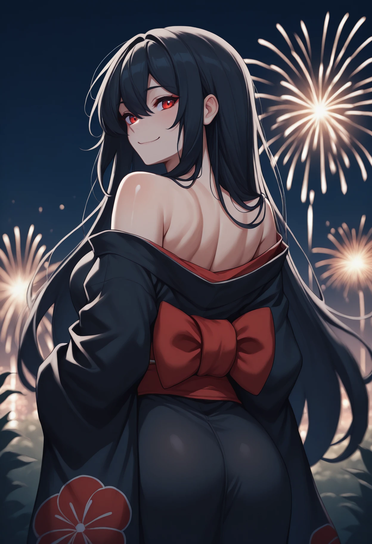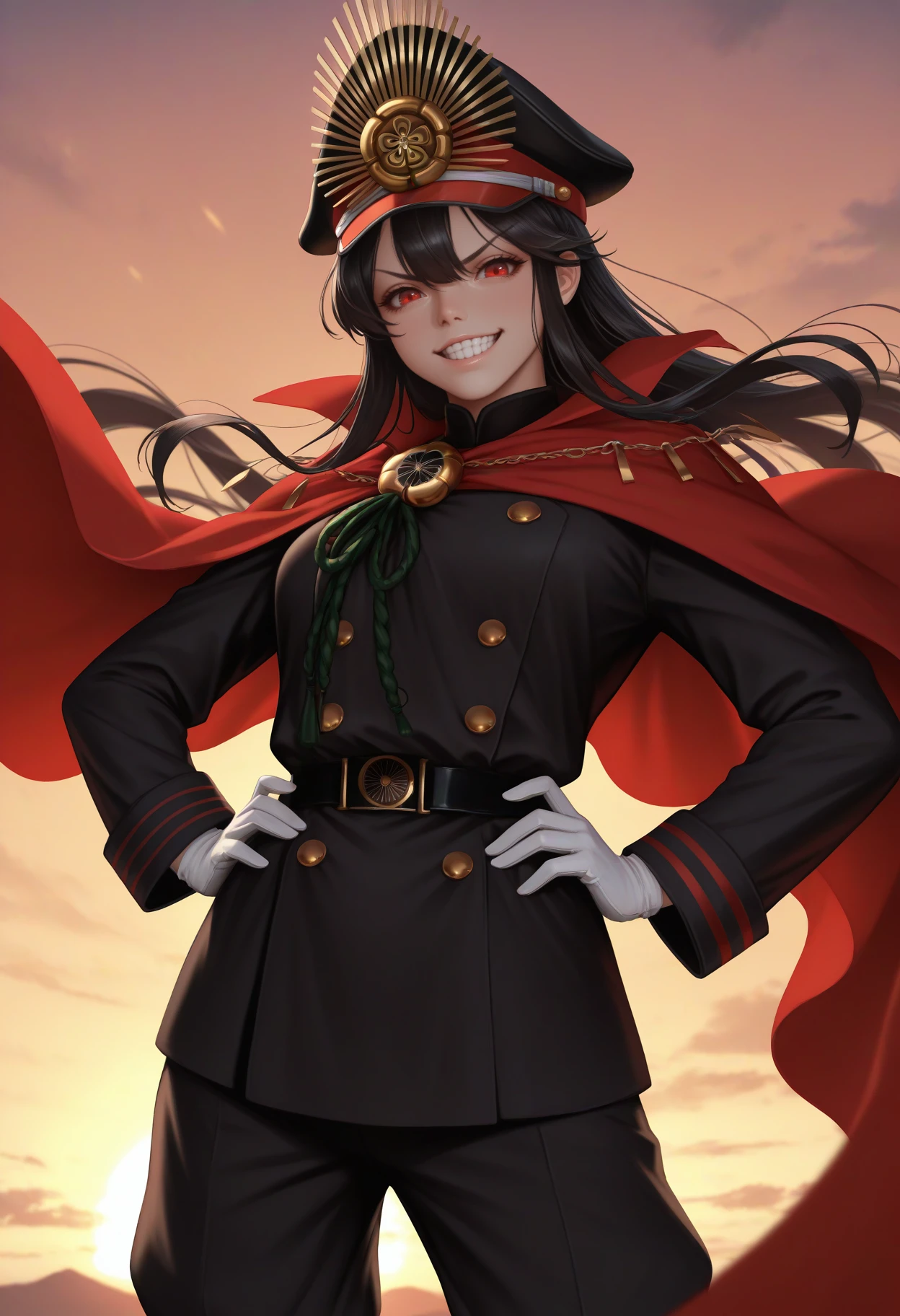 0dadef, long hair, black hair, black headwear, military hat, peaked cap, red eyes, family crest, oda uri, military uniform, red cape, black jacket, buttons, double-breasted, belt, long sleeves, white gloves, black pants
