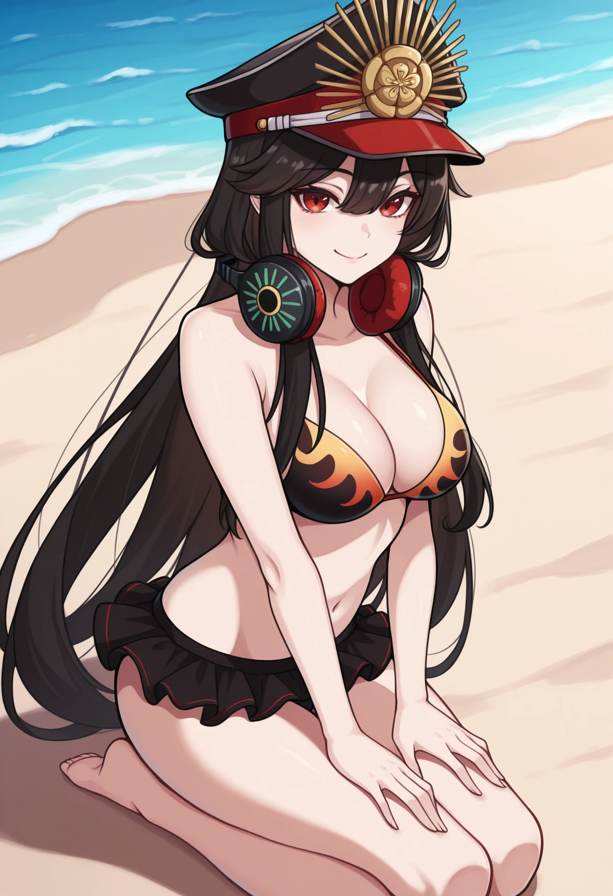 0daswim, long hair, black hair, black headwear, military hat, peaked cap, red eyes, family crest, oda uri, headphones around neck, black bikini, bikini skirt, microskirt, frilled skirt, cleavage, breasts