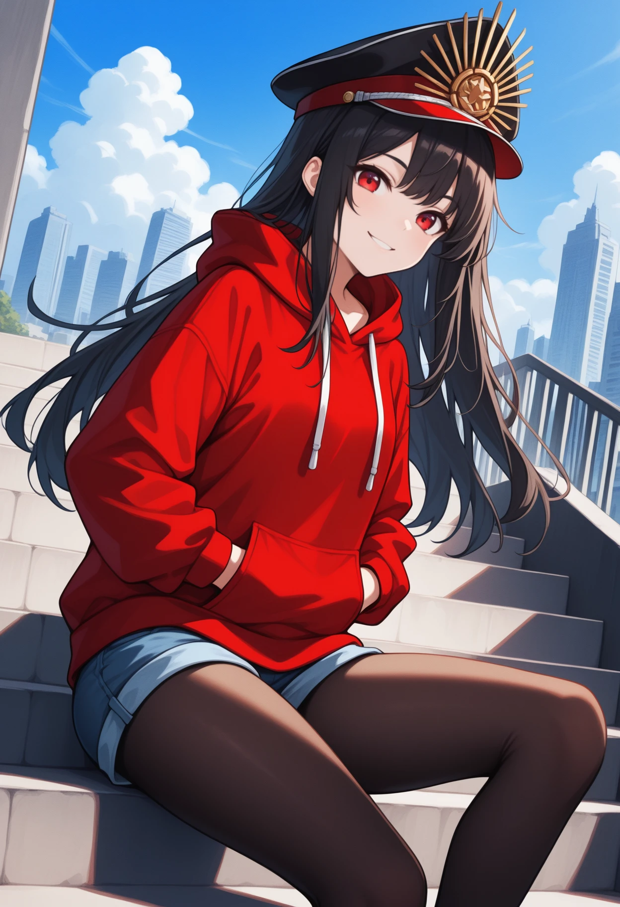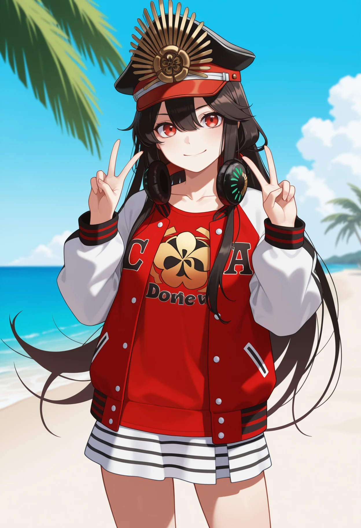 0daswim, long hair, black hair, black headwear, military hat, peaked cap, red eyes, family crest, oda uri, headphones around neck, letterman jacket, open jacket, long sleeves, red shirt, clothes writing, striped clothes, white skirt, striped skirt, collarbone