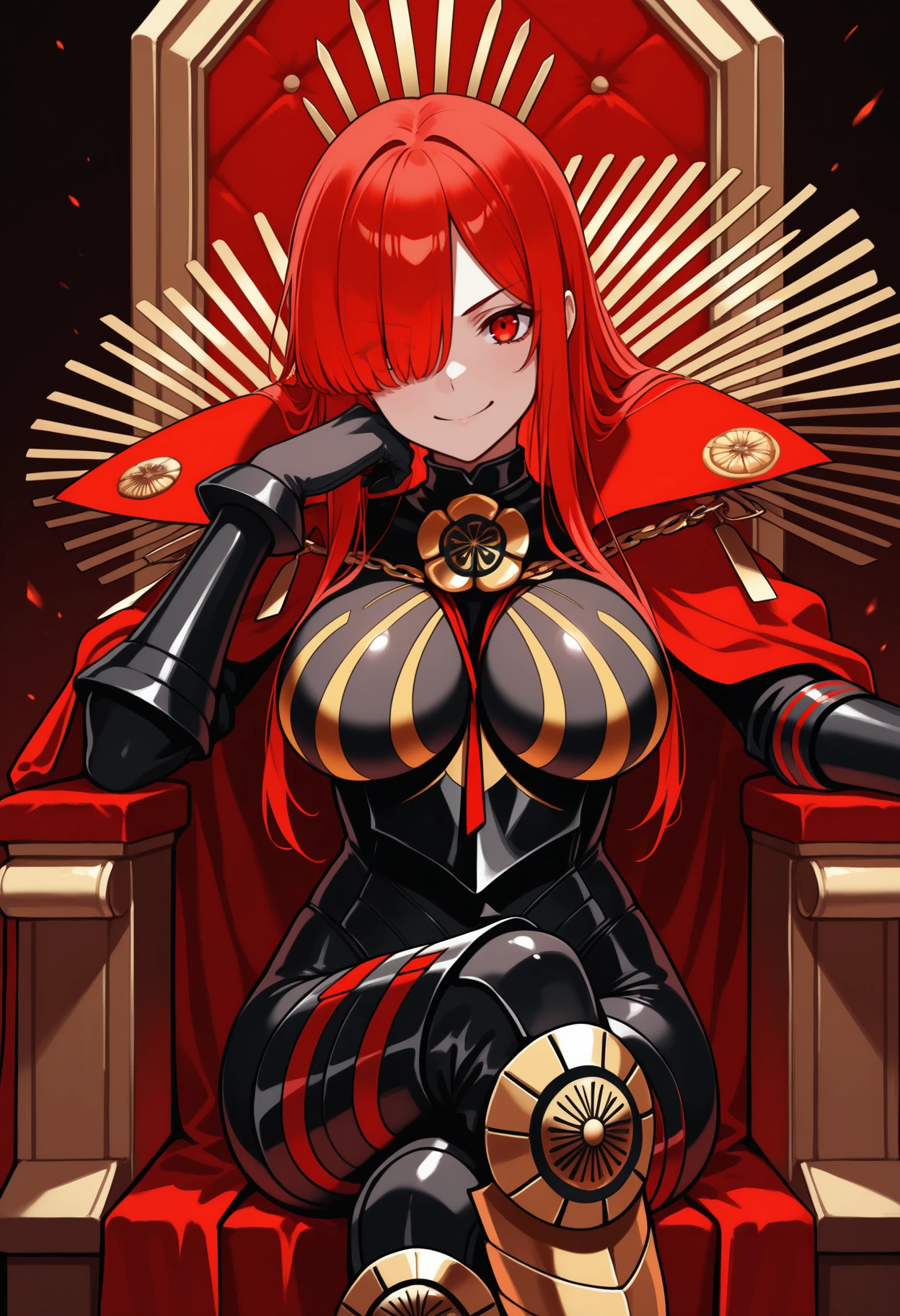 0daavgr, red hair, hair over one eye, red eyes, family crest, oda uri, red cape, collared cape, popped collar, armor, black bodysuit, medallion, black gloves, armored boots, large breasts
