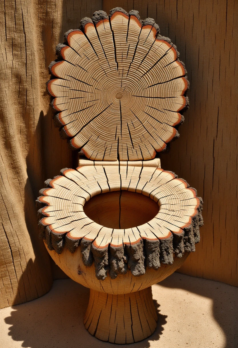 Photograph showcasing a large, stylized (SUBJECT) made from the cross-section of a tree trunk.