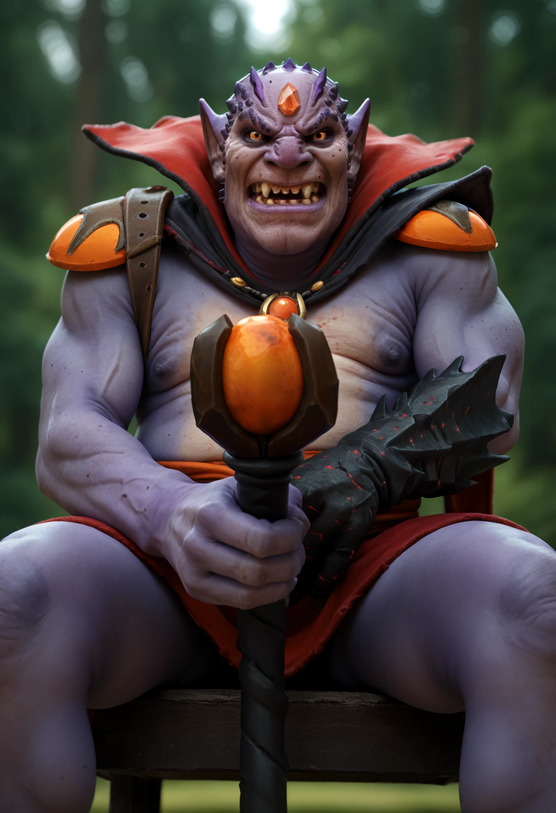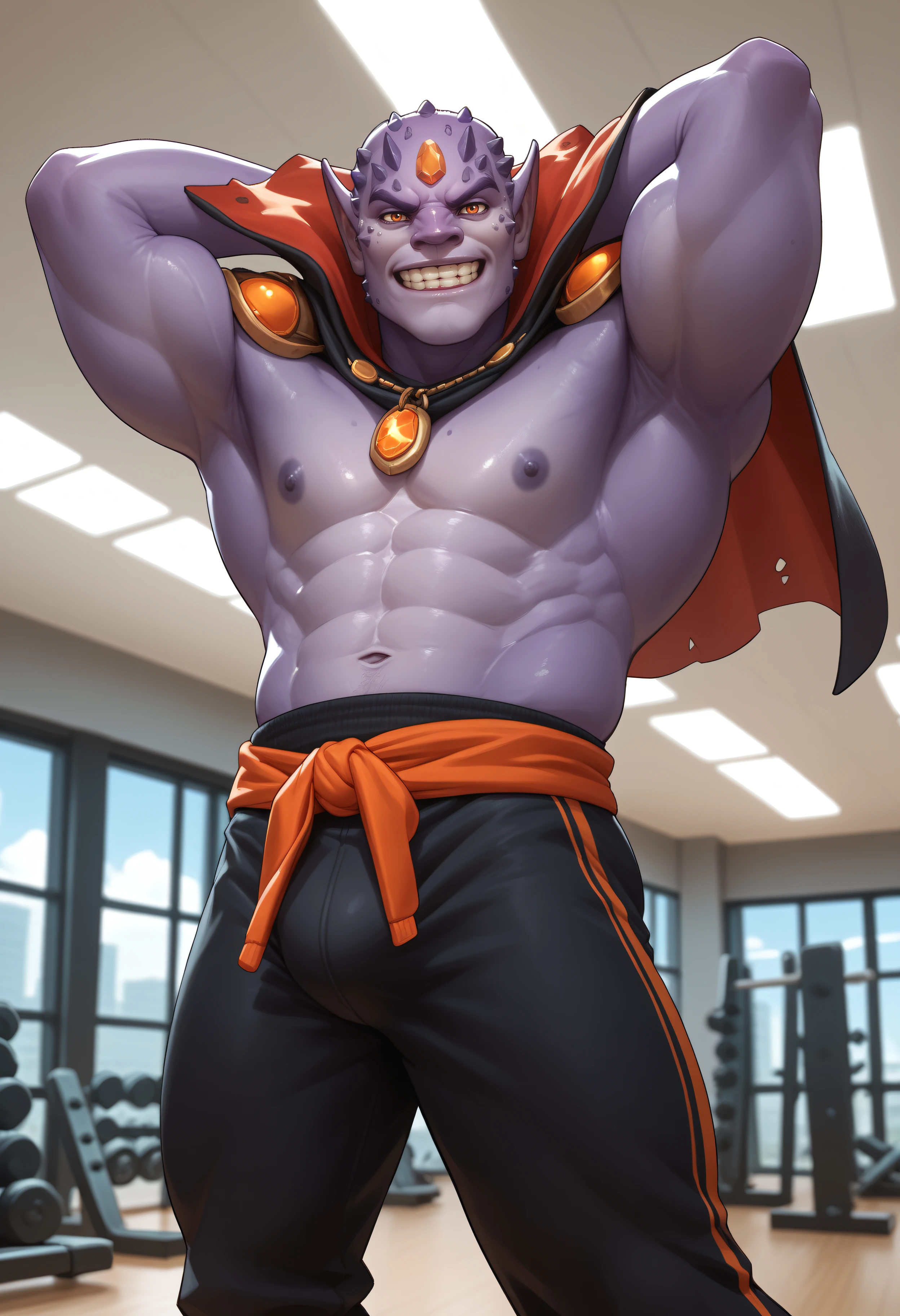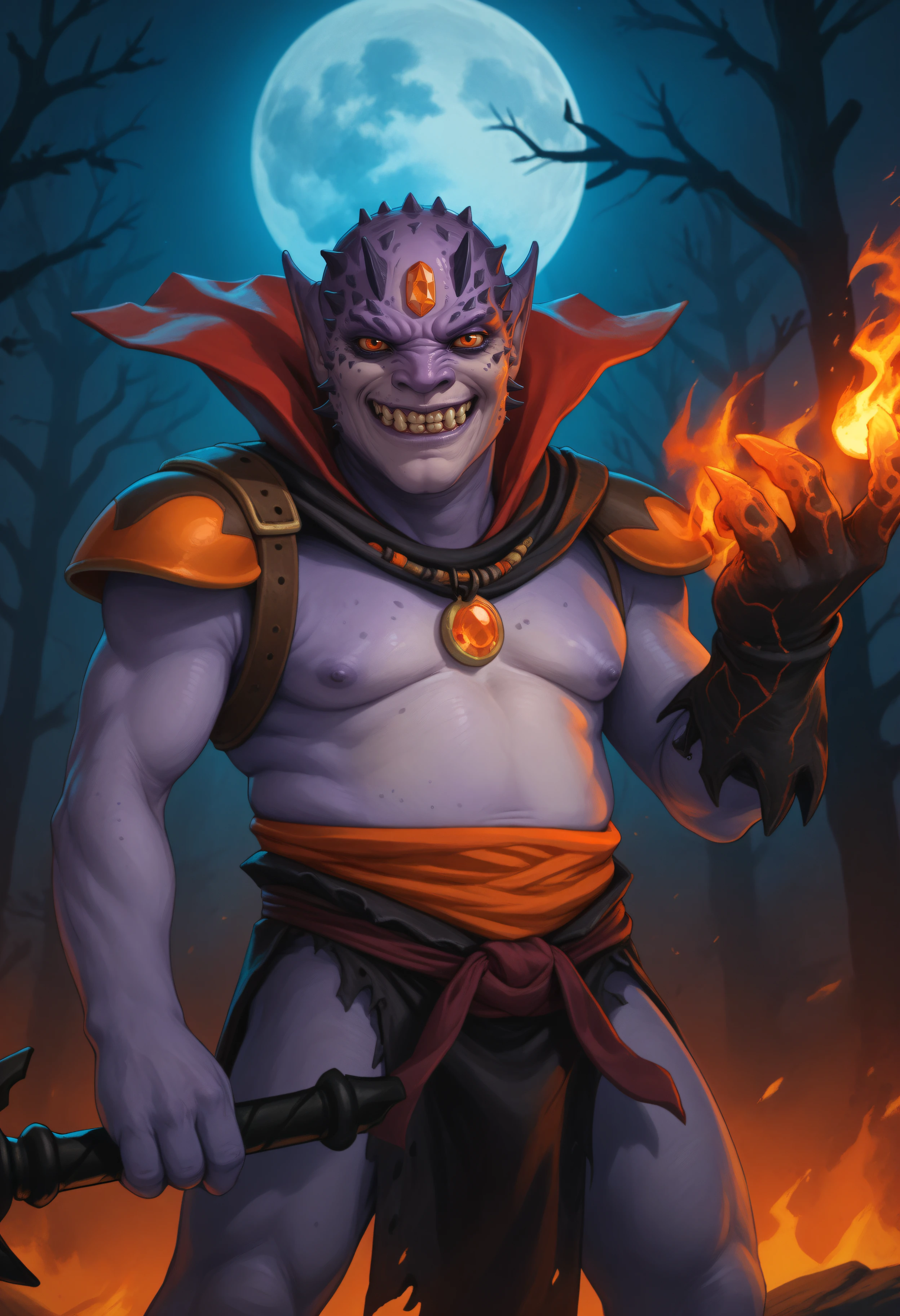 Reinforcement tags: forehead jewel, pointy ears, purple skin, orange eyes, fangs