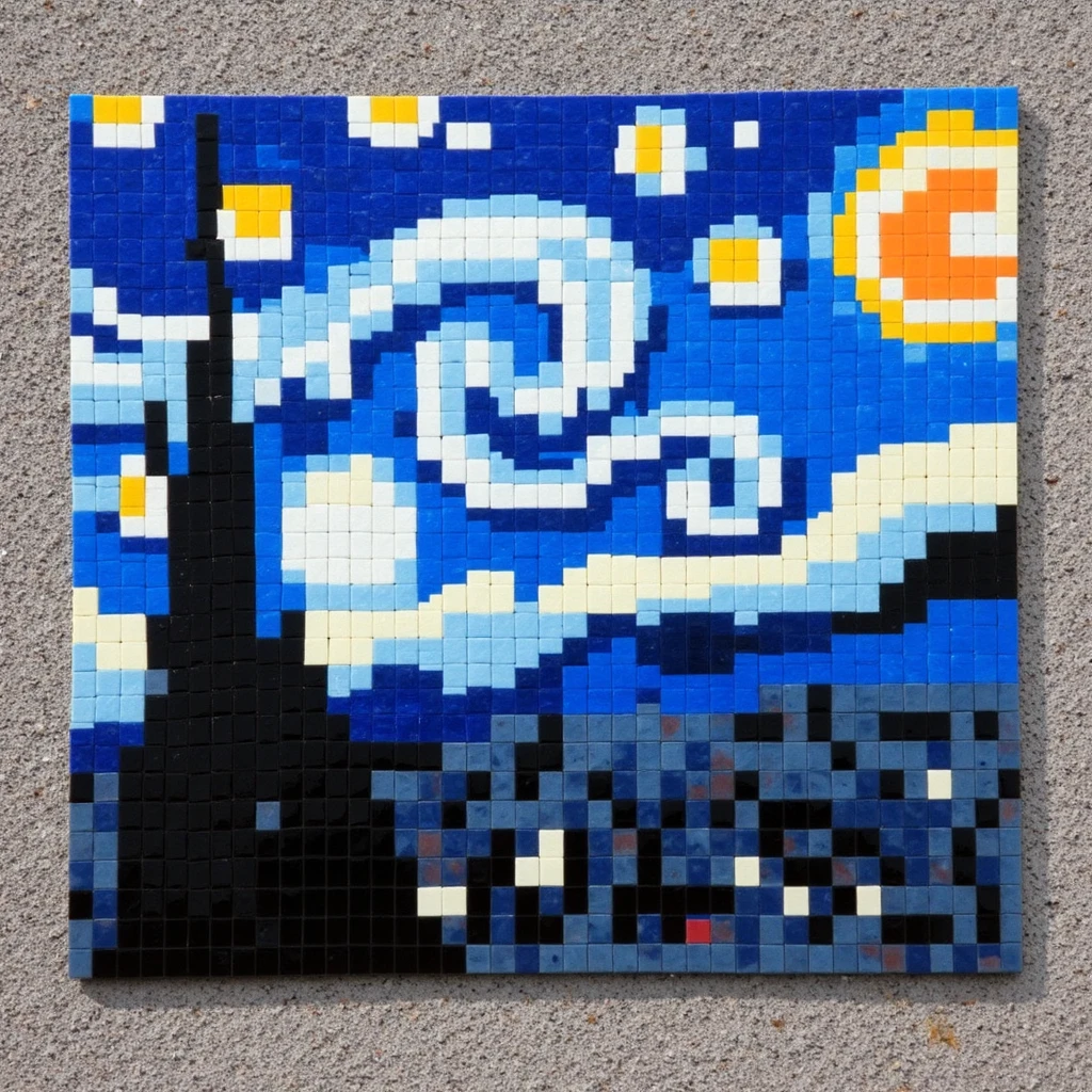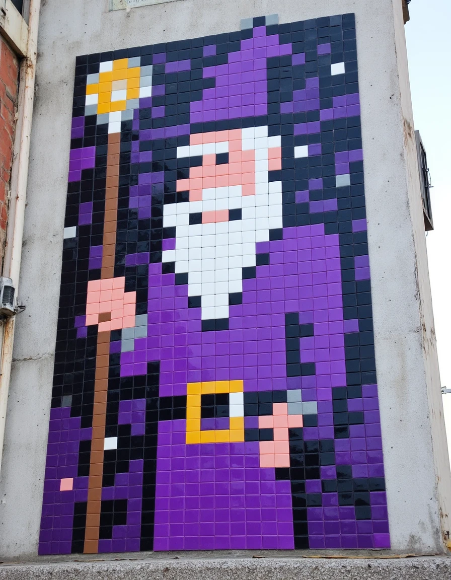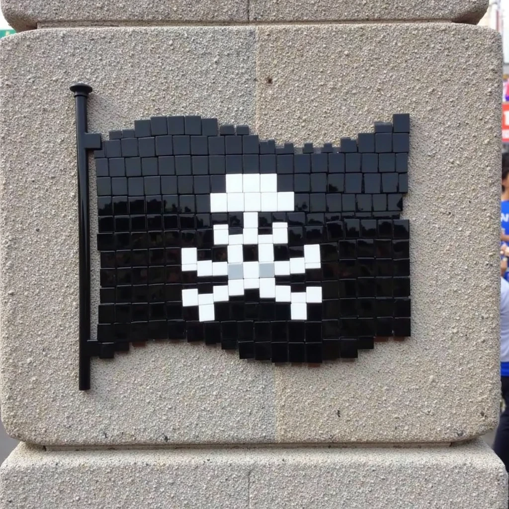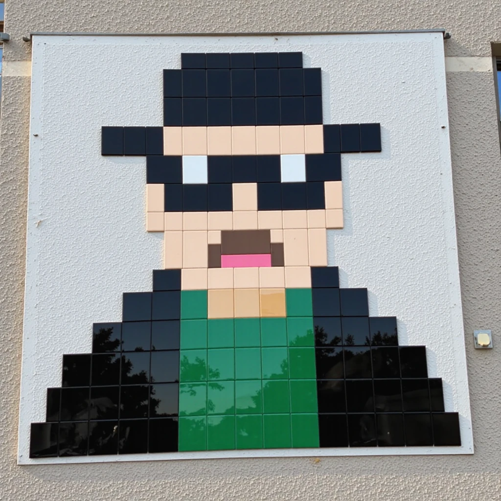 ceramic tile street art mosaic of a [prompt][prompt] The mosaic is made entirely of single layer of equally sized 1 inch square ceramic tilesstreet art photography