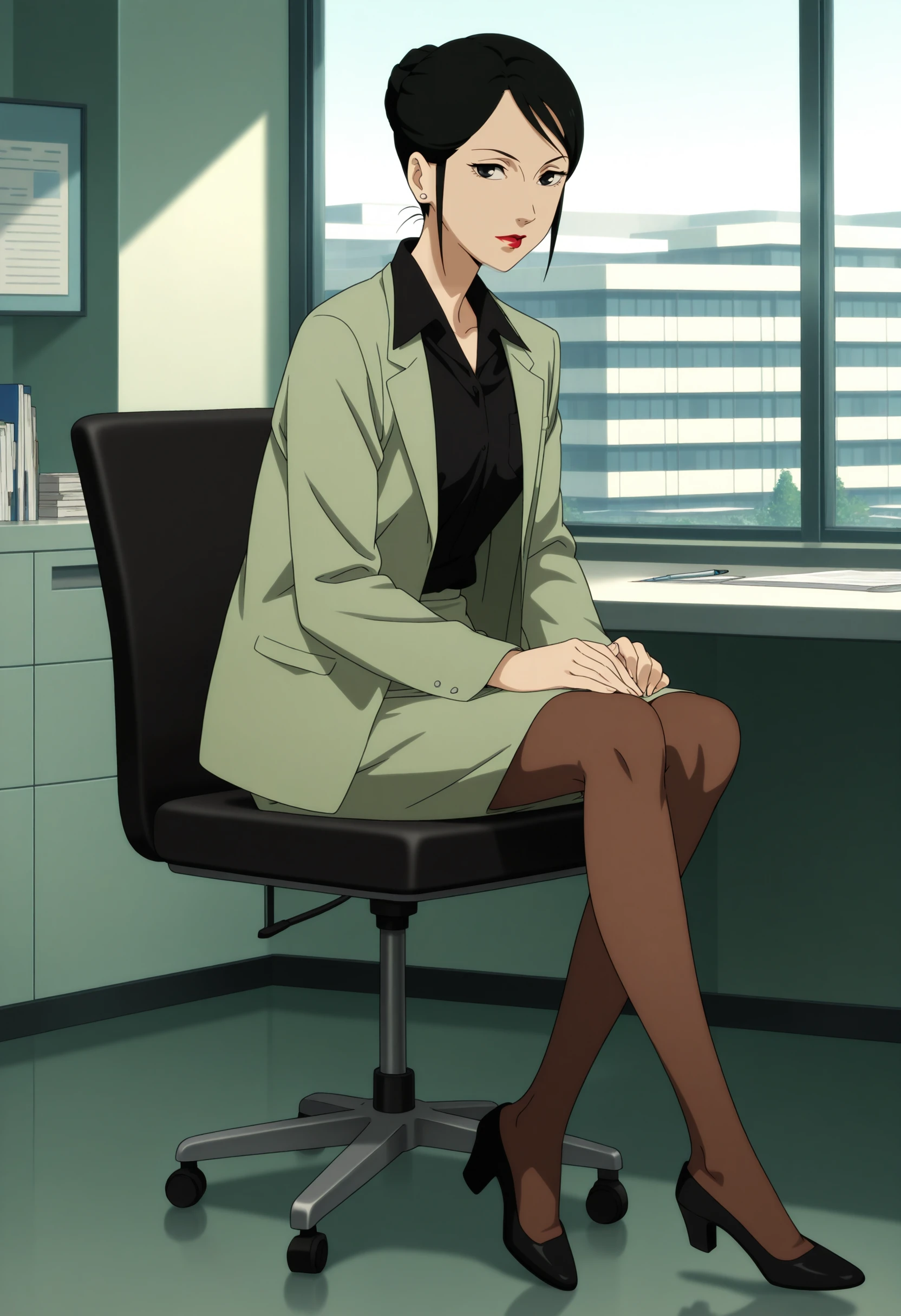 black shirt, collared shirt, green jacket,brown pantyhose, pencil skirt, green skirt, high heels, black footwear,