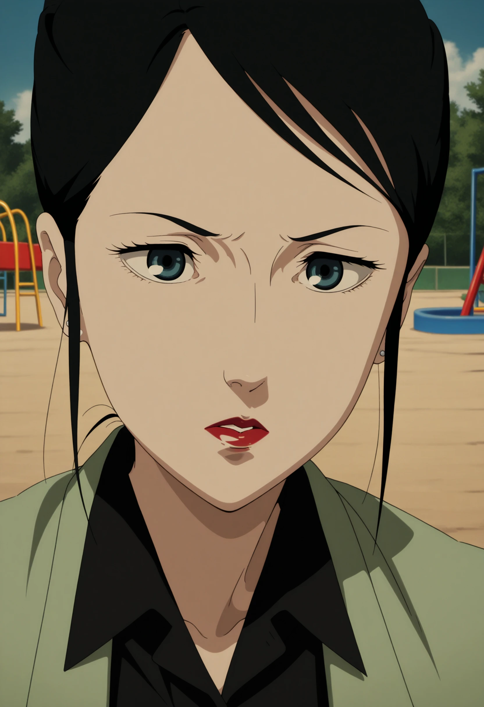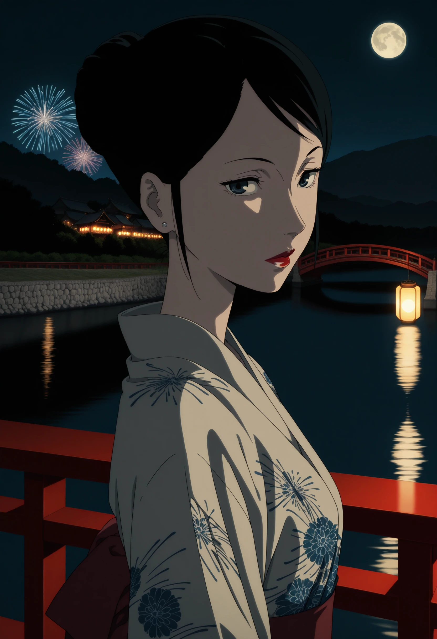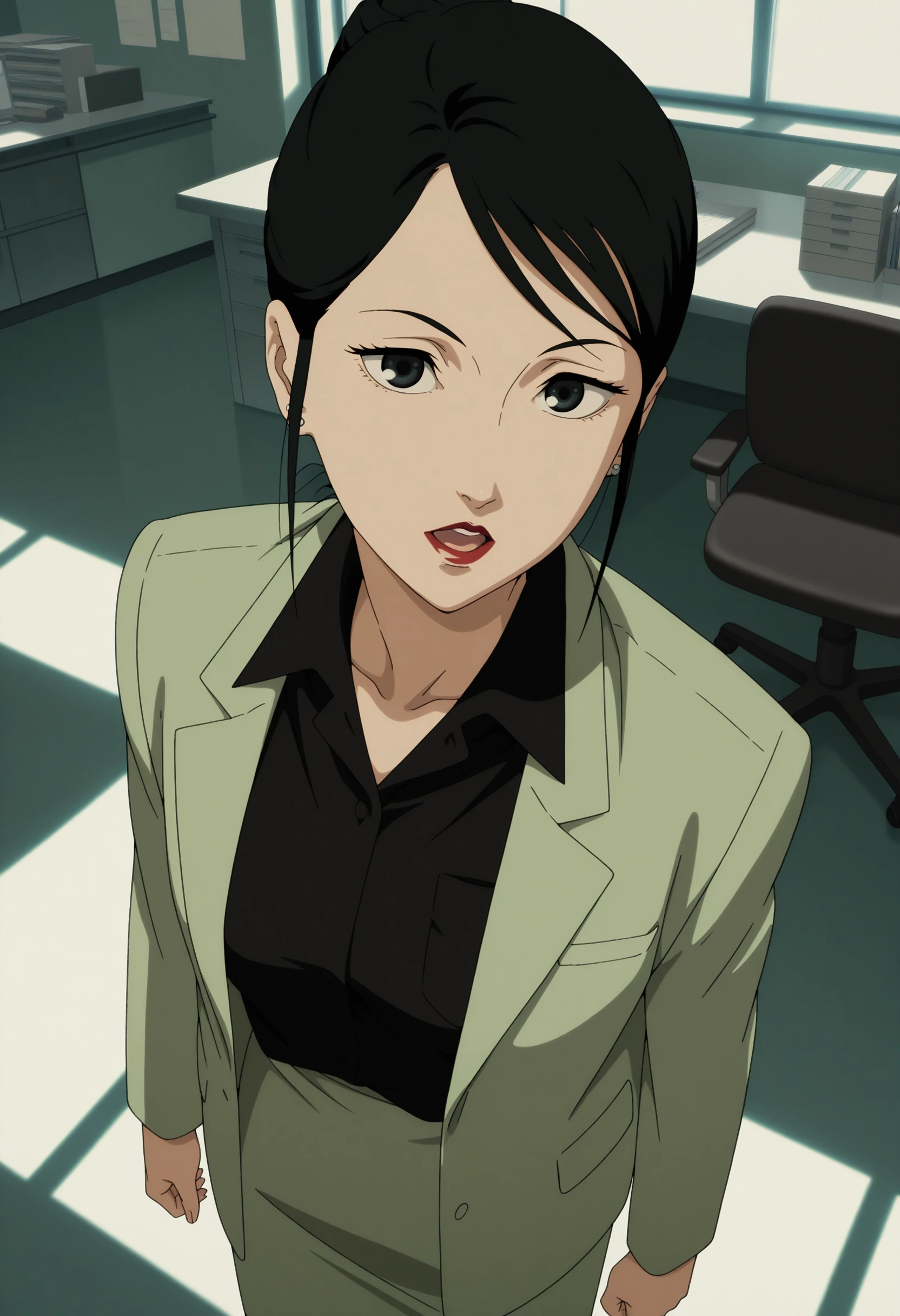 AtsukoChiba, 1girl, black hair, lipstick, red lips, hair bun, earrings,