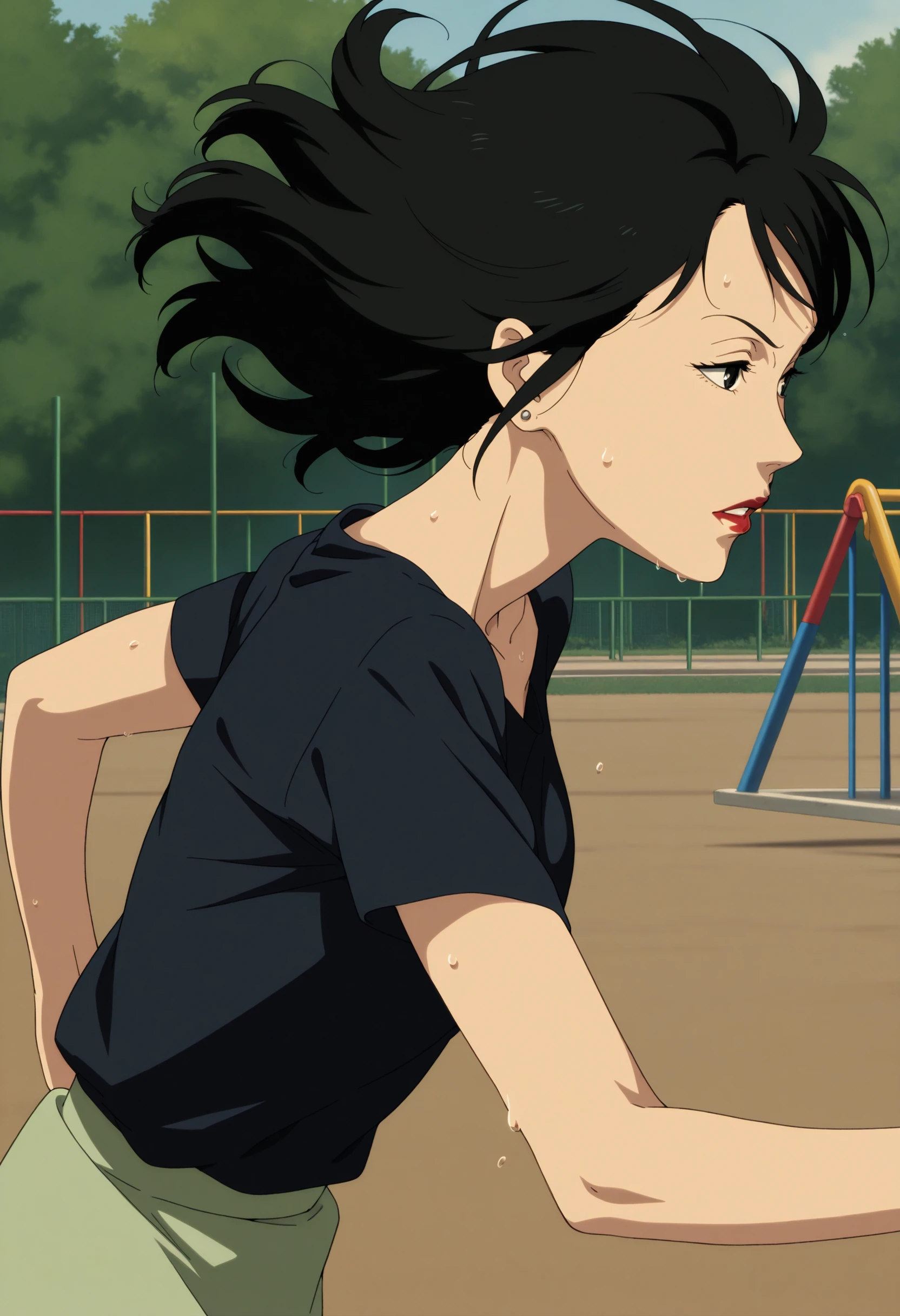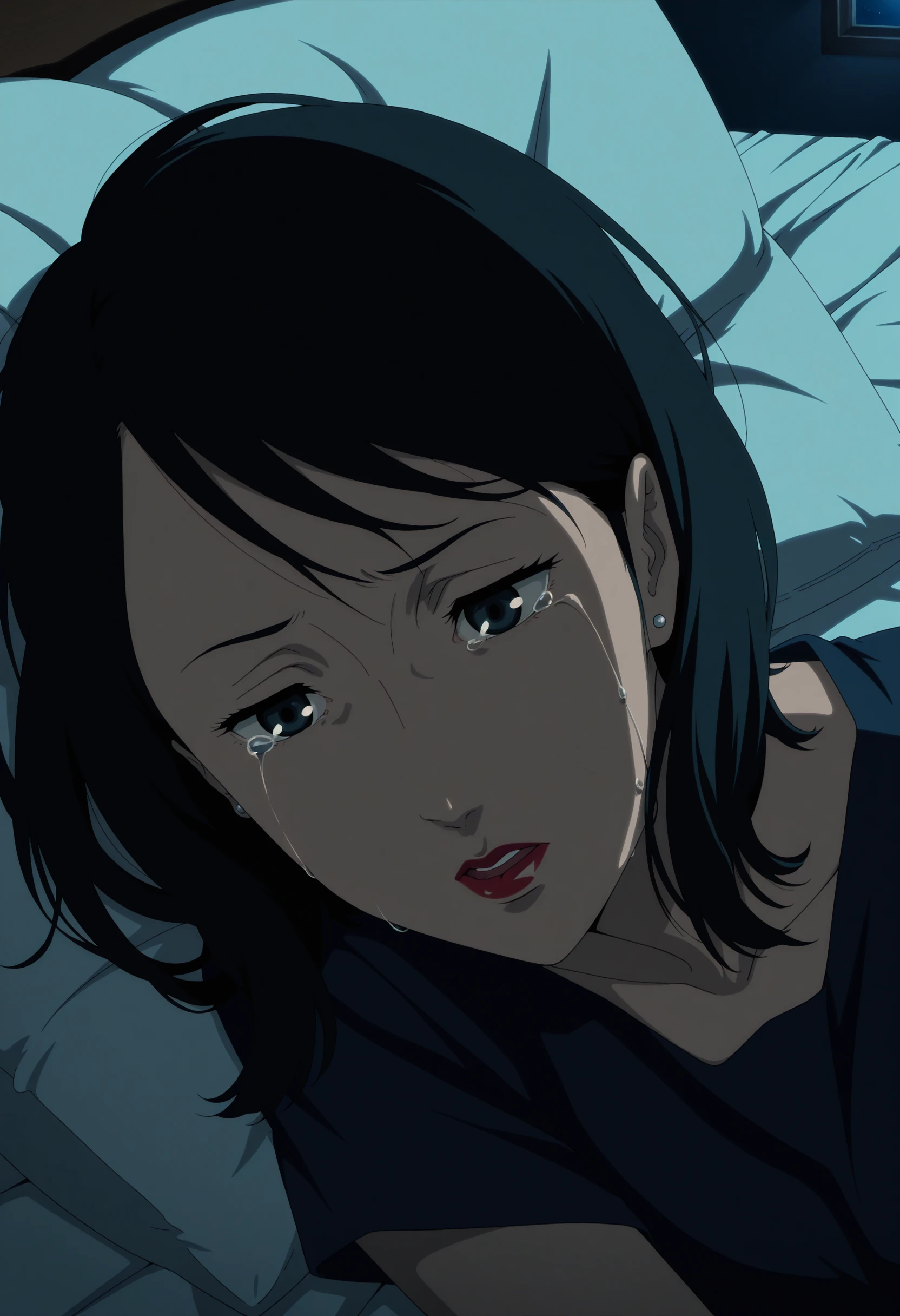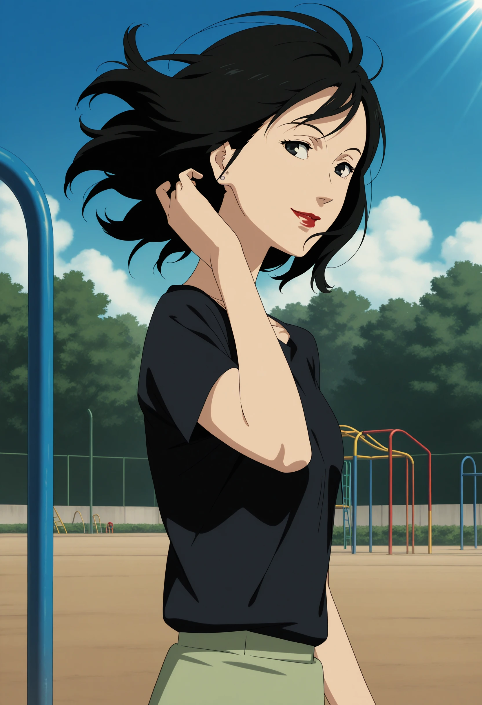 AtsukoChiba, 1girl, black hair, lipstick, red lips, hair bun, earrings,