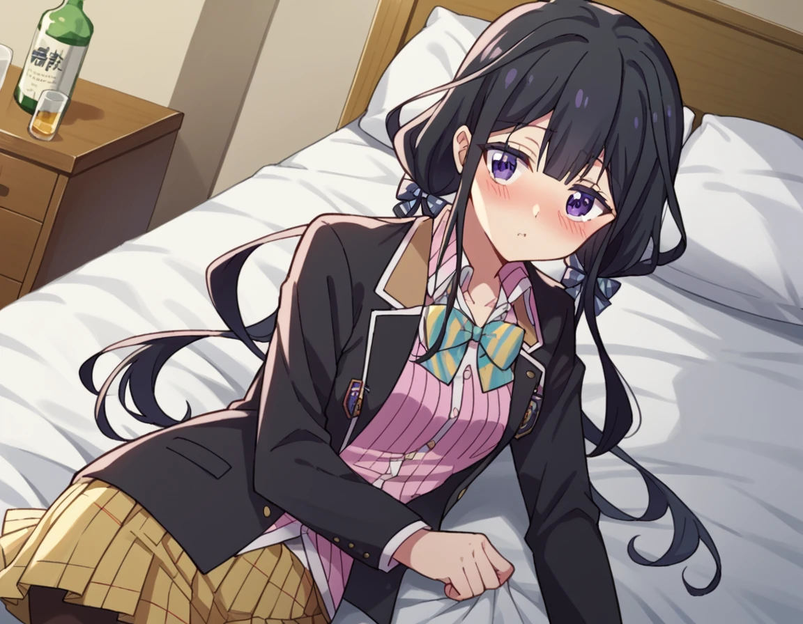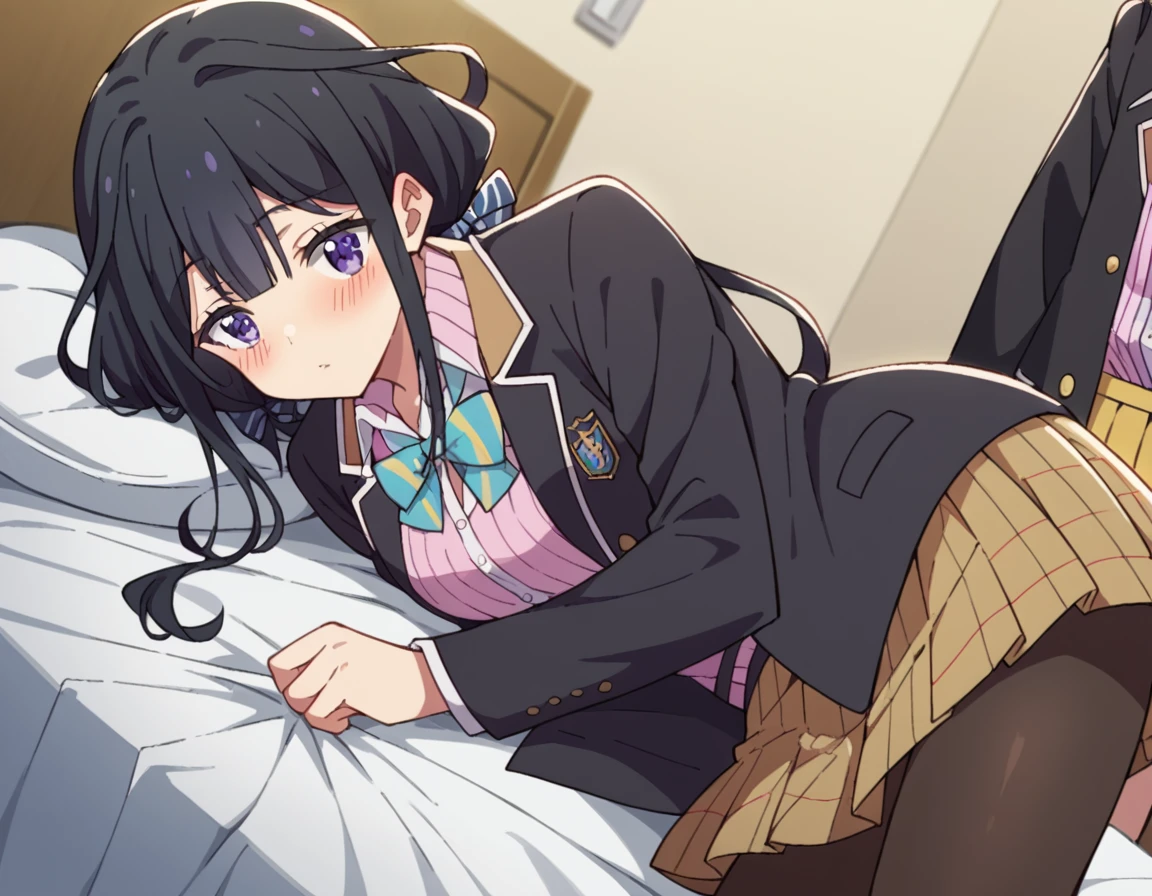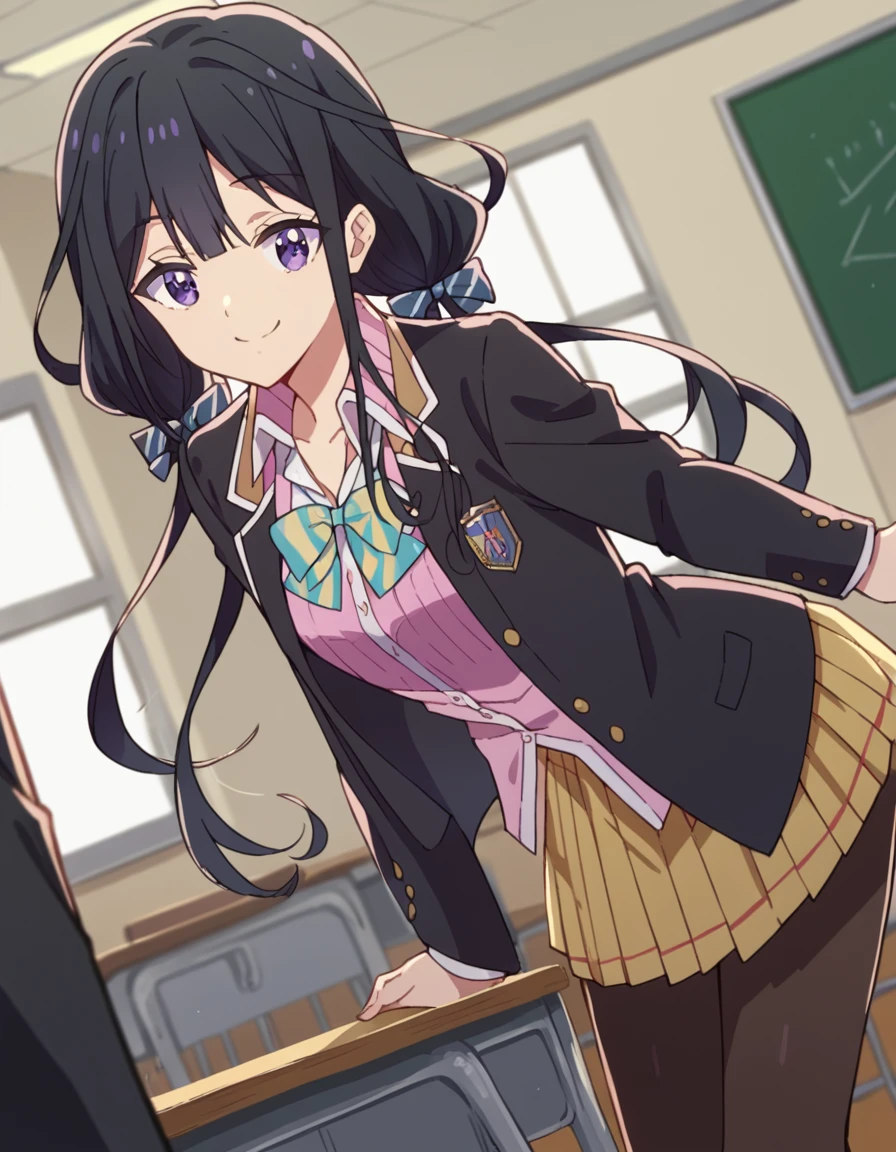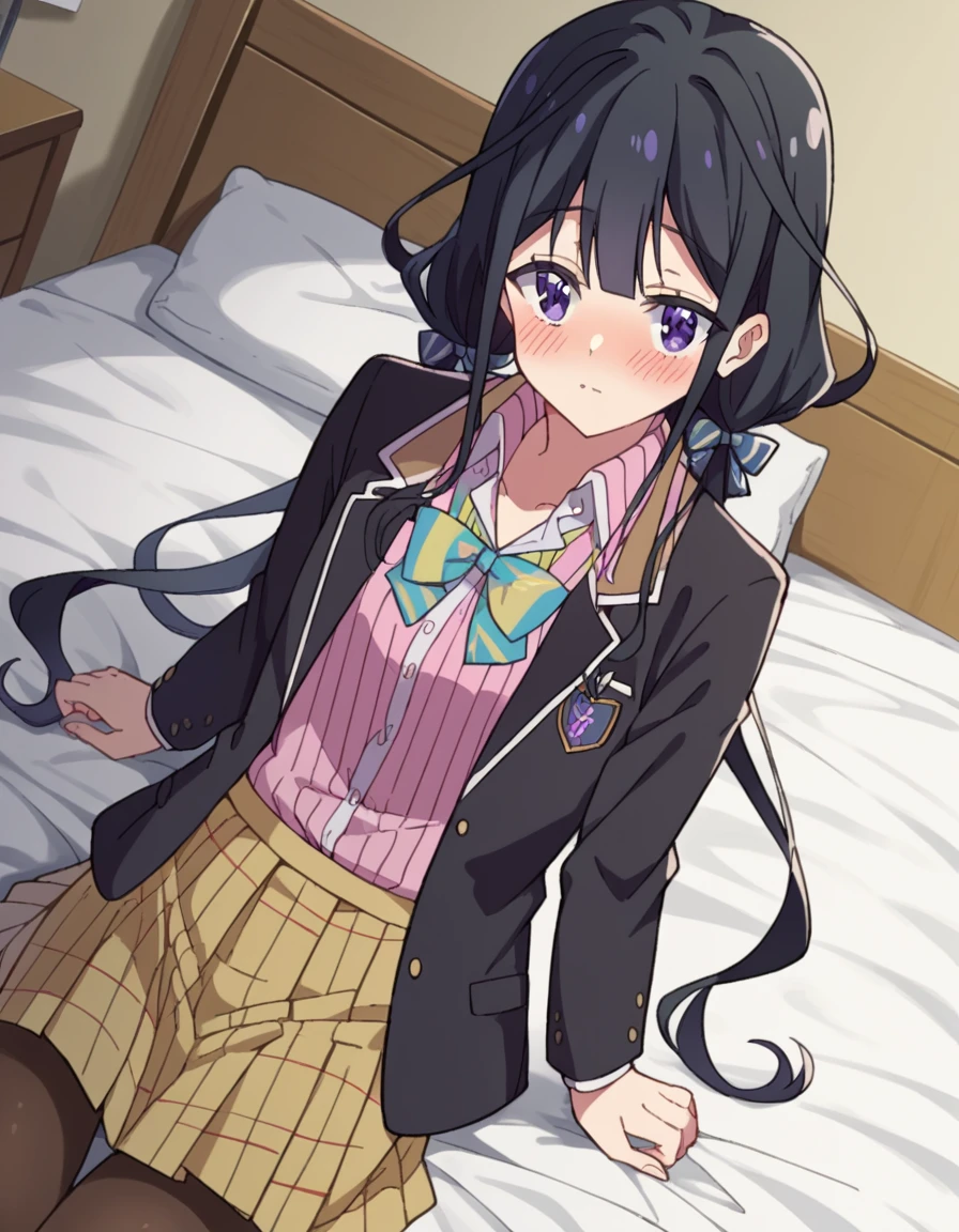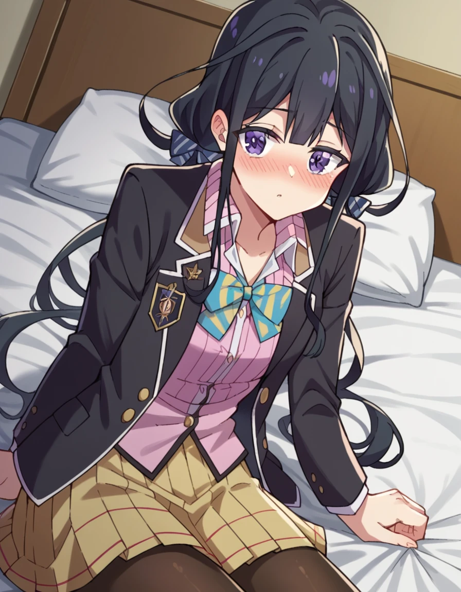 skirt, shirt, long sleeves, bow, school uniform, jacket, white shirt, pantyhose, pleated skirt, open clothes, striped, collared shirt, bowtie, open jacket, black jacket, blazer, pink shirt, brown skirt, striped bow, yellow skirt,