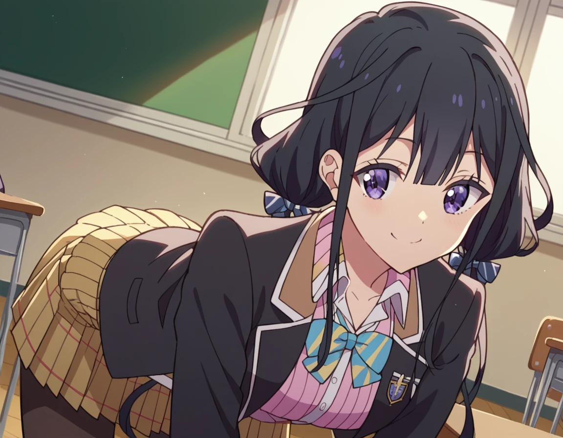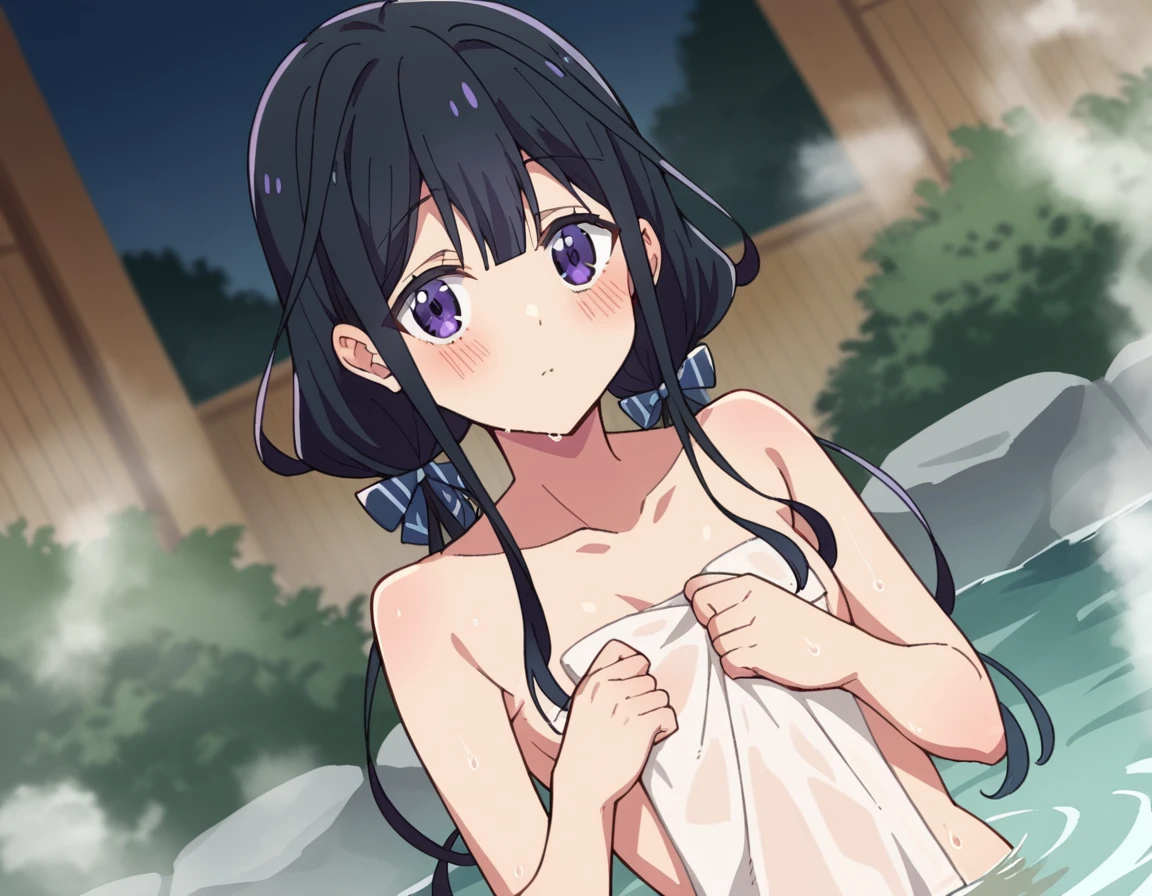 aki adagaki, long hair, bangs, black hair, purple eyes, twintails, hair bow,