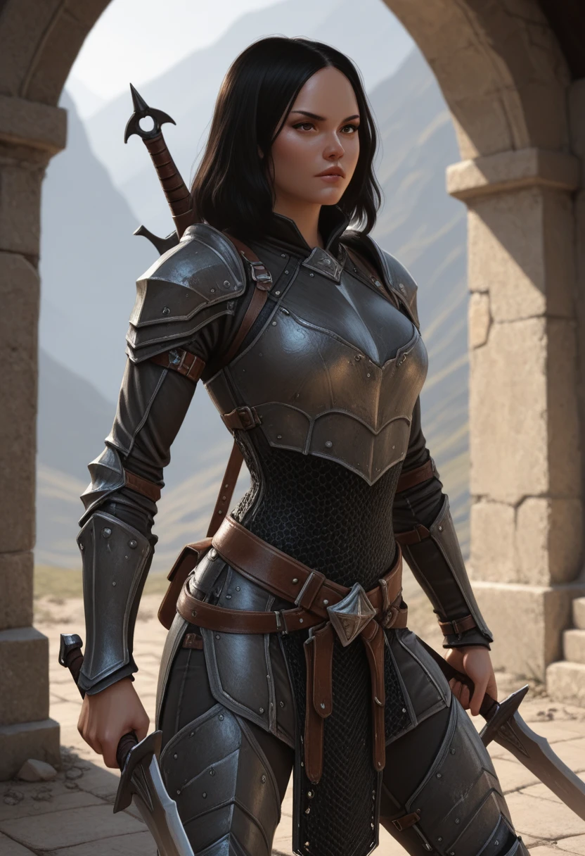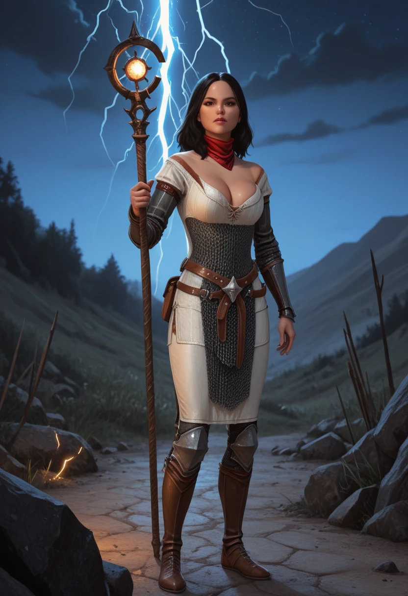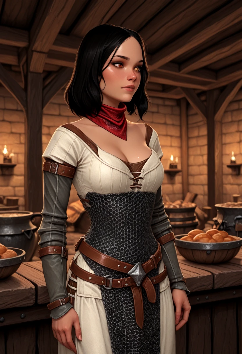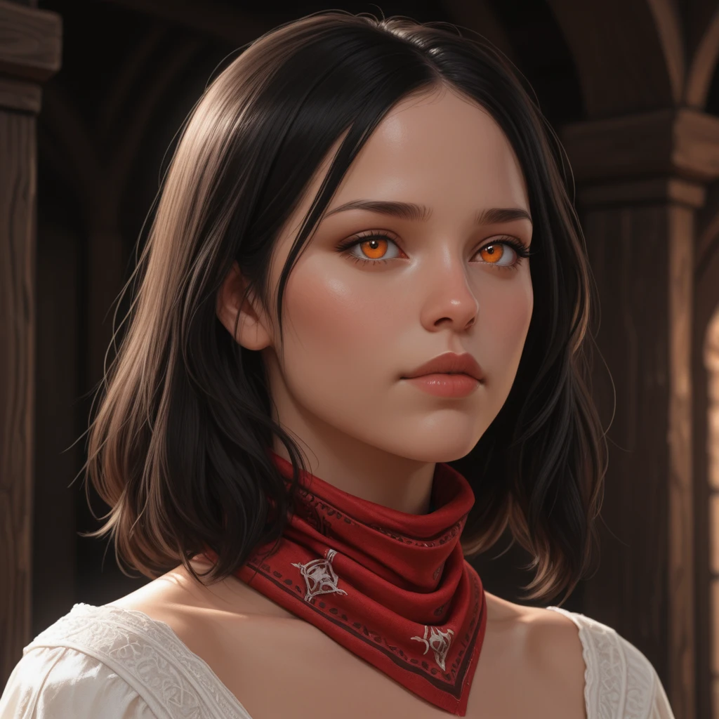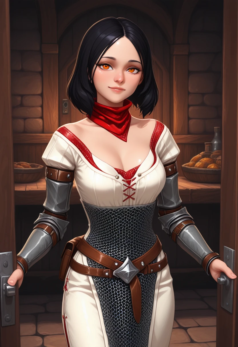 Default look: b3thany, 1girl, solo, red scarf, dark hair, white dress, chainmail