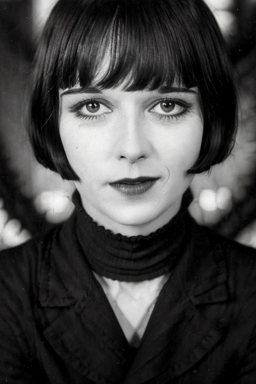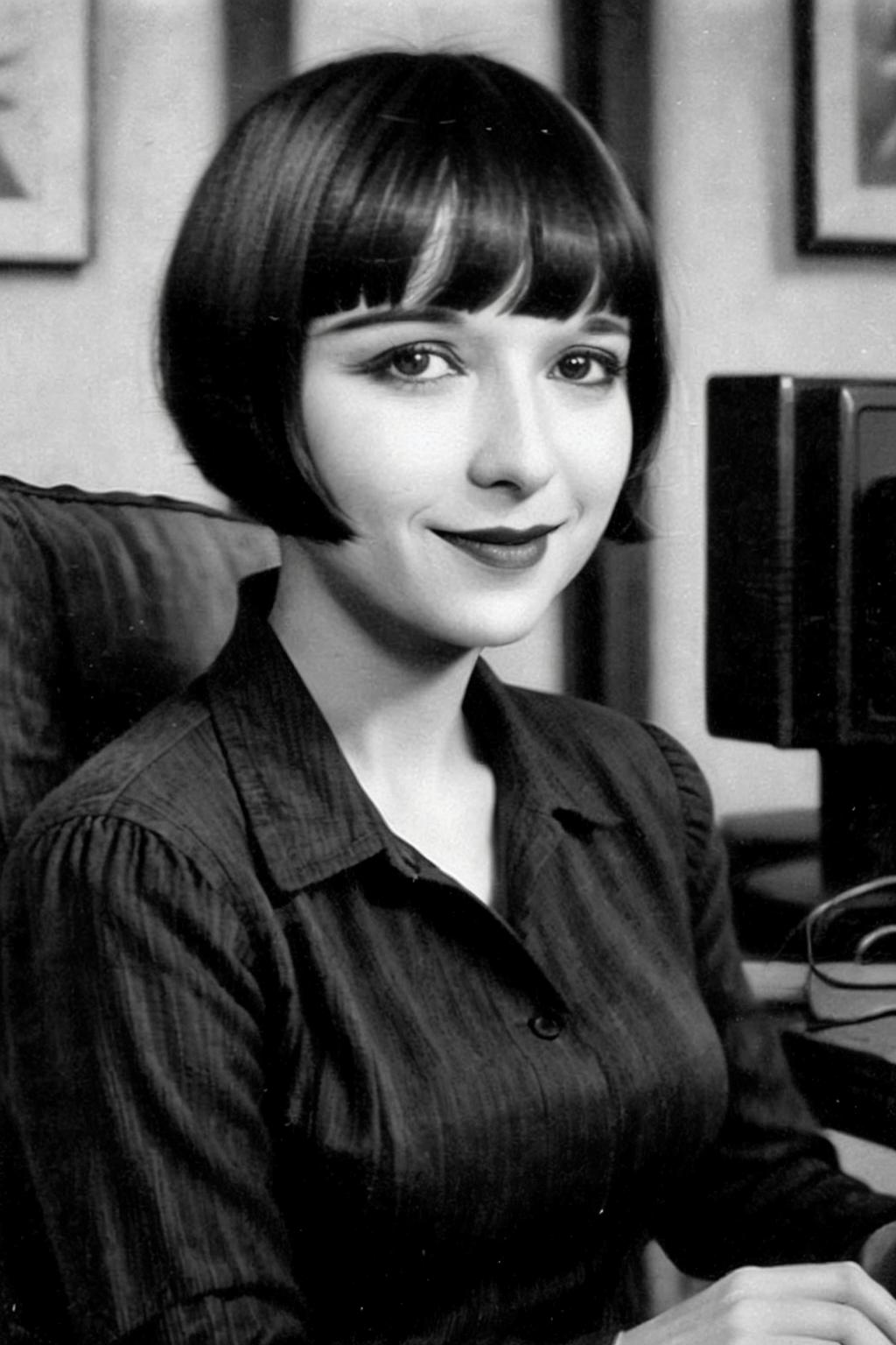 Silver Screen Starlet Louise Brooks. Quintessential flapper. Seems to work well without the trigger word, but, that's what it's trained on. Trained with 20 black and white images, but, works well with color.