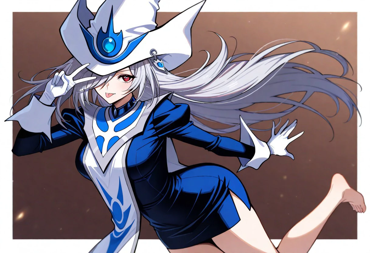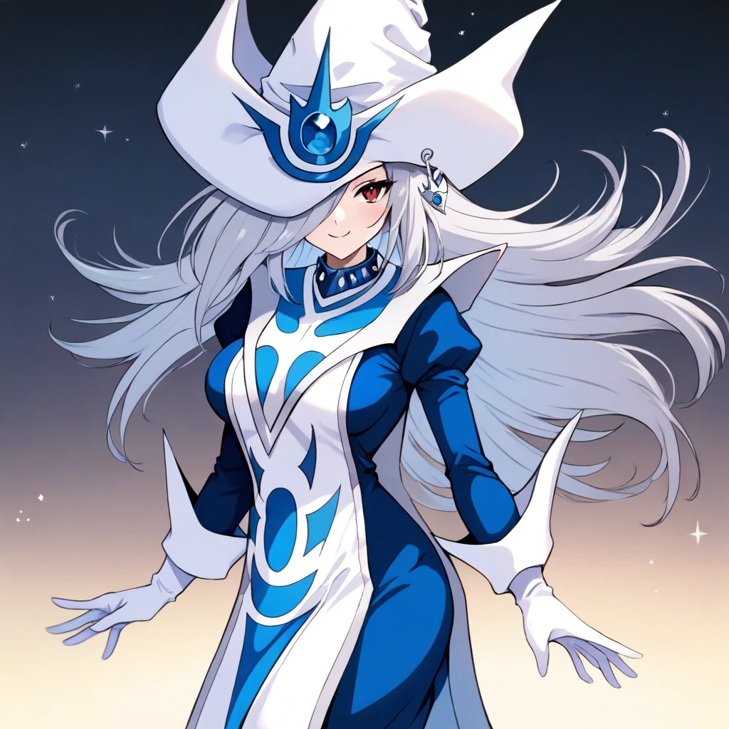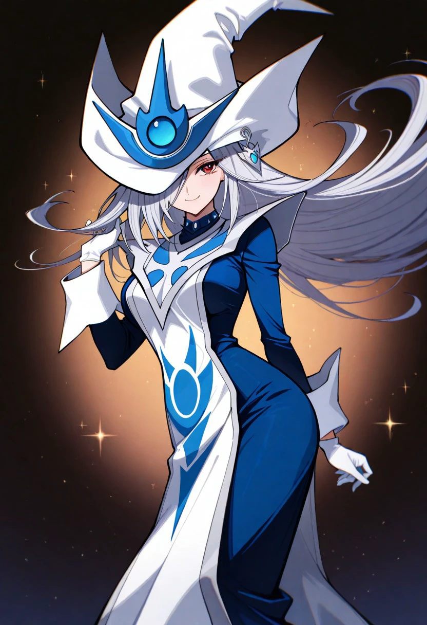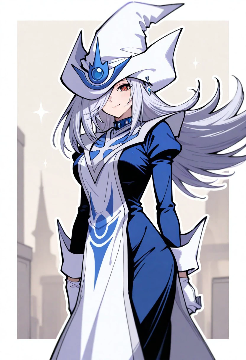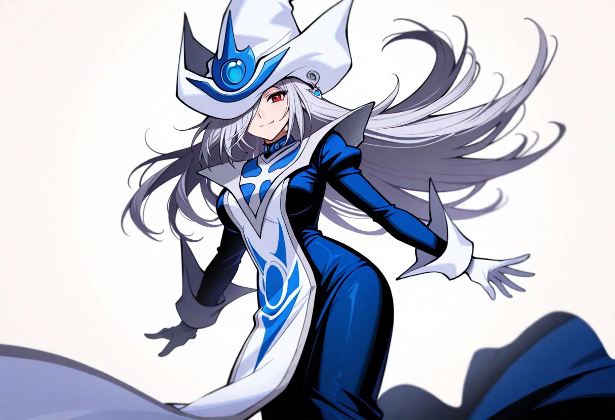 1girl, solo, SilentMagicianOG, long hair, silver hair, swept bang, red eyes, medium breasts, SiMaZero, white and blue tabard with gold trim, very long dress, blue dress, white gloves with gold trim, gold trim, puffy sleeves, white and blue hat with gold trim, wizard hat, metal choker