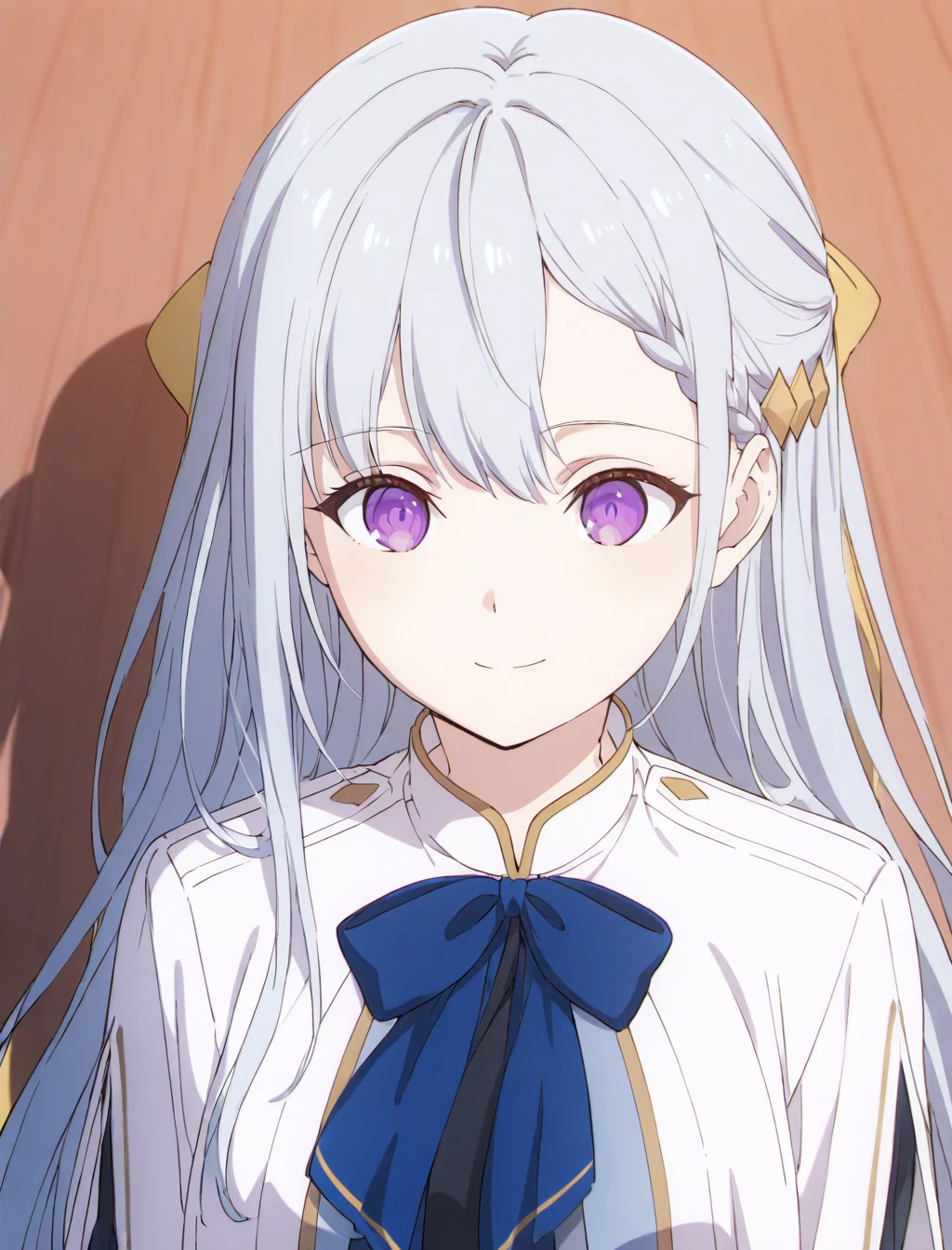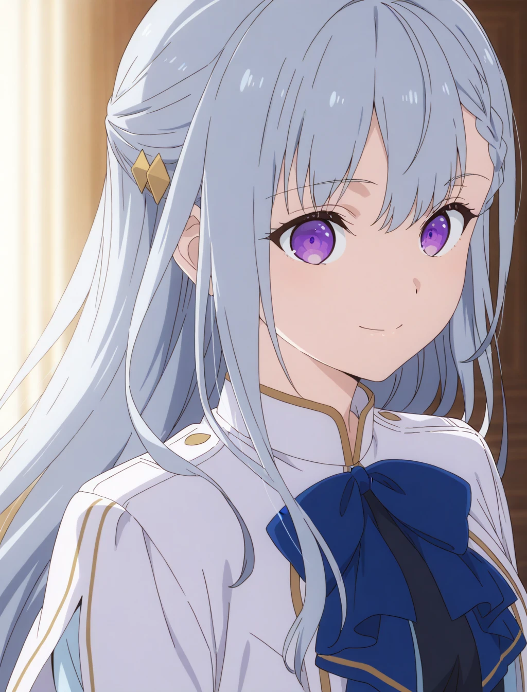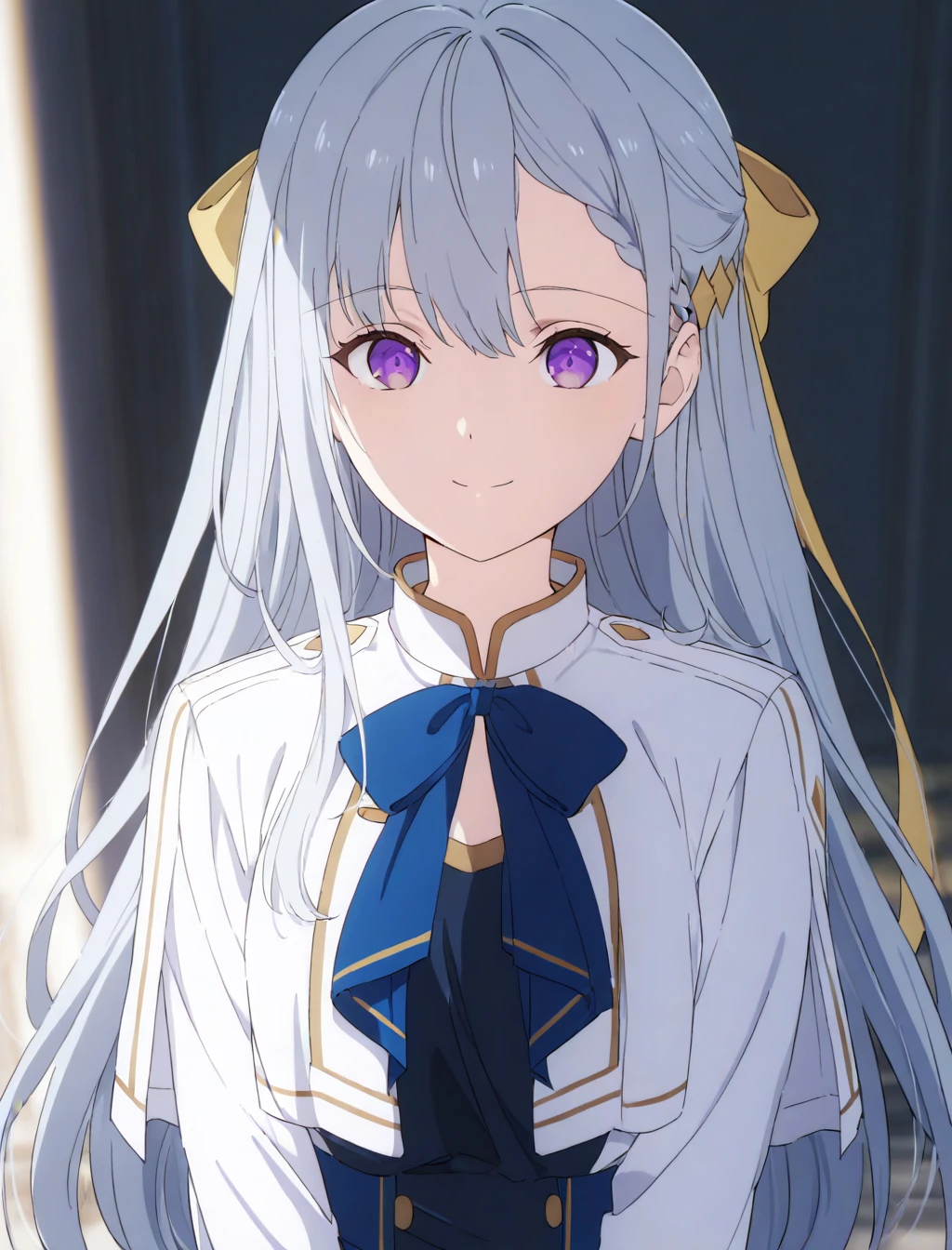 euphyllia_magenta, 1girl, solo, pantyhose, purple eyes, long hair, skirt, braid, blue skirt, bow, black footwear, long sleeves, frills, baseoutfit