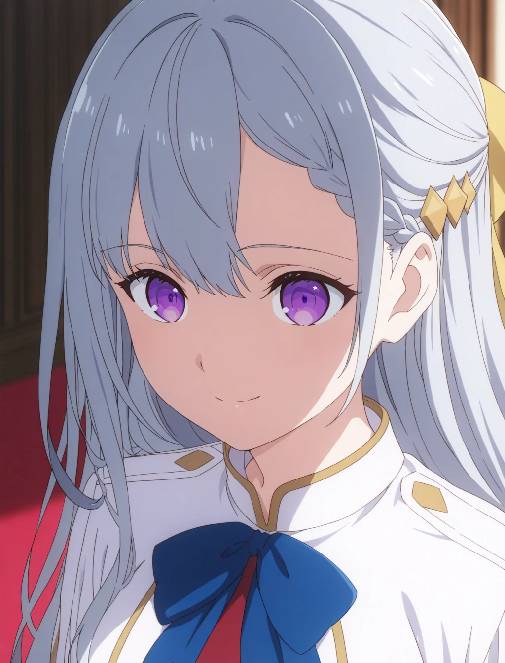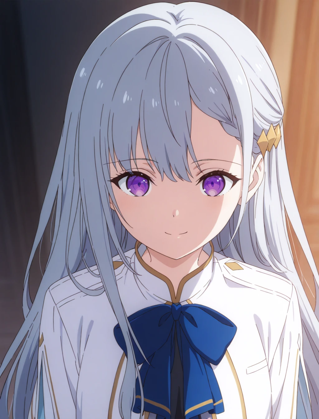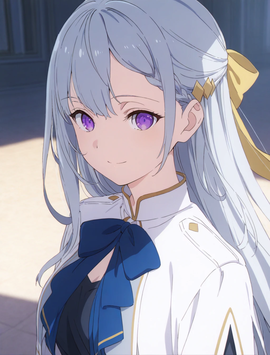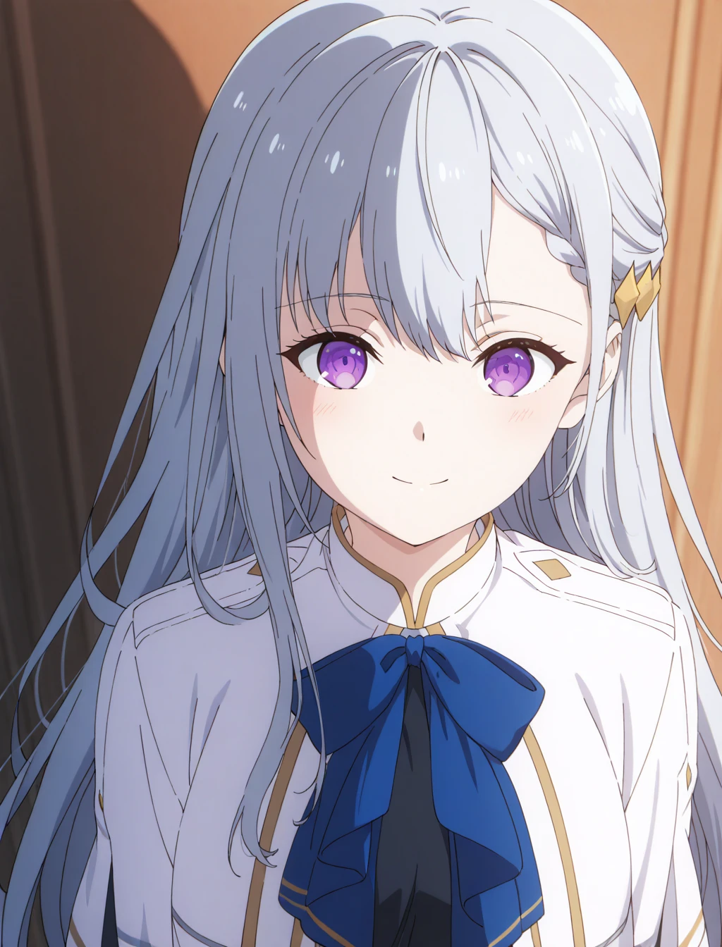 euphyllia_magenta, 1girl, solo, pantyhose, purple eyes, long hair, skirt, braid, blue skirt, bow, black footwear, long sleeves, frills, baseoutfit