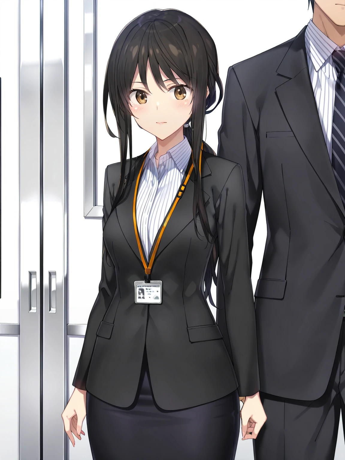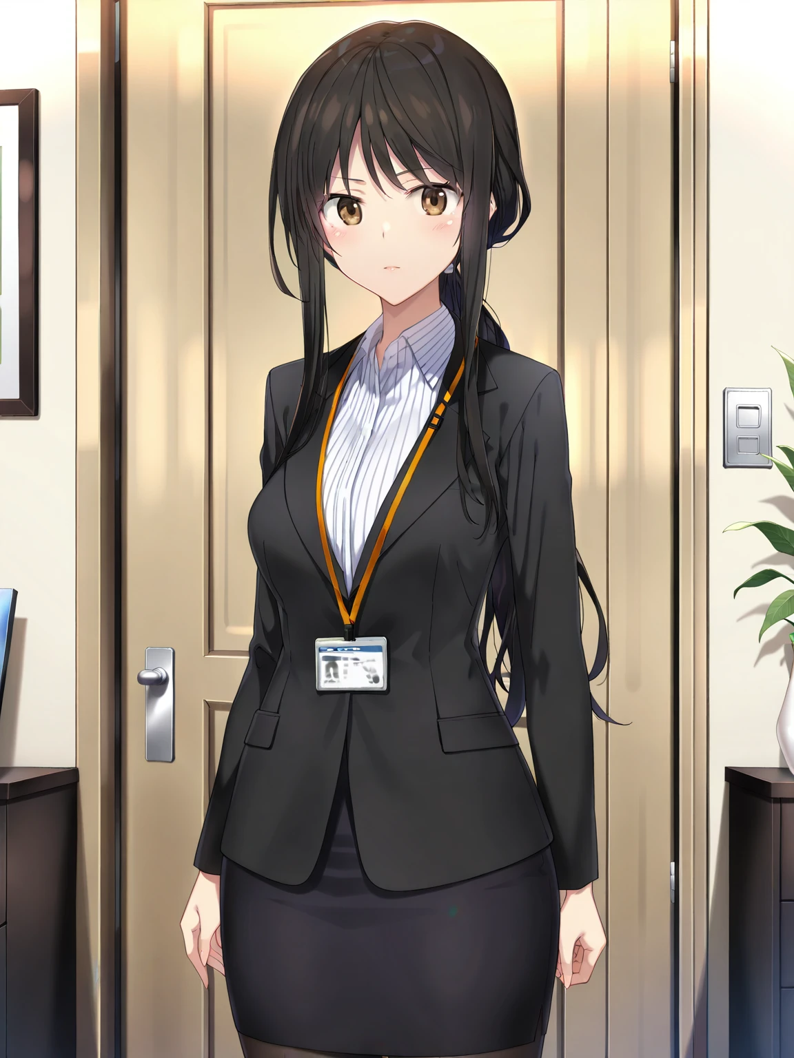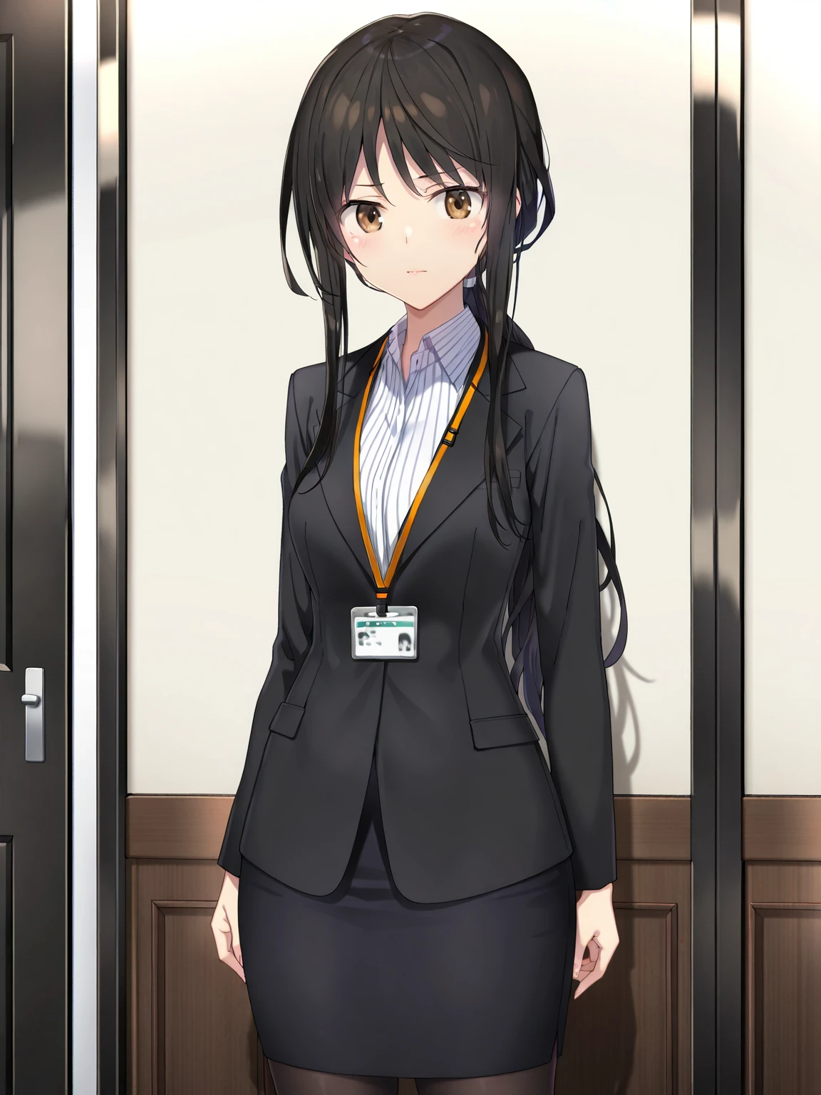 MINAMI TSUBAME,black hair,brown eyes,bangs,sidelocks,ponytail,low ponytail,suit,shirt,skirt,pencil skirt,black skirt,pantyhose,black legwear,formal,id card,