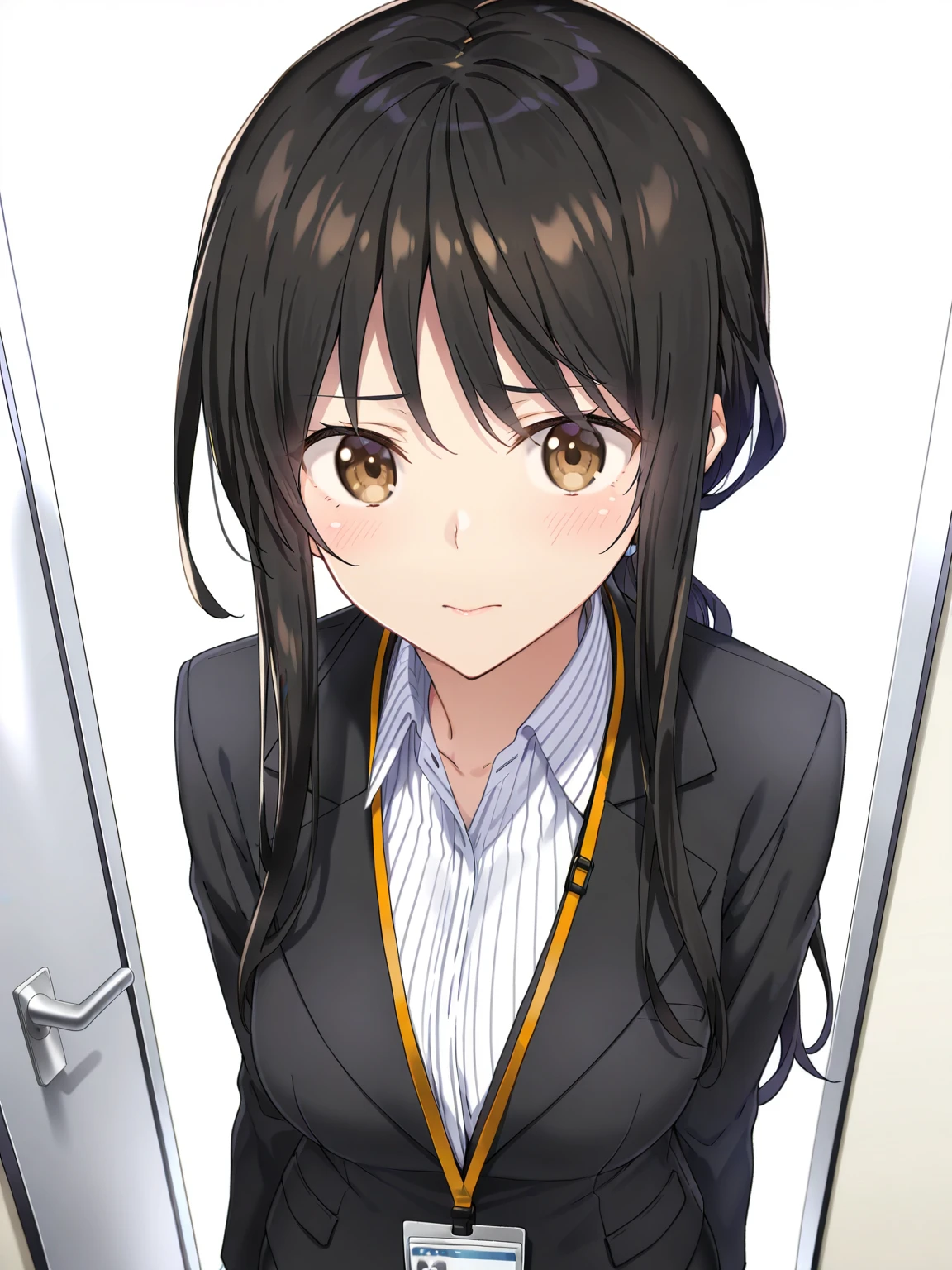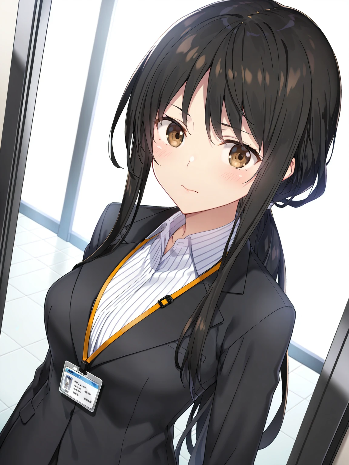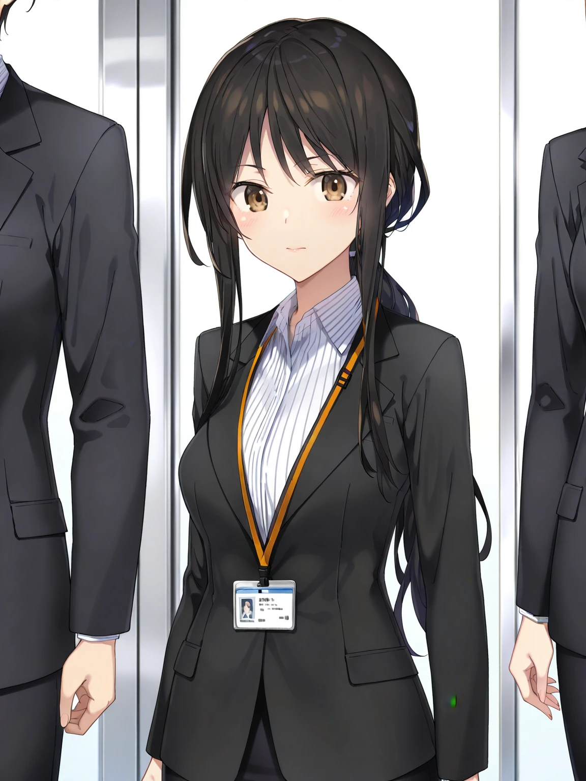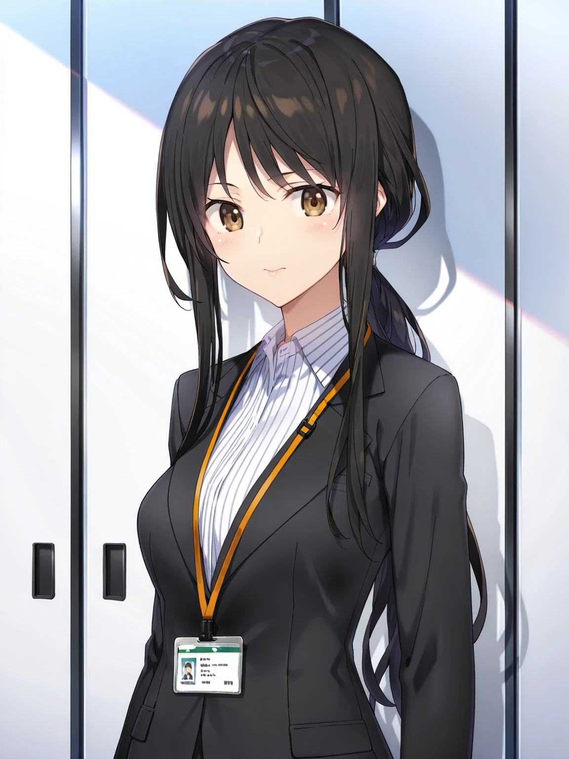 MINAMI TSUBAME,black hair,brown eyes,bangs,sidelocks,ponytail,low ponytail,suit,shirt,skirt,pencil skirt,black skirt,pantyhose,black legwear,formal,id card,