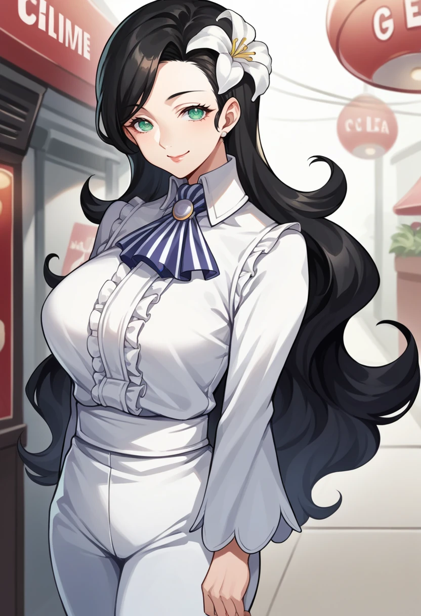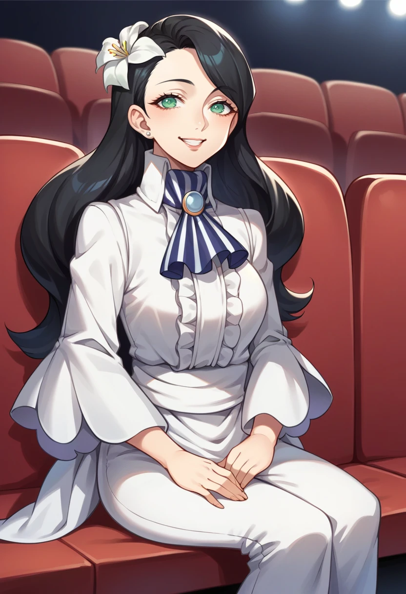 nagipq2, very long hair, black hair, green eyes, hair flower, shirt, ascot, long sleeves, puffy sleeves, pants, knee boots, mature female