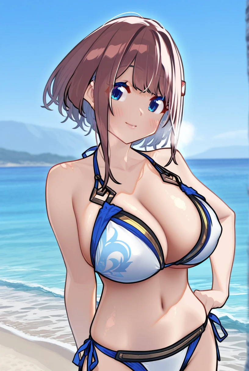 1girl, hitoyo_baffu, short brown girl, blue eyes, large breasts,