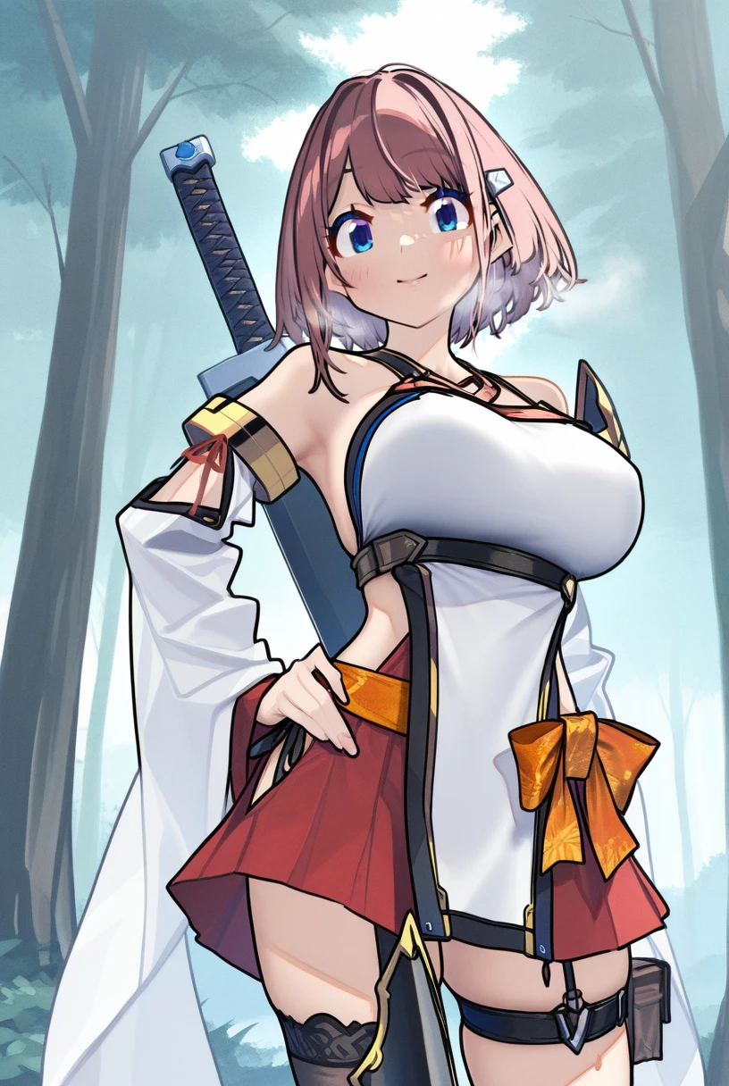 For her main outfit, oft_1_main, bare shoulders, detached sleeves, sword behind back, long sleeves, red skirt, single thighhigh, thigh strap, thighhighs,