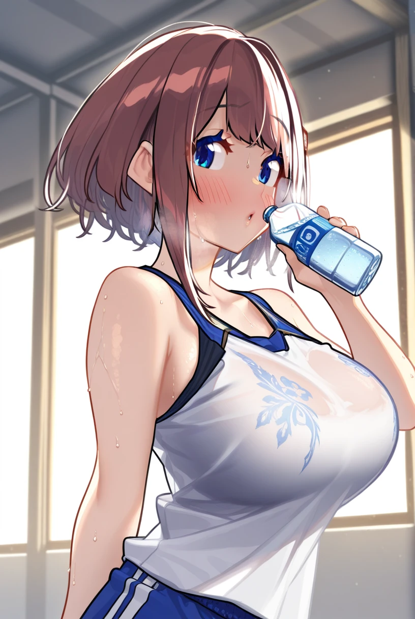 hitoyo_baffu, short brown girl, blue eyes, large breasts,