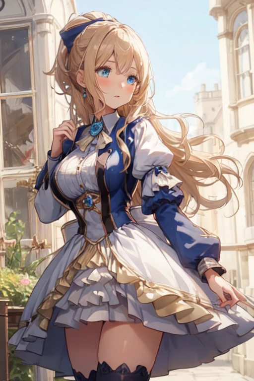 MaricaBellerose, 1girl, solo, long hair, blue eyes, skirt, blonde hair, large breasts, blue thighhighs, long sleeves, dress, bow, ponytail, hair bow, frills, puffy sleeves, brooch,