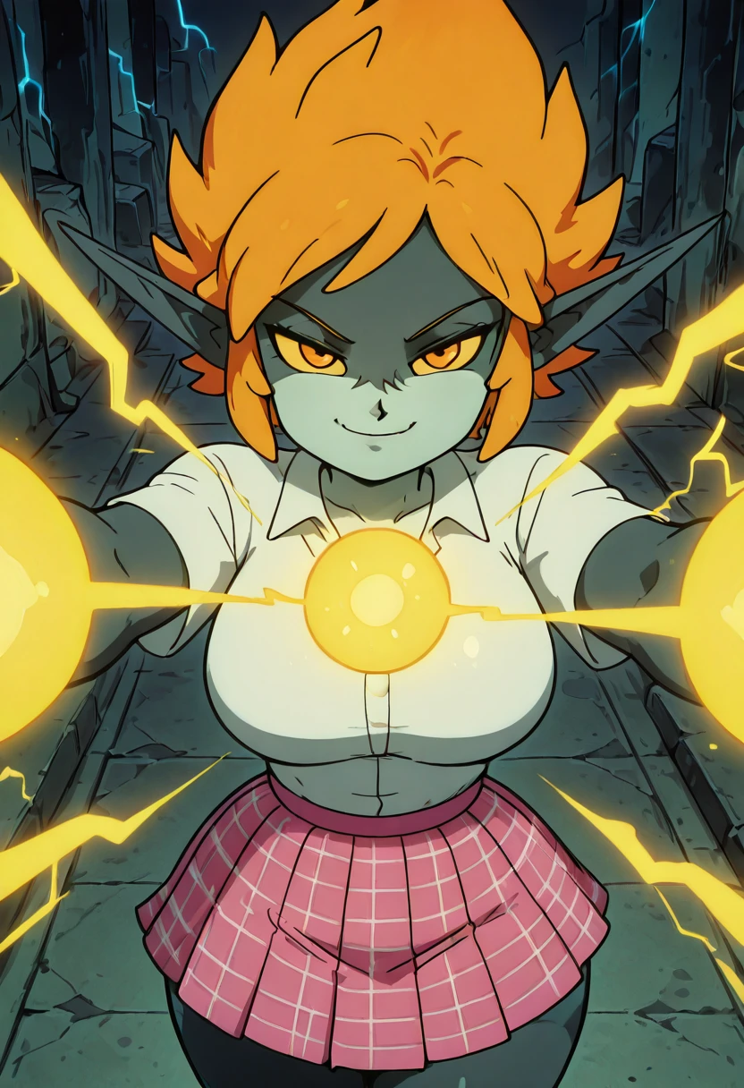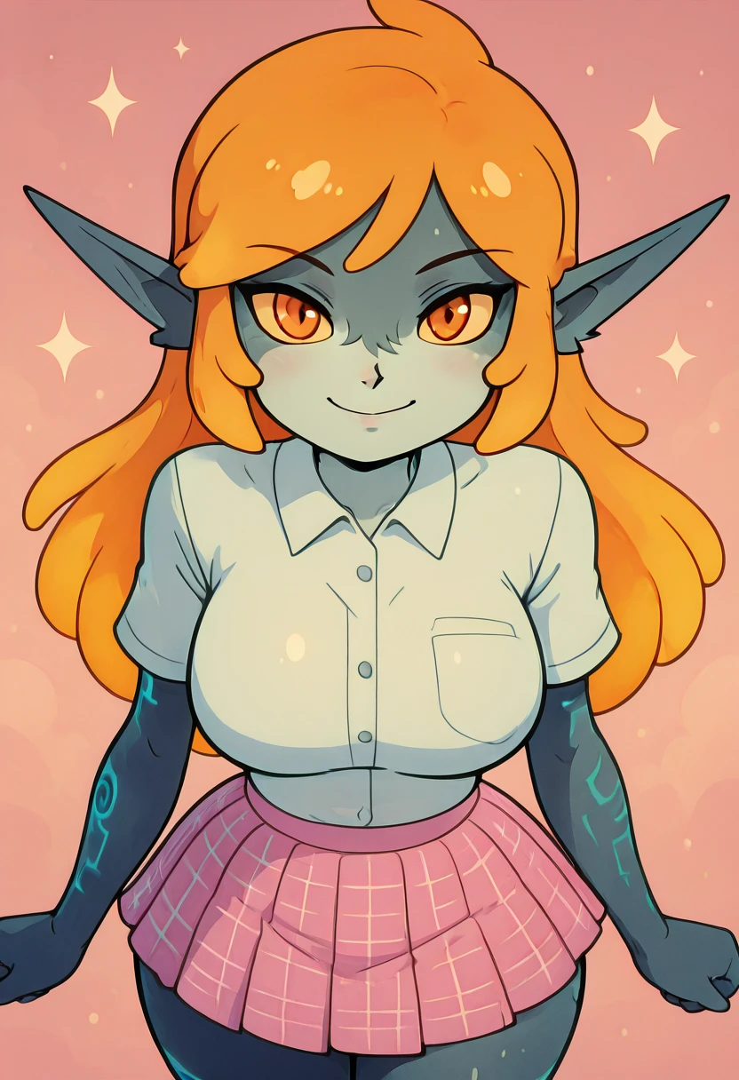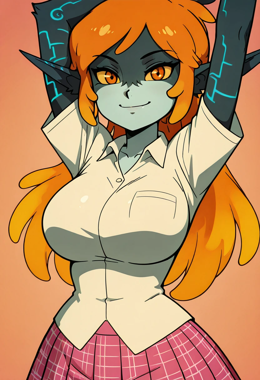 zzMidnaCitron, orange eyes, yellow sclera, multicolored skin, pointy ears, orange hair, white shirt, collared shirt, plaid skirt, pink skirt, pleated skirt, large breasts, narrow waist, wide hips,
