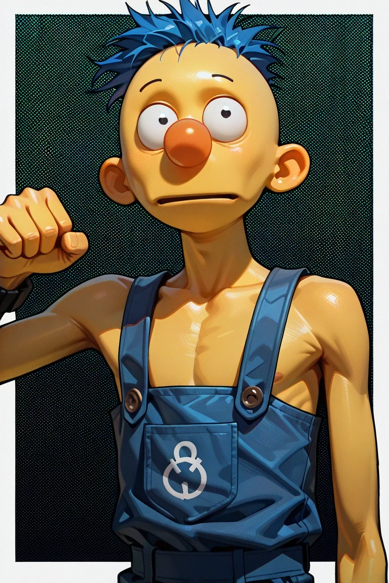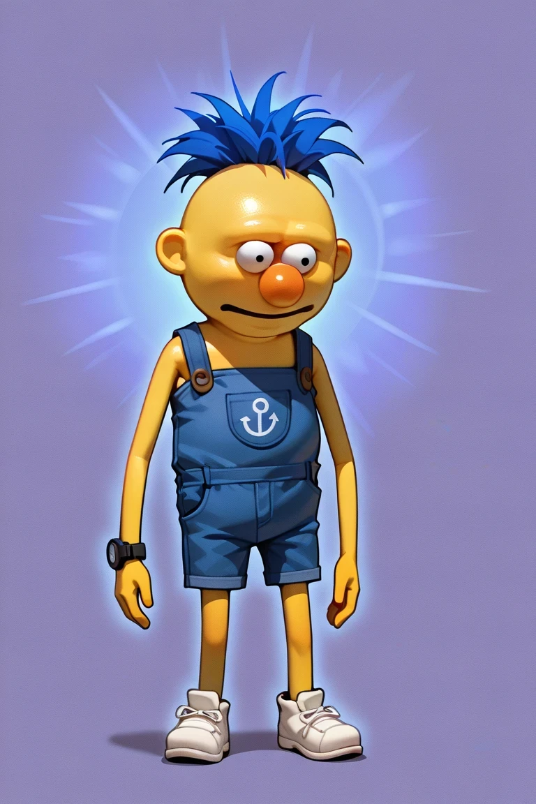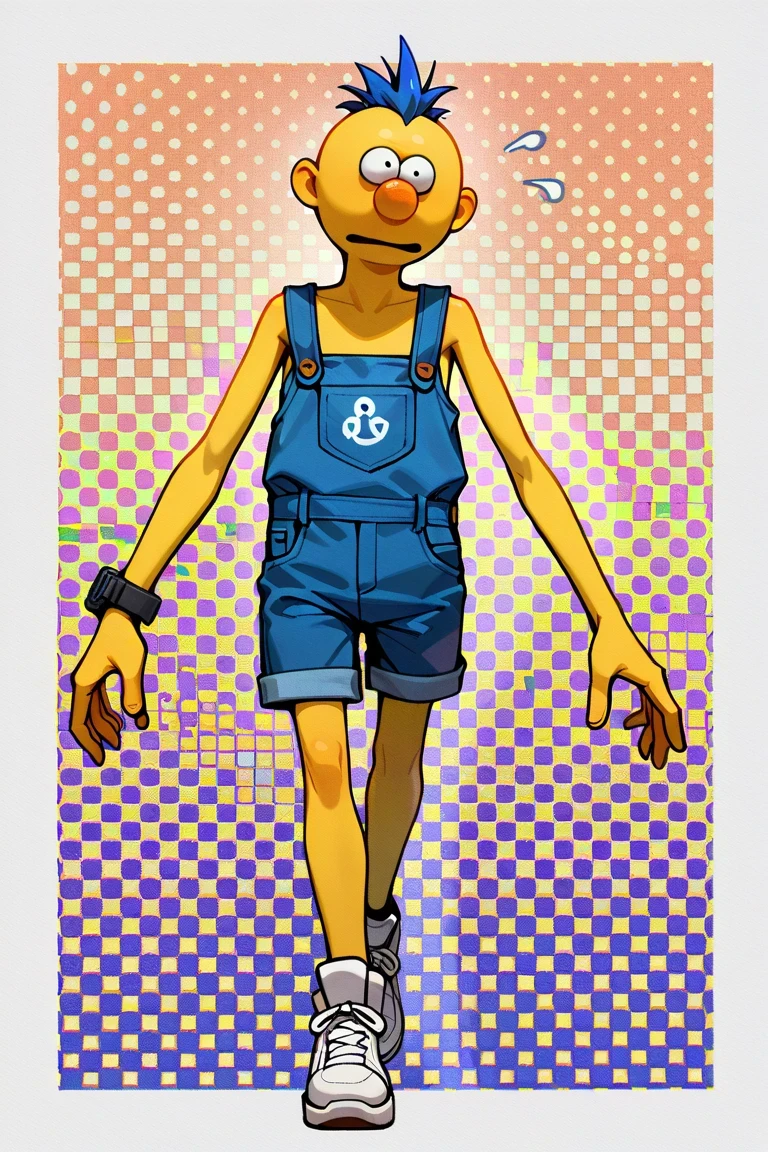 YellowGuyDHMIS, 1boy, bright yellow skin, round features, expressive wide black eyes, spiky blue hair, blue overalls with a "D" Symbol, brown buttons, white shoes, lanky limbs, orange nose, black watch on left hand, bald,