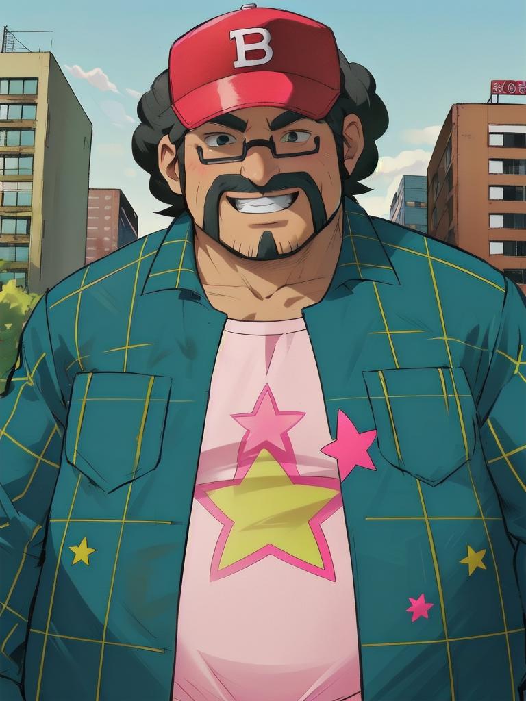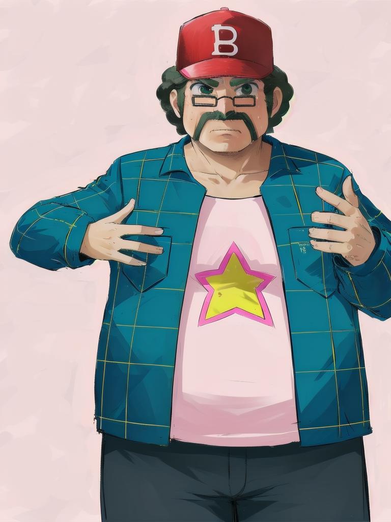 prompt : sidney_manson,baseball cap, aqua jacket, red headwear, mustache, checkered jacket, pink shirt, star print shirt, black eyes, plump, glasses, fat man,grin, ash ketchum
