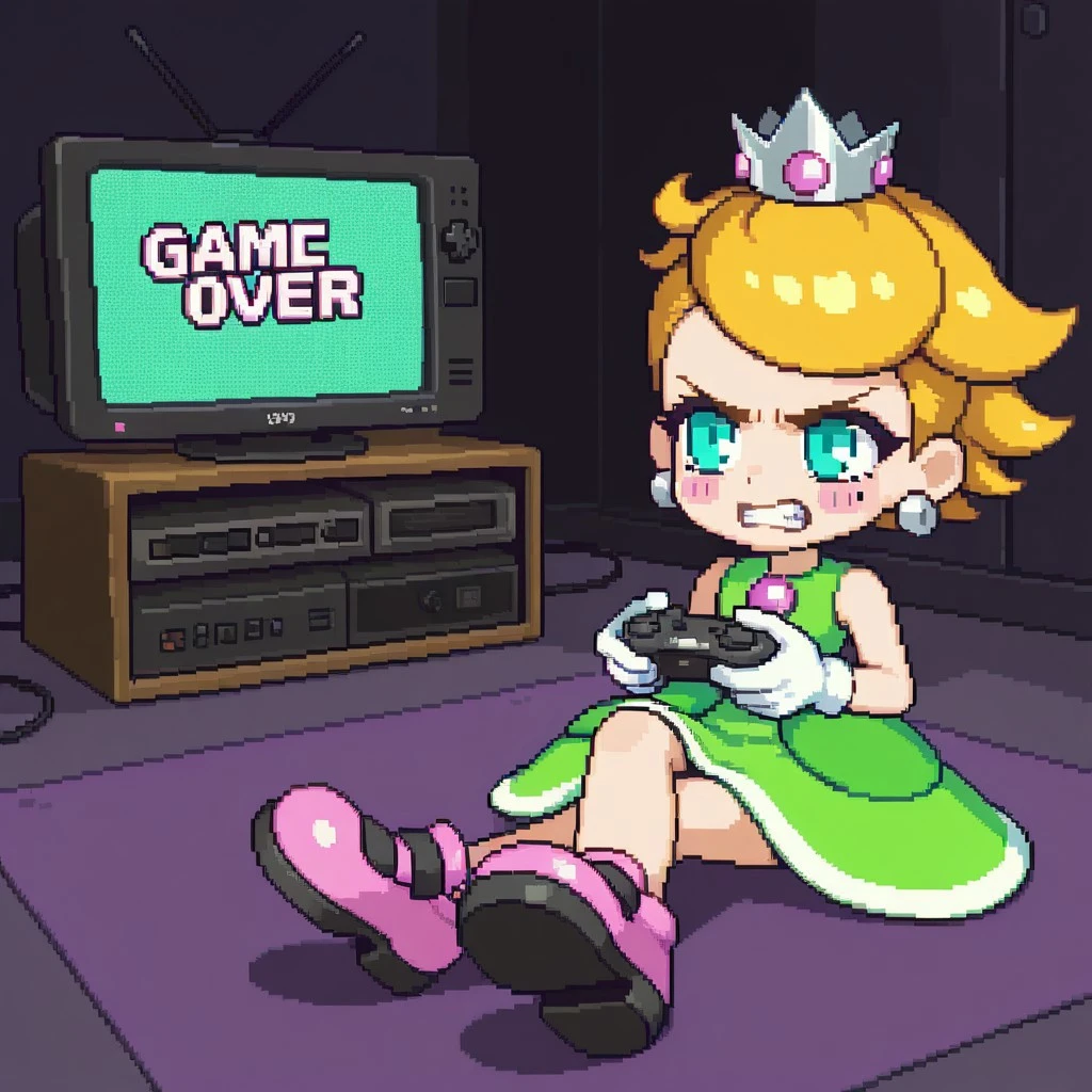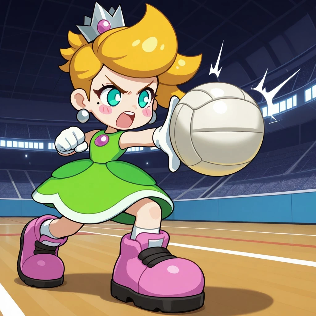 PrincessCharm, aqua eyes, blonde hair, short hair, mole under eye, crown, blush stickers, green dress, sleeveless, white gloves, earrings, pink footwear,