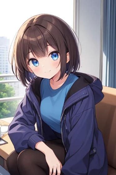 dark blue jacket, purple shirt, blue eyes, short hair, dark brown hair