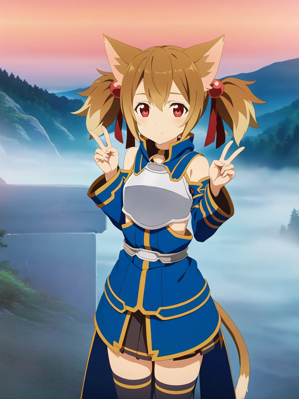 ALO Outfit: silicaalo, brown hair, short twintails, red eyes, cat ears, cat tail, armor, pleated skirt, thighhighs, bare shoulders, breastplate, hair ribbon