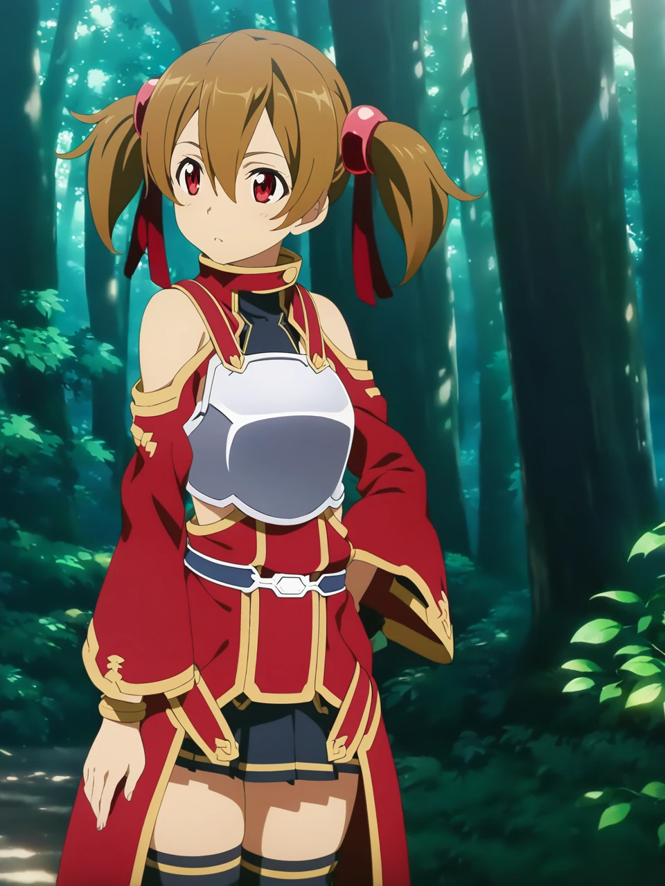 SAO Outfit: silicabase, brown hair, short twintails, red eyes, armor, pleated skirt, thighhighs, bare shoulders, breastplate, hair ribbon