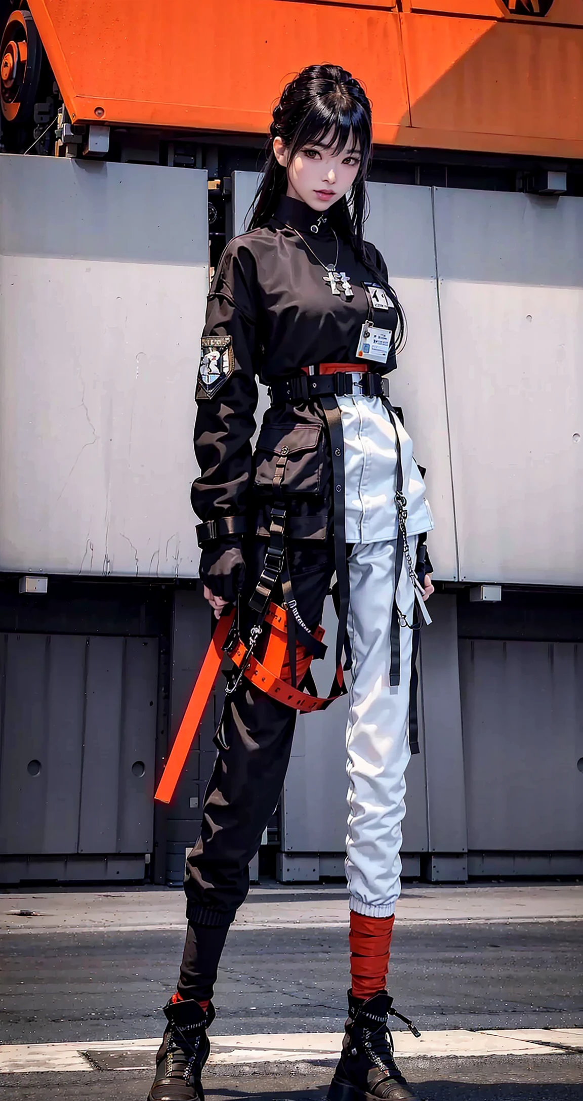 black techwear jacket and orange trousers with buckle and tape