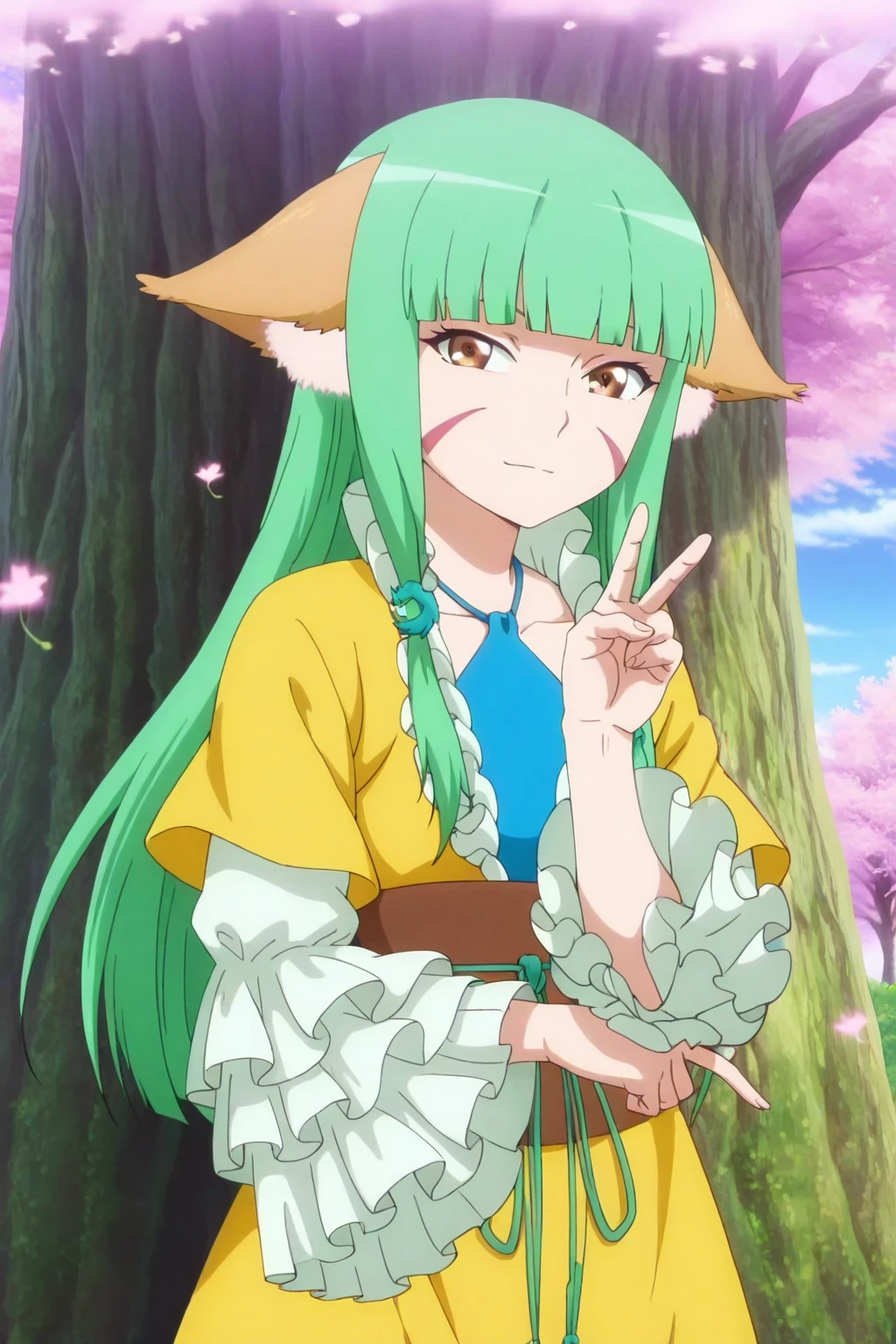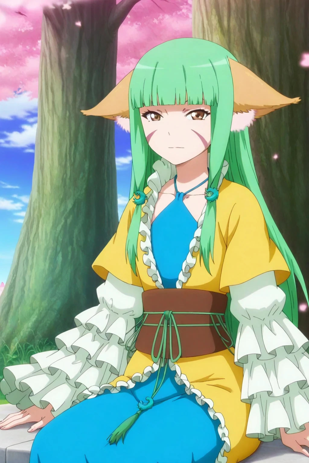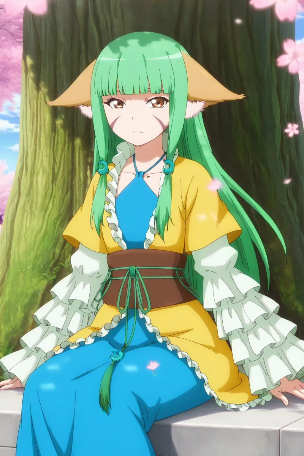1girl, solo, tushanrongrong, brown eyes, green hair, facial mark, animal ears, yellow robe, frilled sleeves, halterneck, sash, blue dress