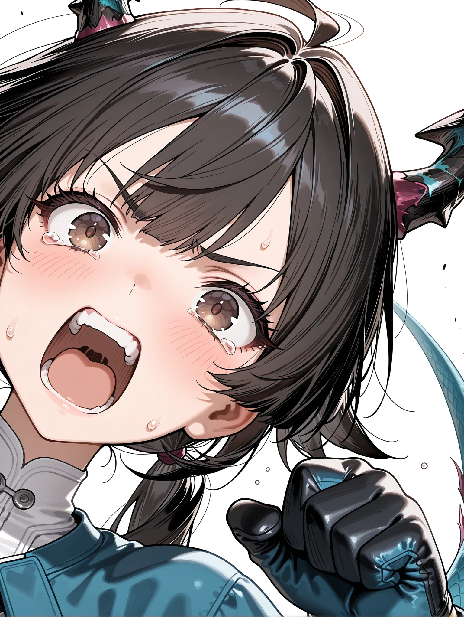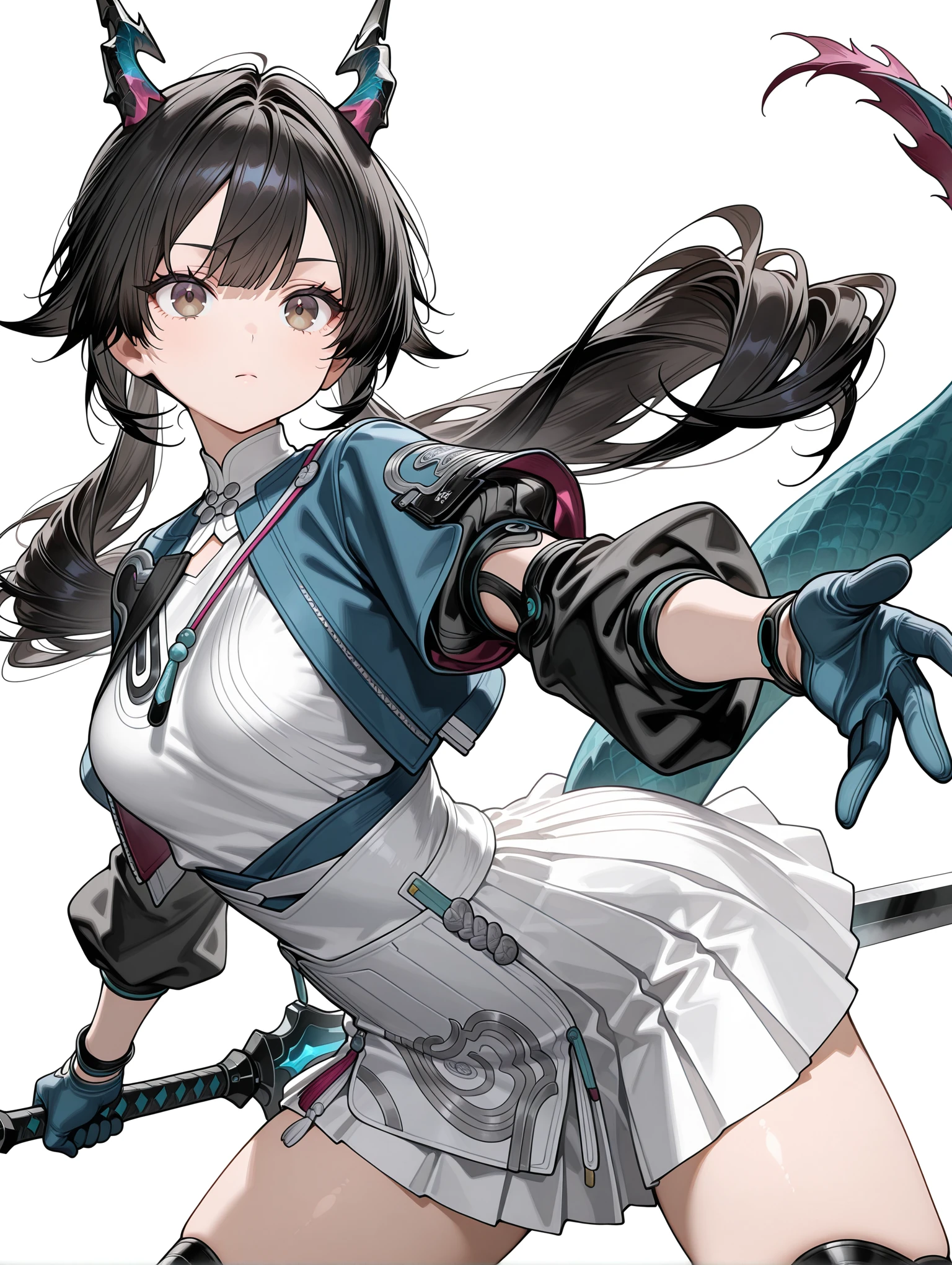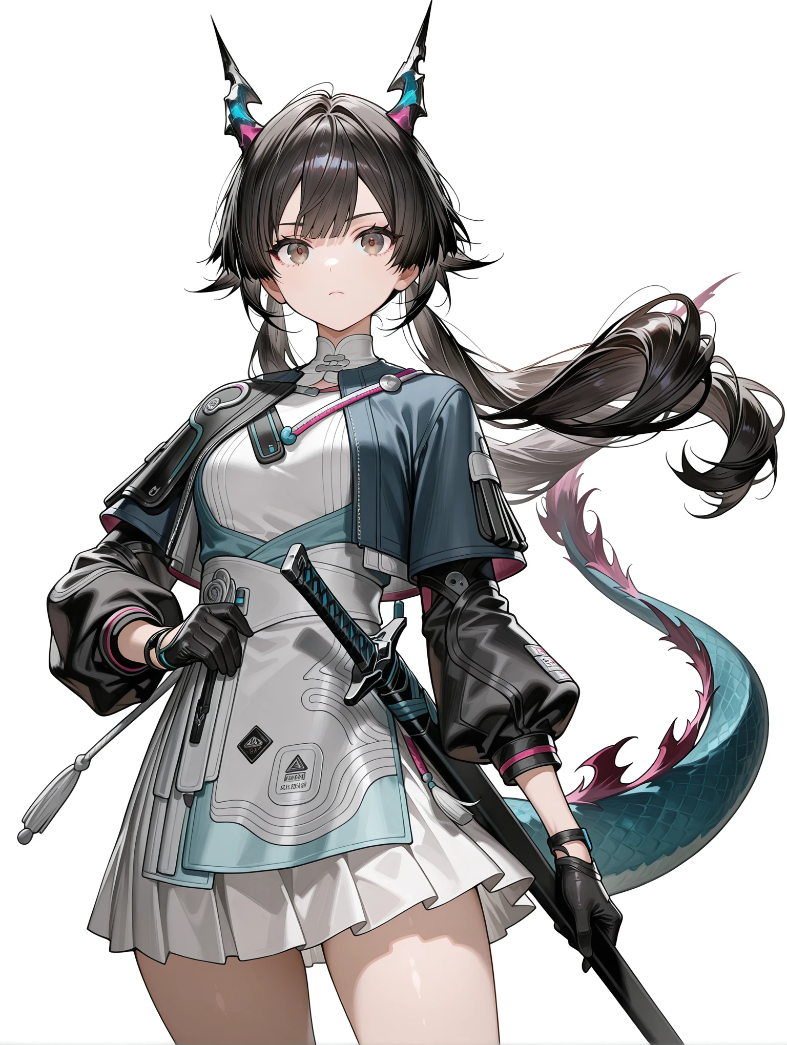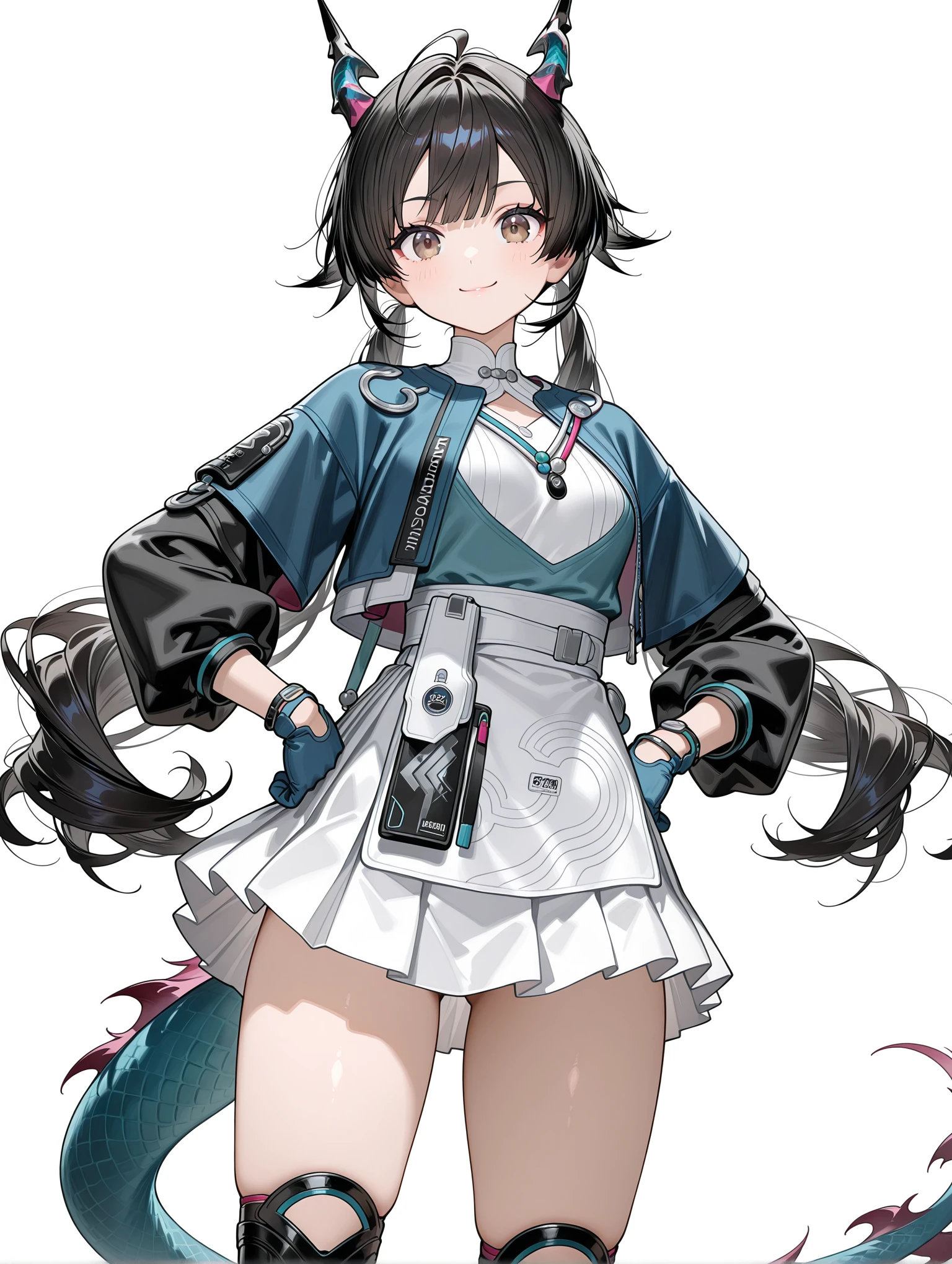 c_q,dragon horns,ahoge,black hair,brown eyes,low twintails,tail,