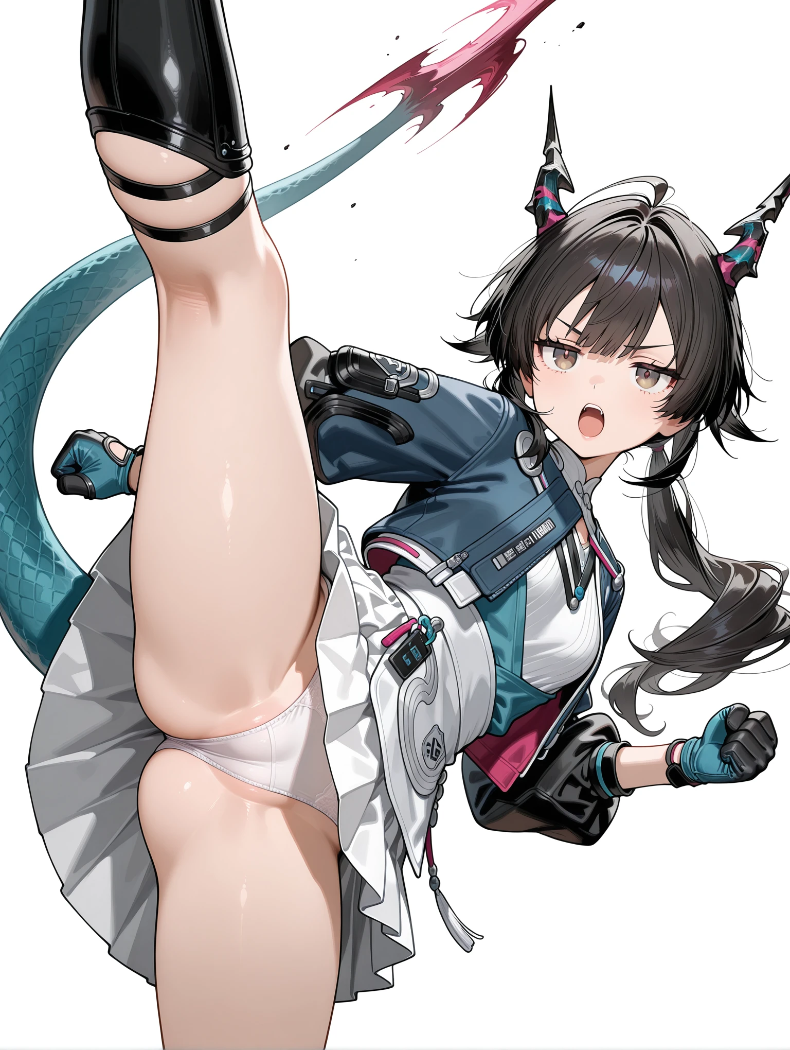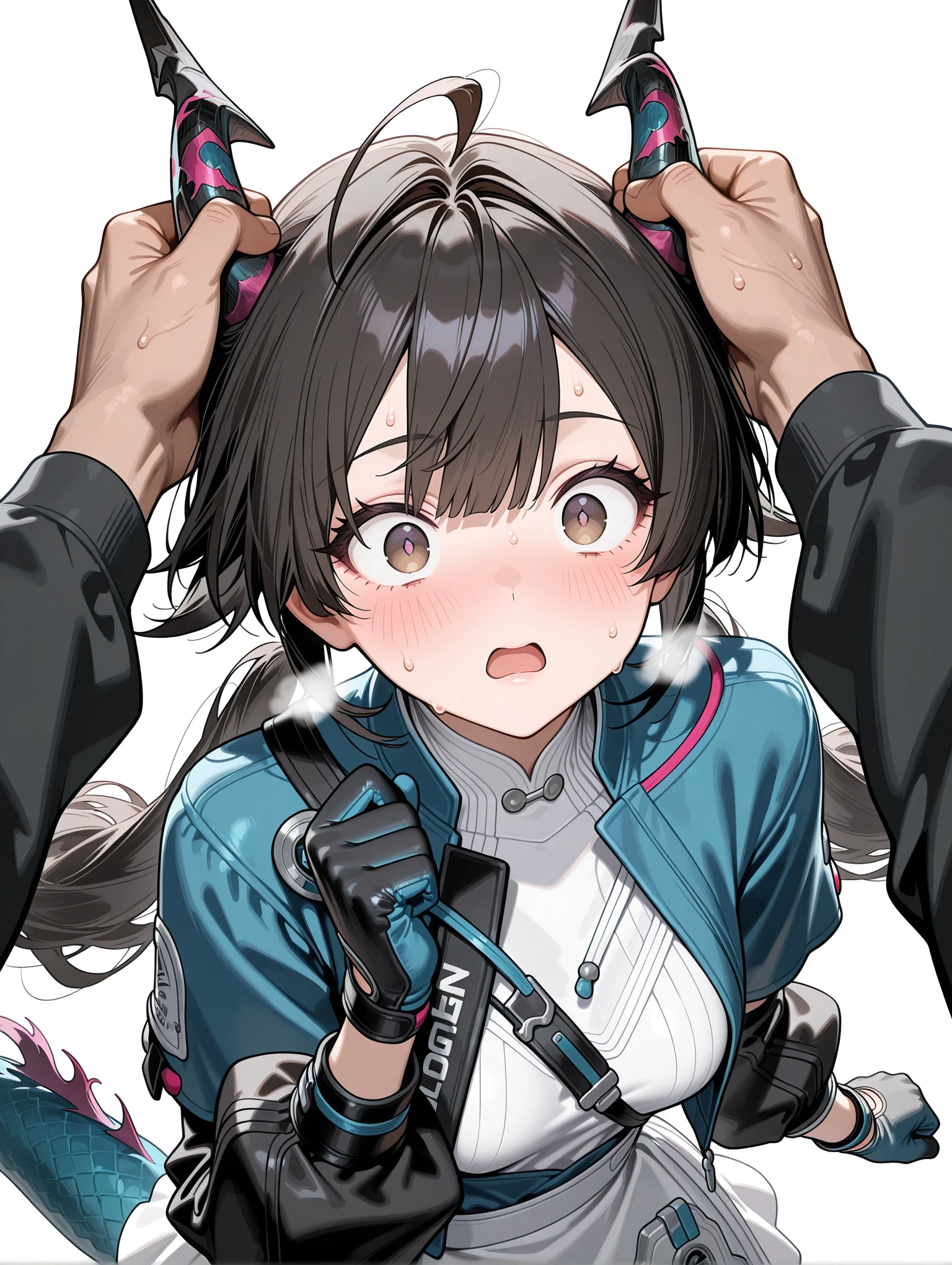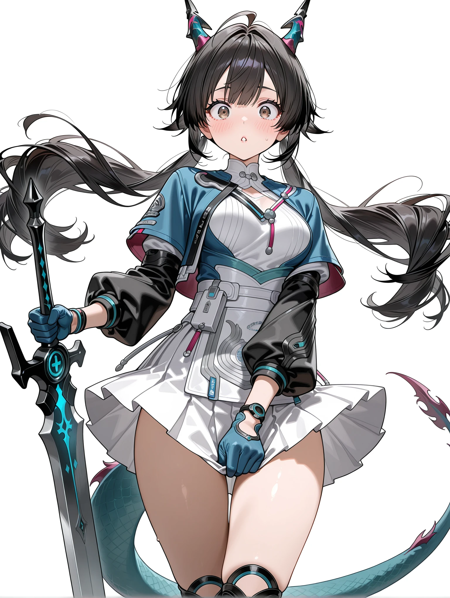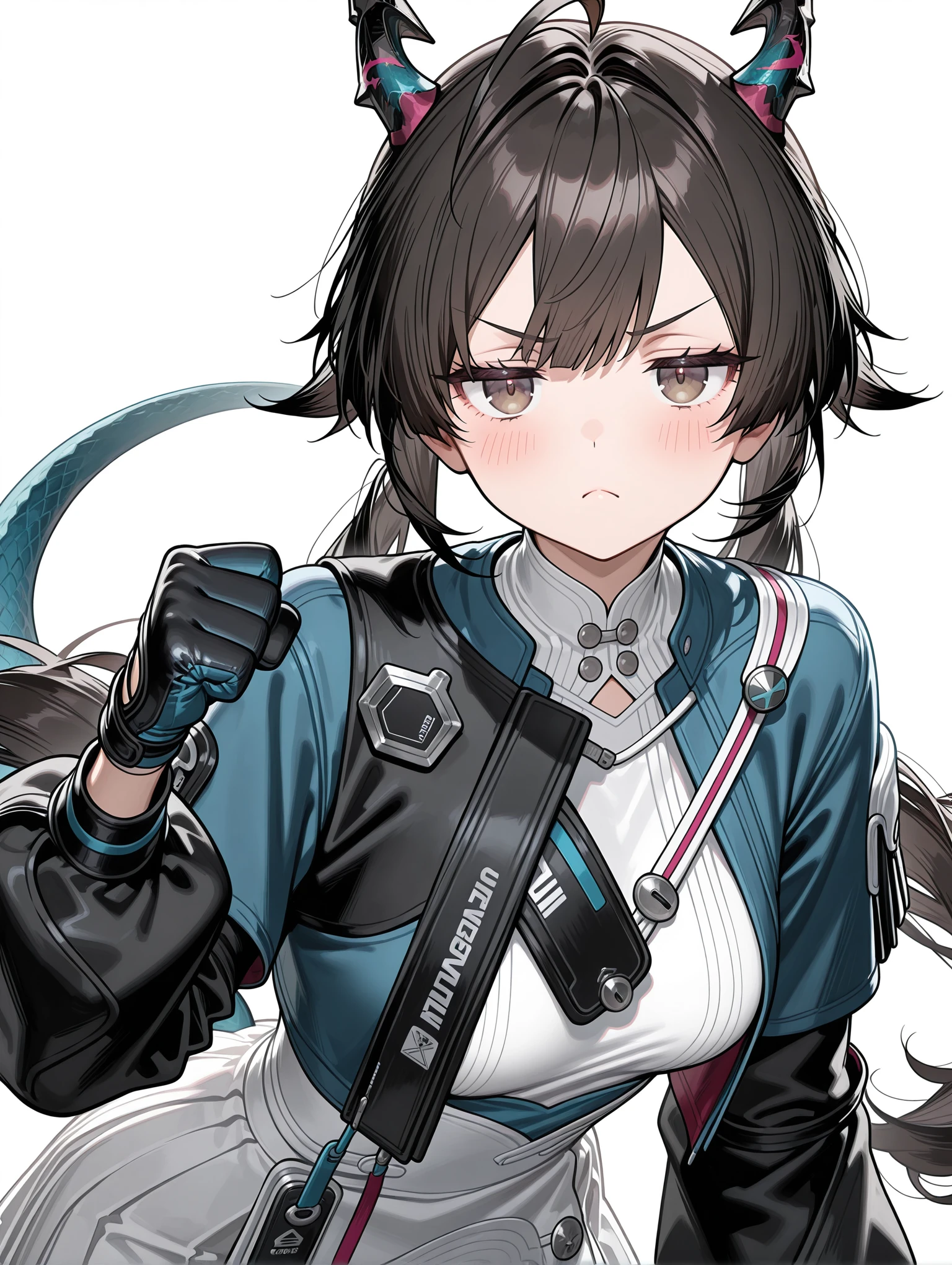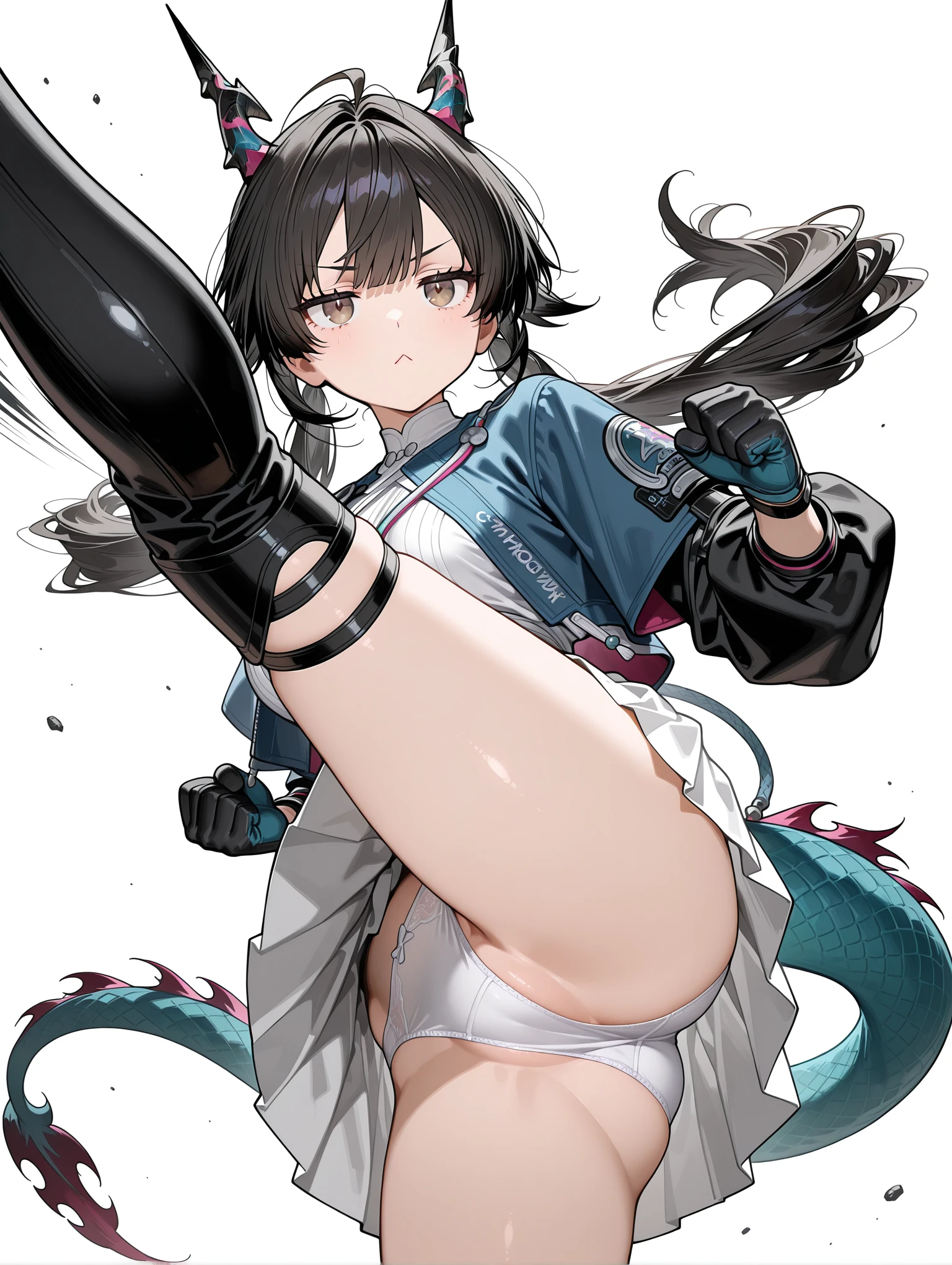 c_q,dragon horns,ahoge,black hair,brown eyes,low twintails,tail,