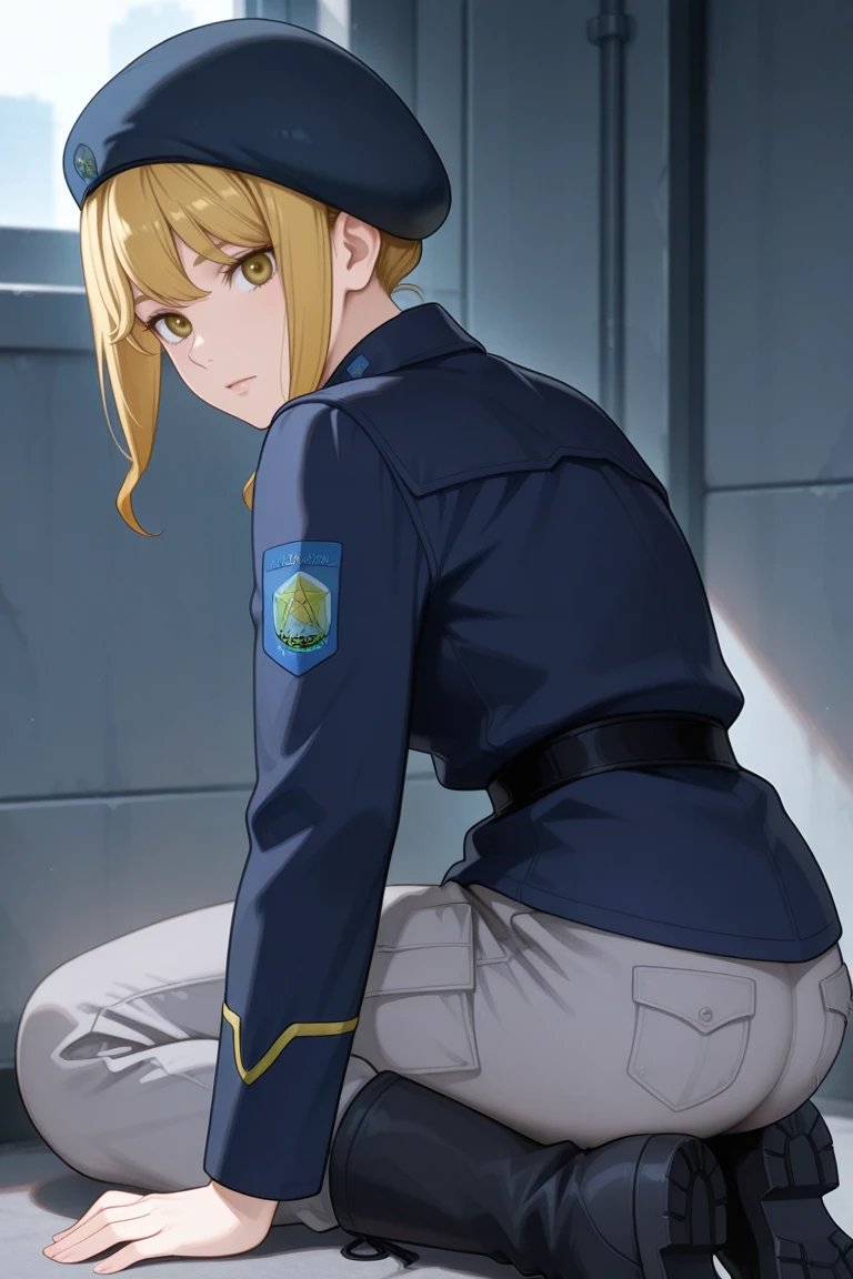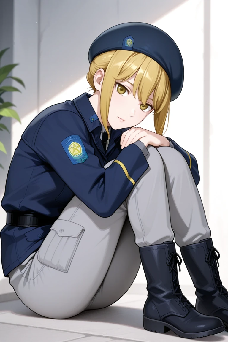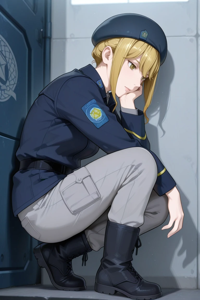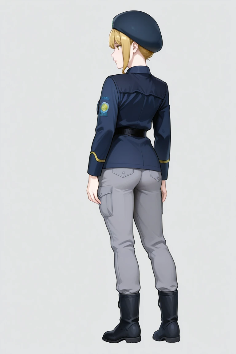 frederica_greenhill,blonde hair,beret,dark blue military uniform,grey pants,black boots