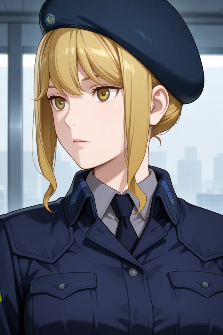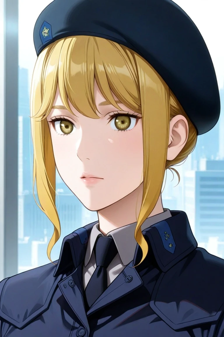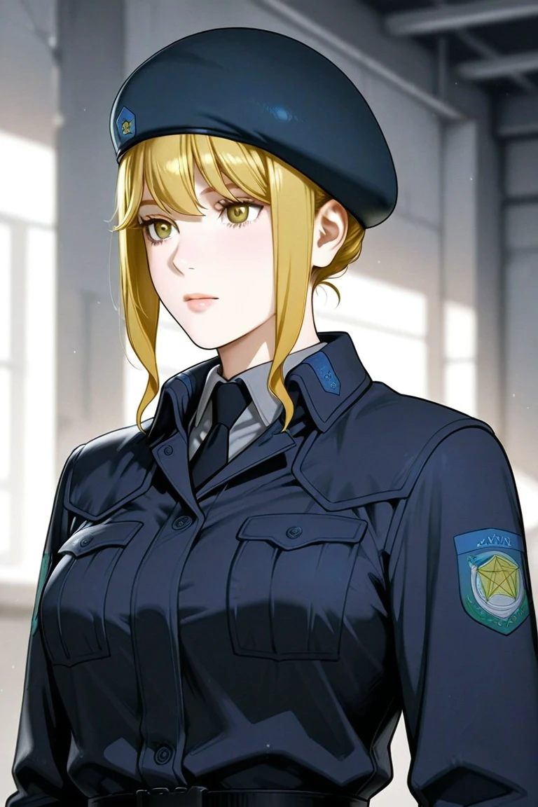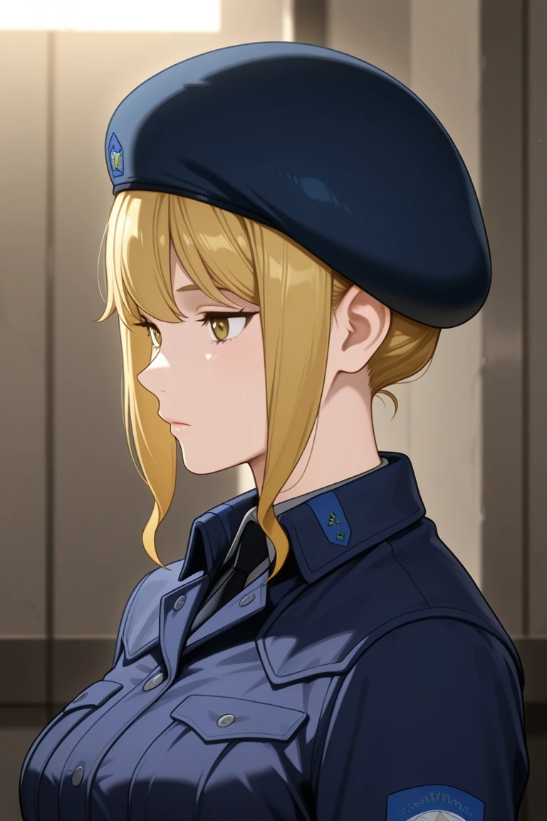frederica_greenhill,blonde hair,beret,dark blue military uniform,grey pants,black boots