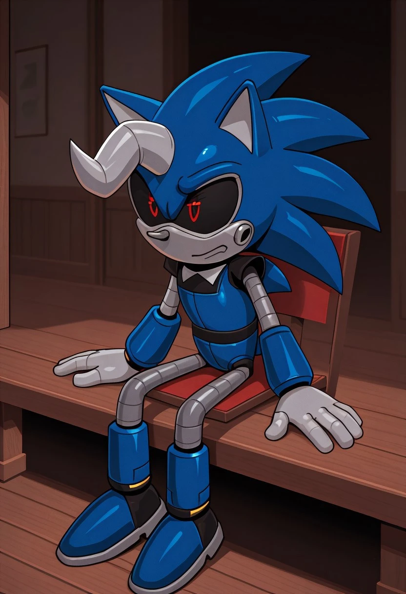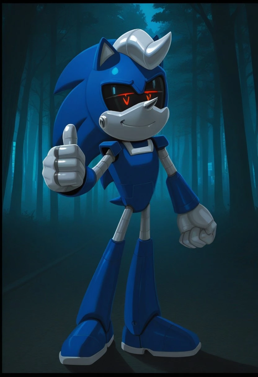 Jules the Hedgehog, robot, blue skin, silver muzzle, black sclera, red pupils, pointy nose, gray horn, silver limbs, silver hands