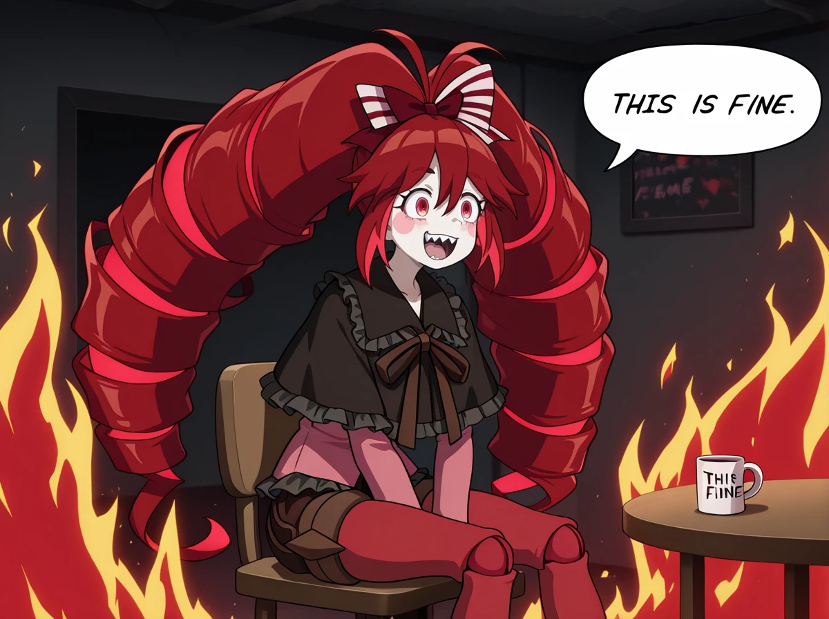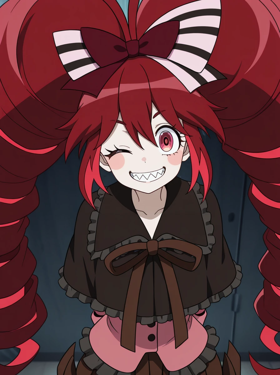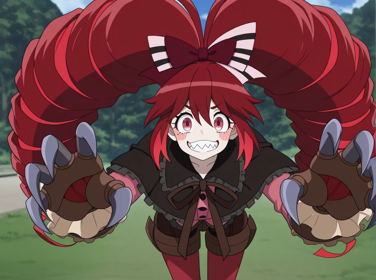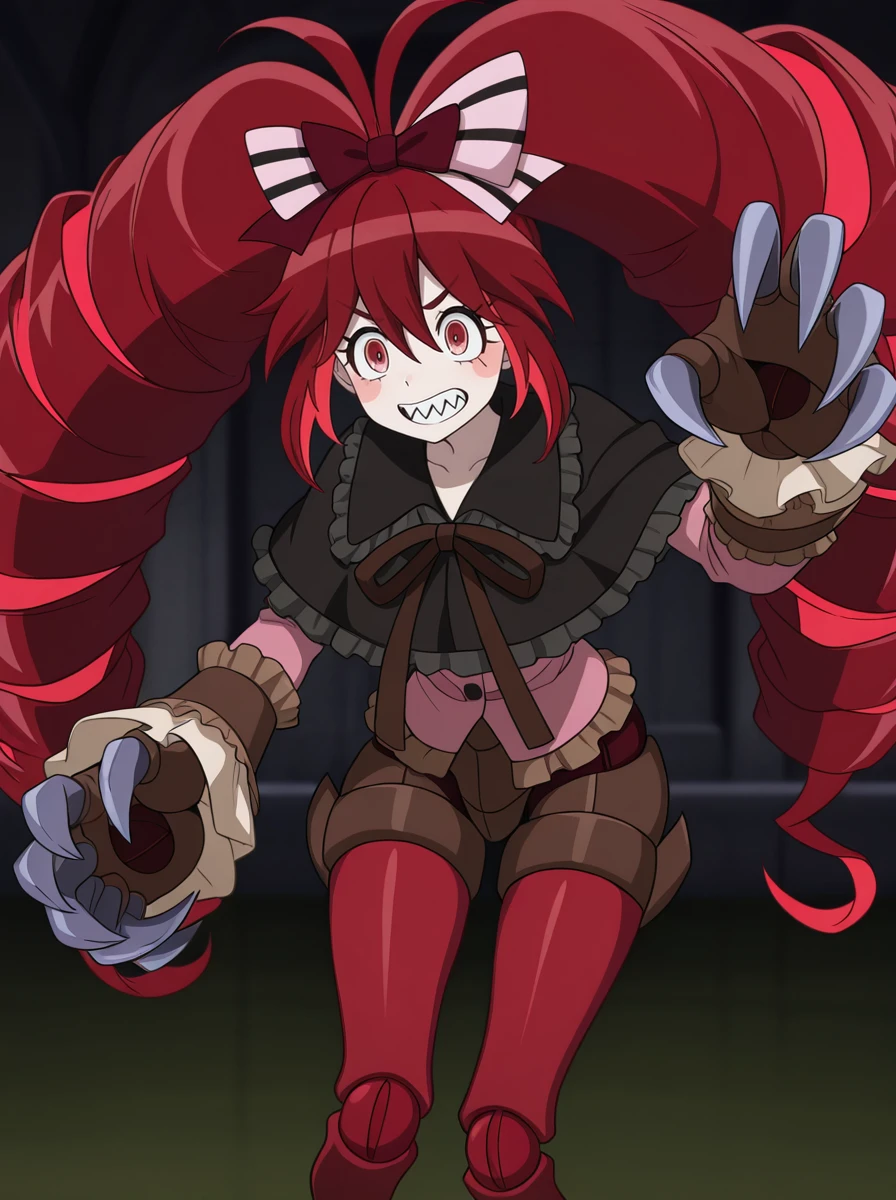 1girl, solo, blush stickers, red hair, long hair, twin drills, teeth, sharp teeth, drill hair, claw (weapon), red eyes, bow, joints, doll joints, antenna hair