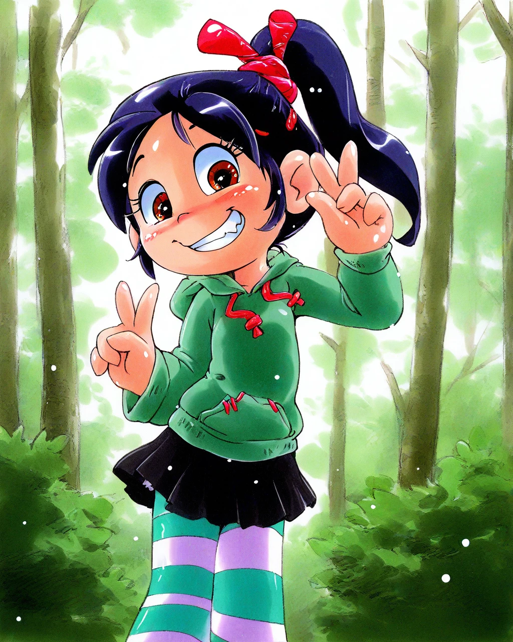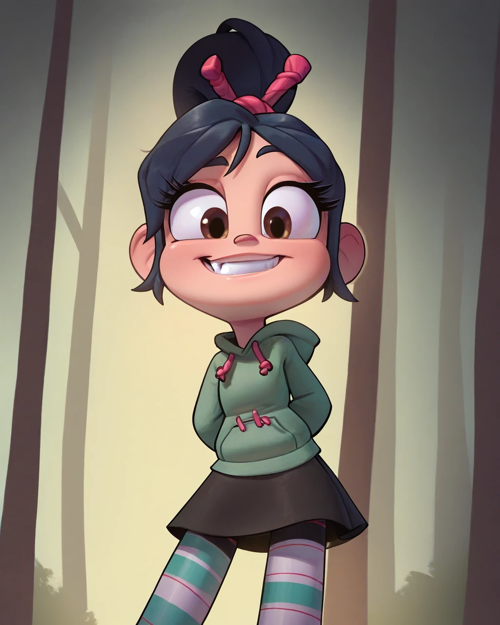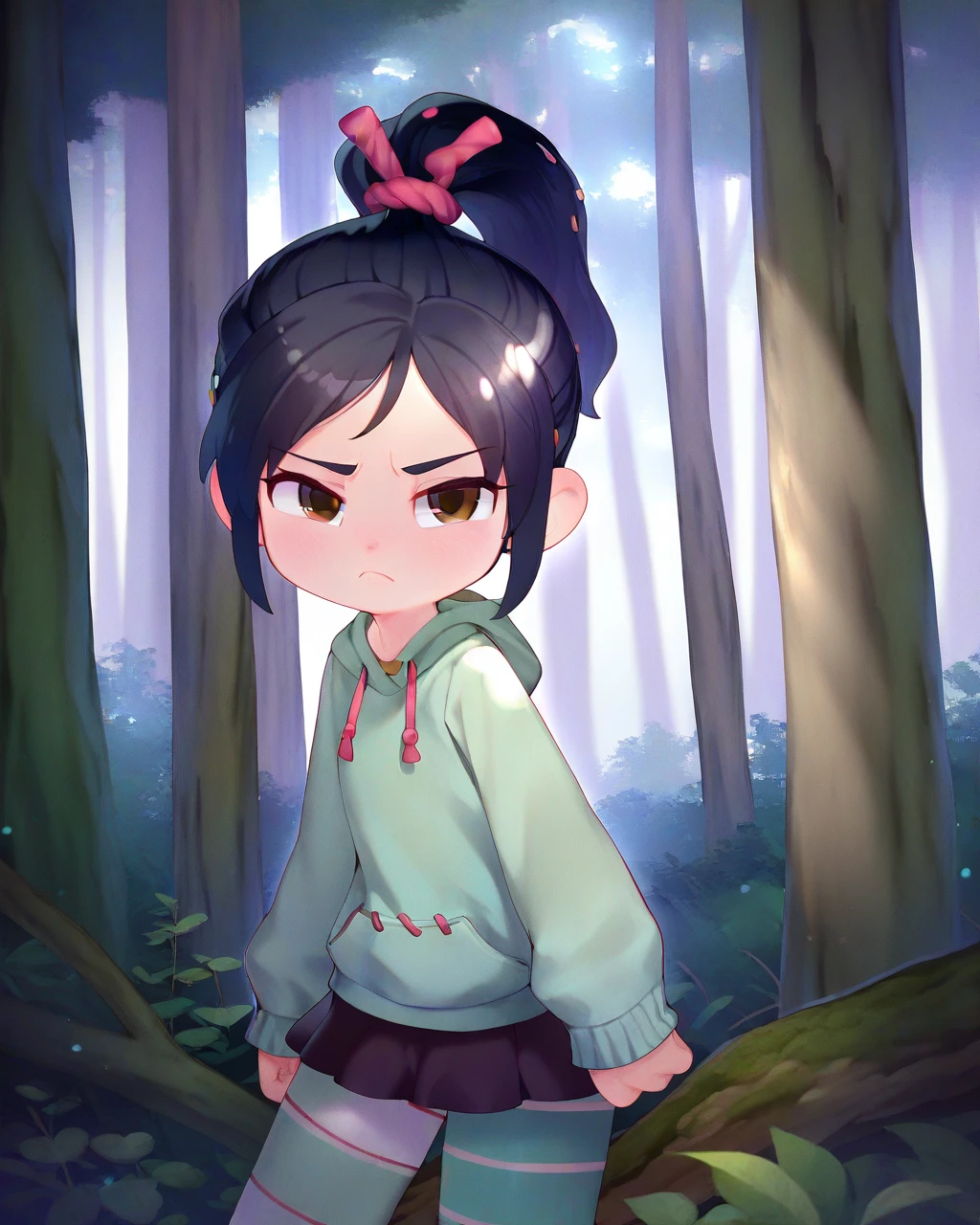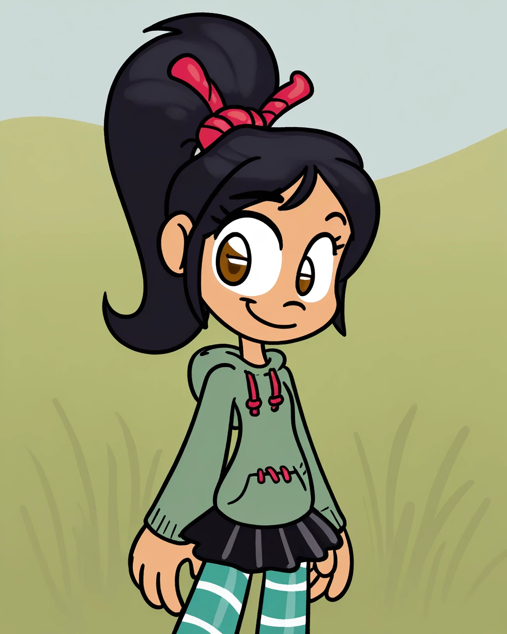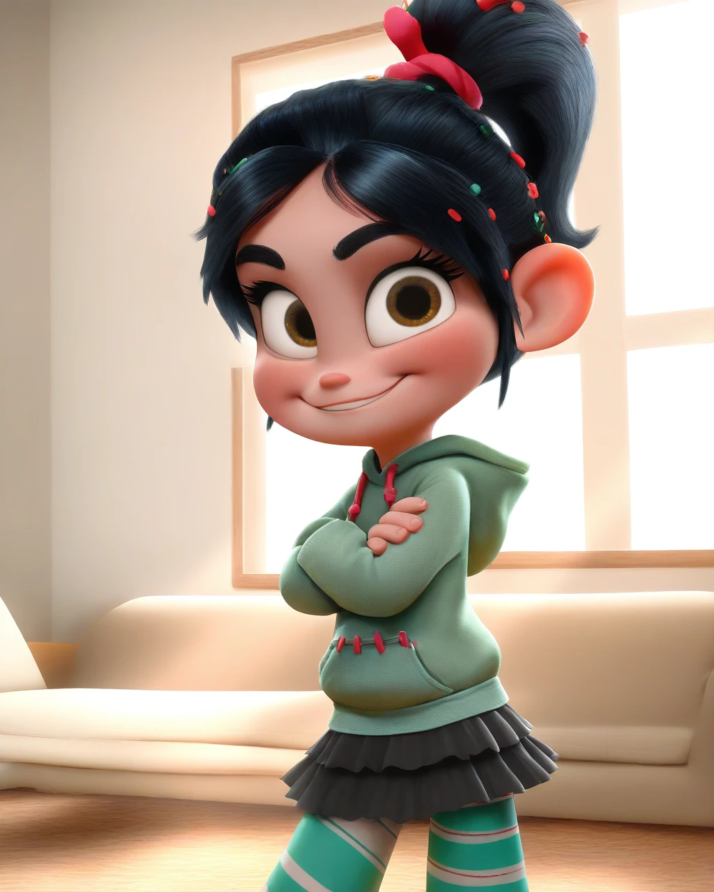 vanellope, high ponytail, hair tie, candy hair ornament, green hoodie, black skirt, striped pants, multicolored legwear, black footwear