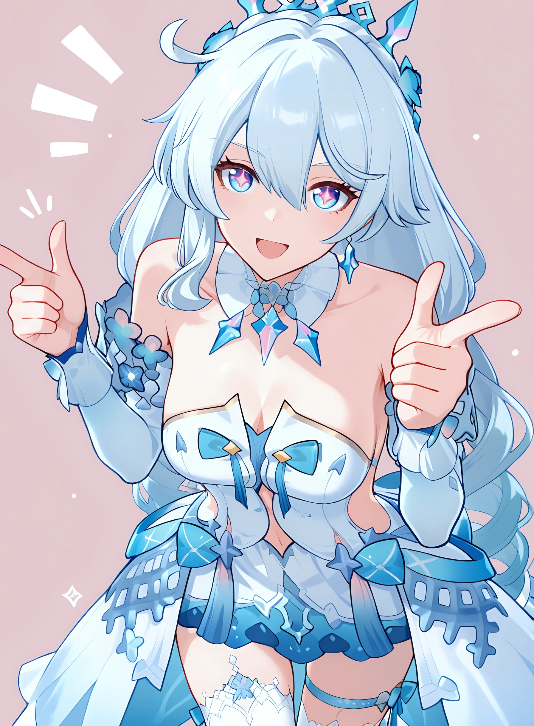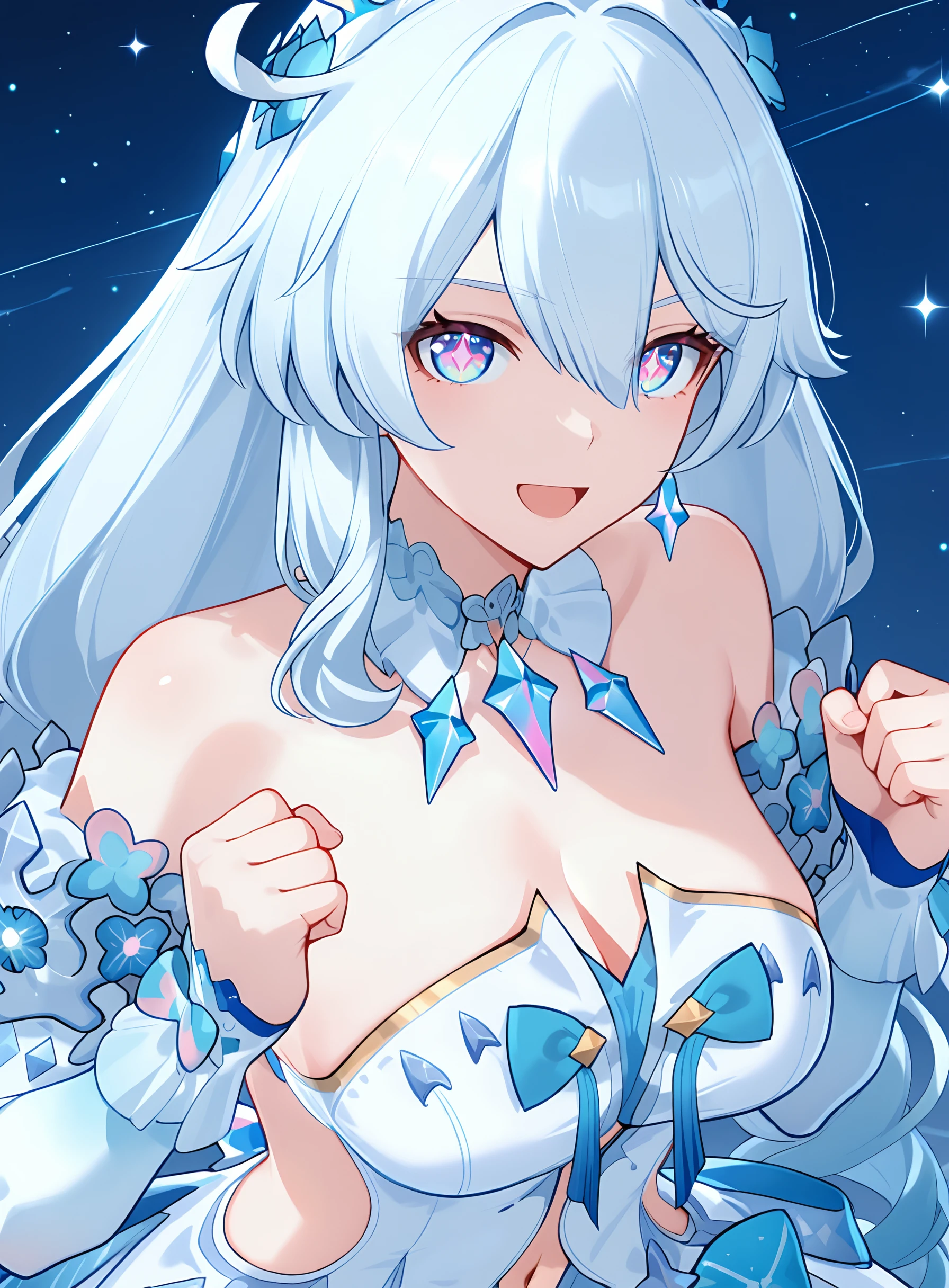 全身:kiana kaslana9600, solo, ???????, looking at viewer, long hair, dress, closed mouth, ???? shoulders, closed mouth, navel, cleavage, white dress, leg garter, detached sleeves, white sleeves, bunches, drill hair, multicolored eyes, diamond-shaped pupils, white hair, crown, leg garter,