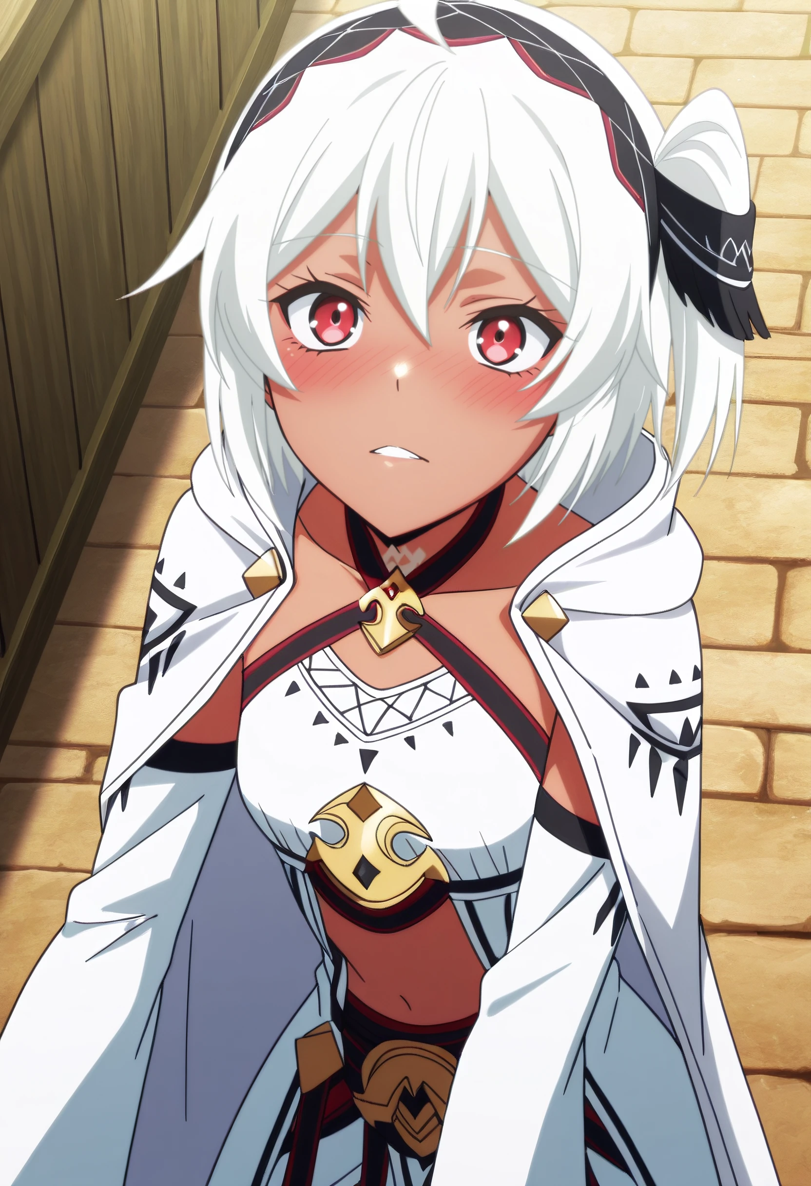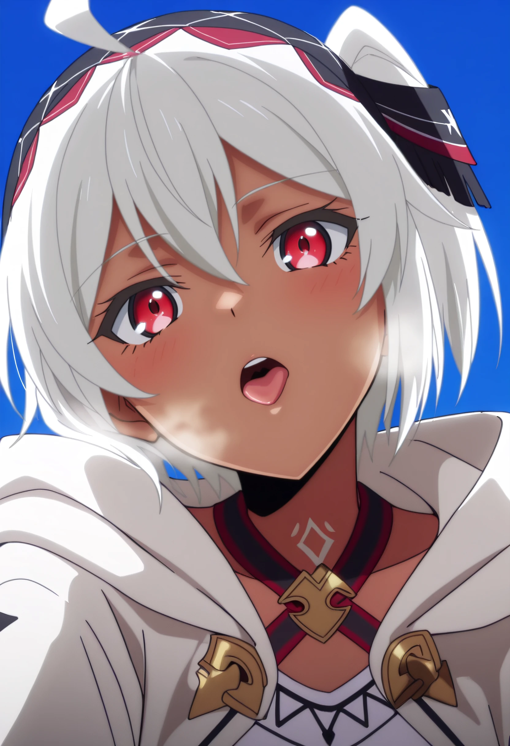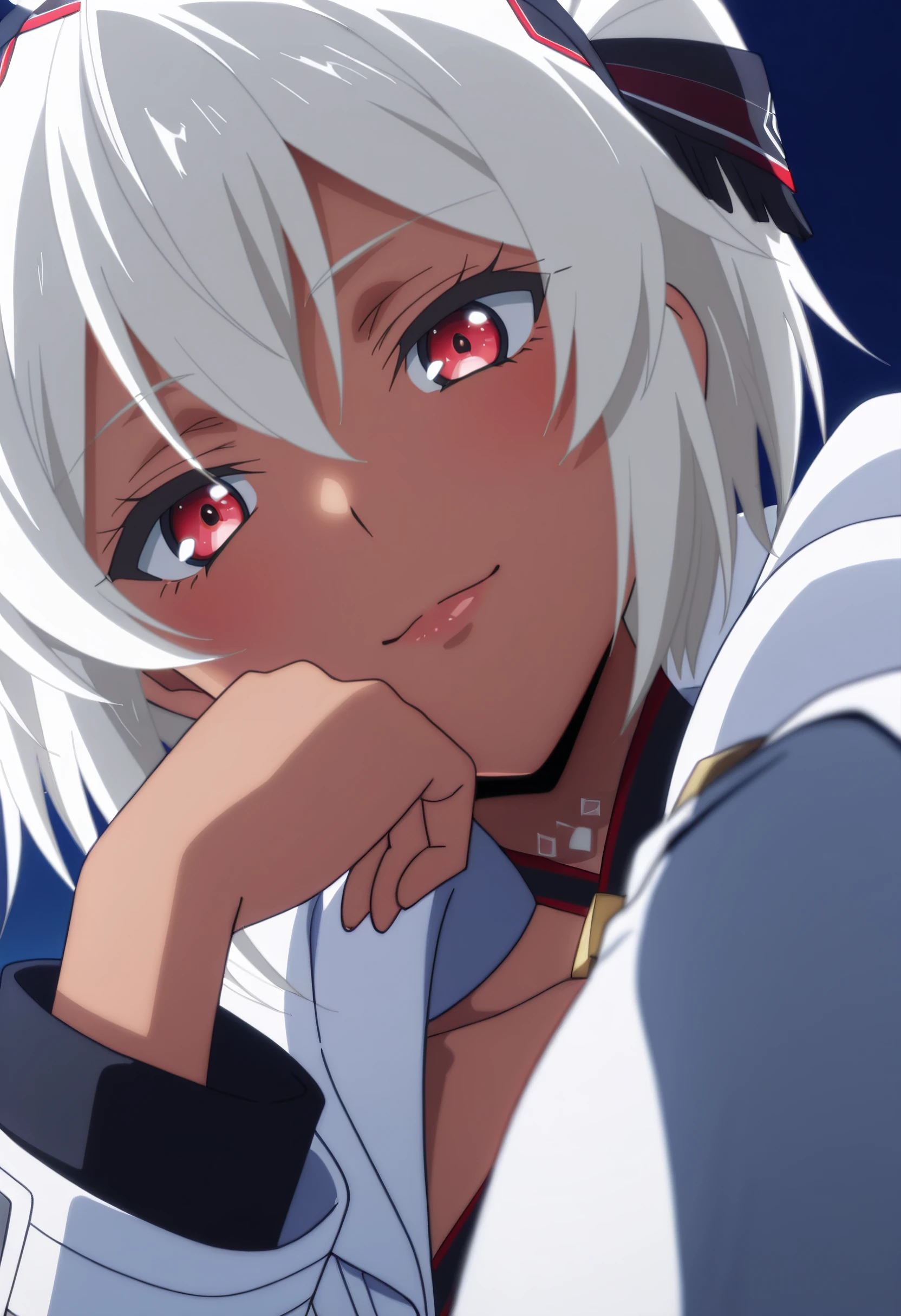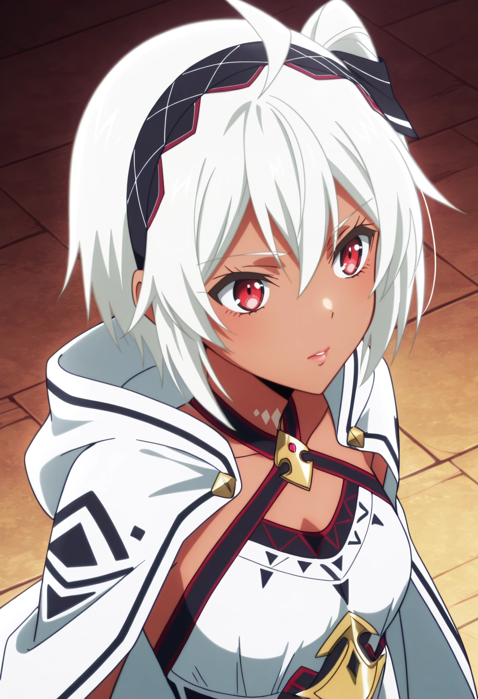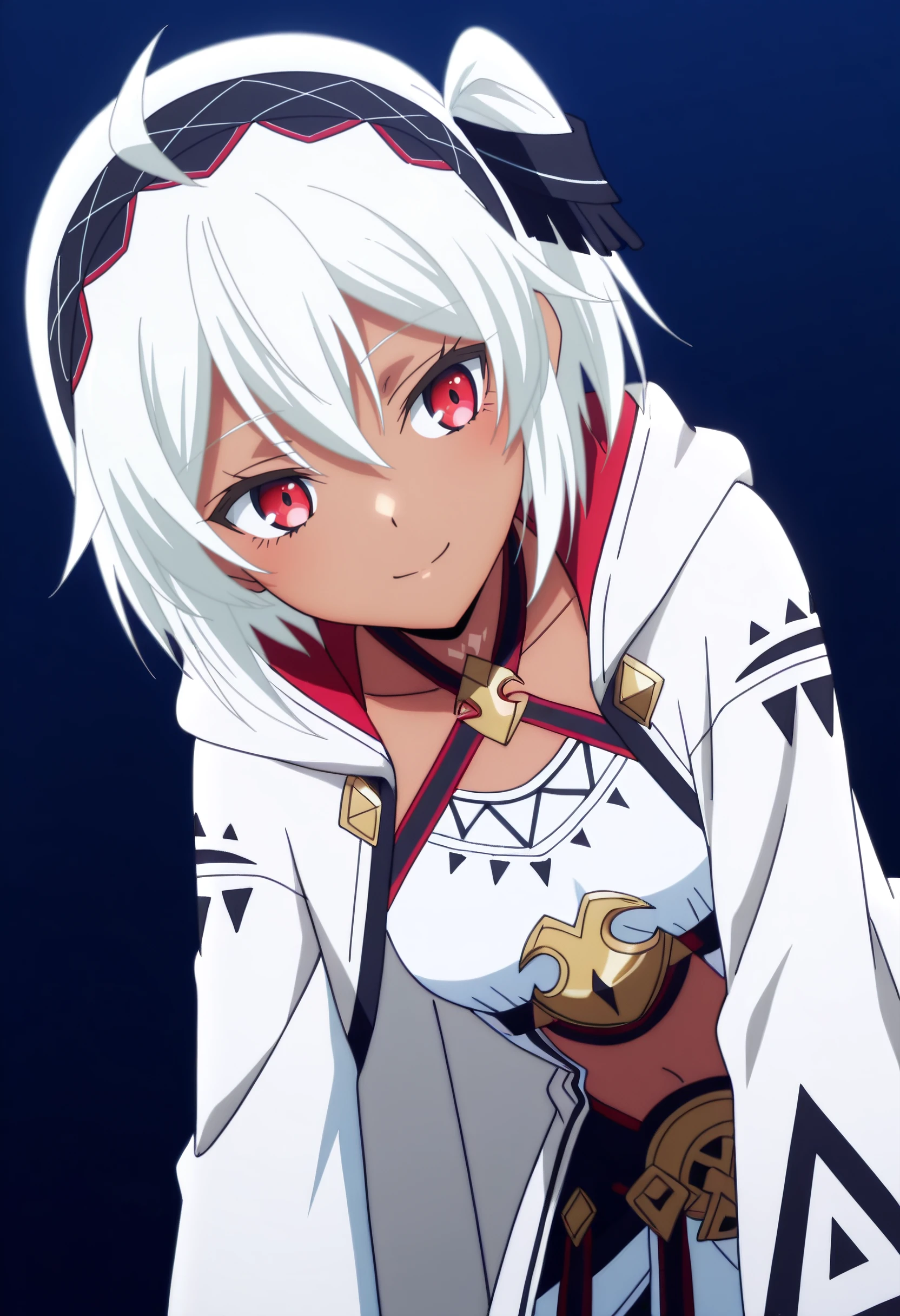 BNBMyne, white hair, short hair, red eyes, hair between eyes, bangs, dark-skinned female, dark skin, hairband, choker,