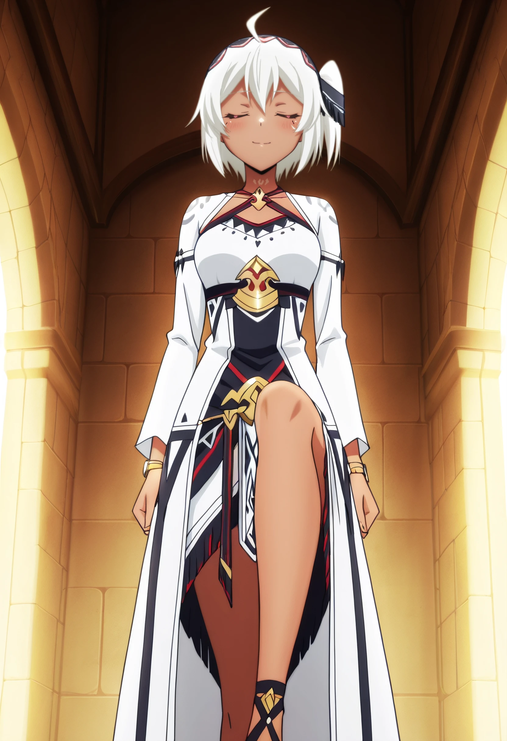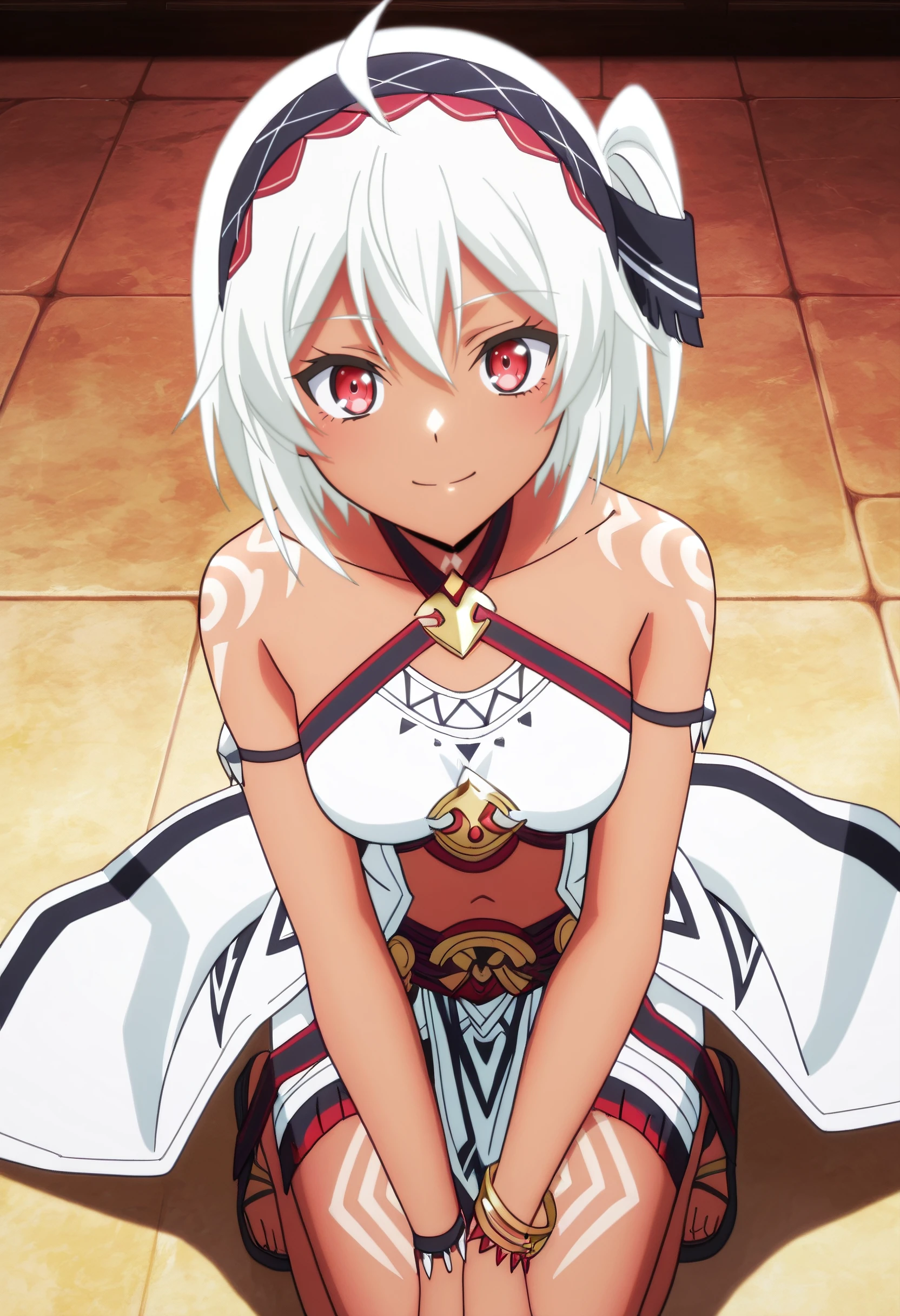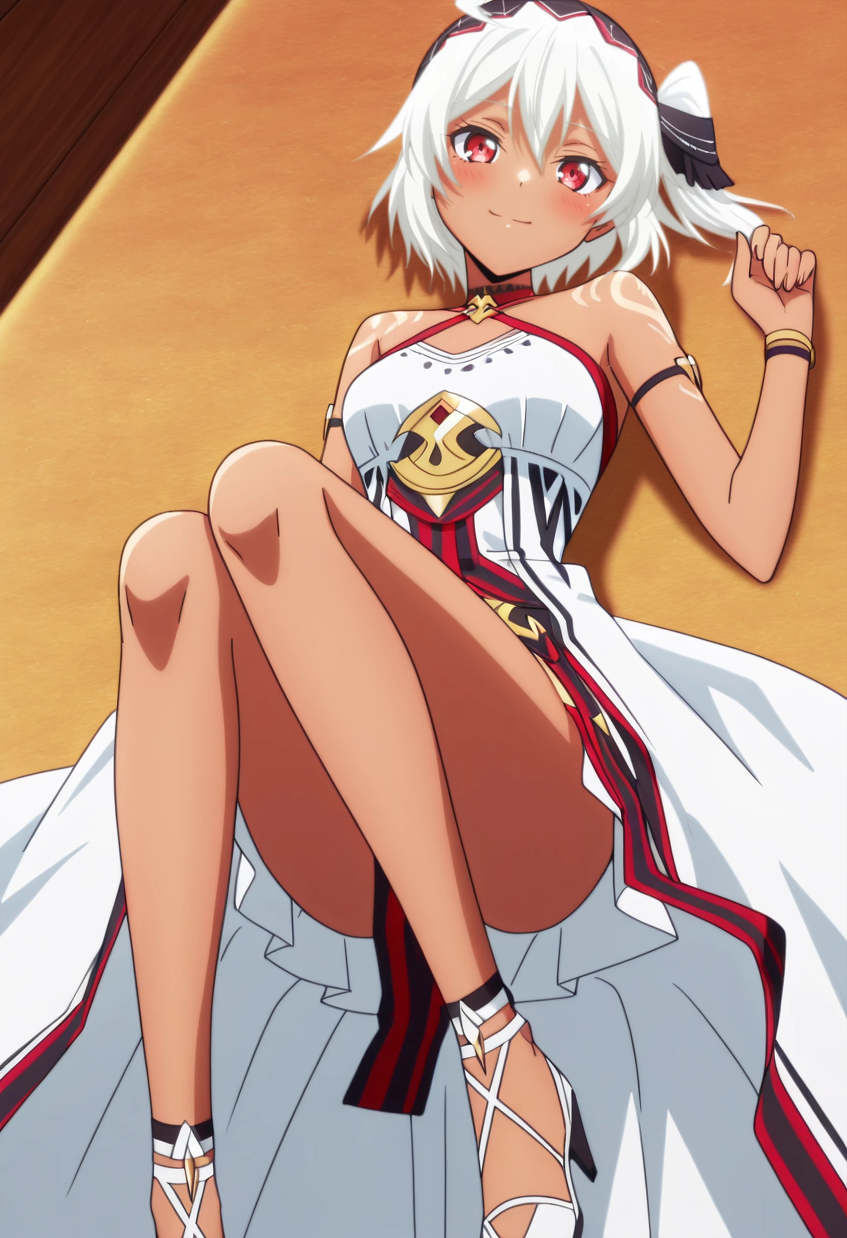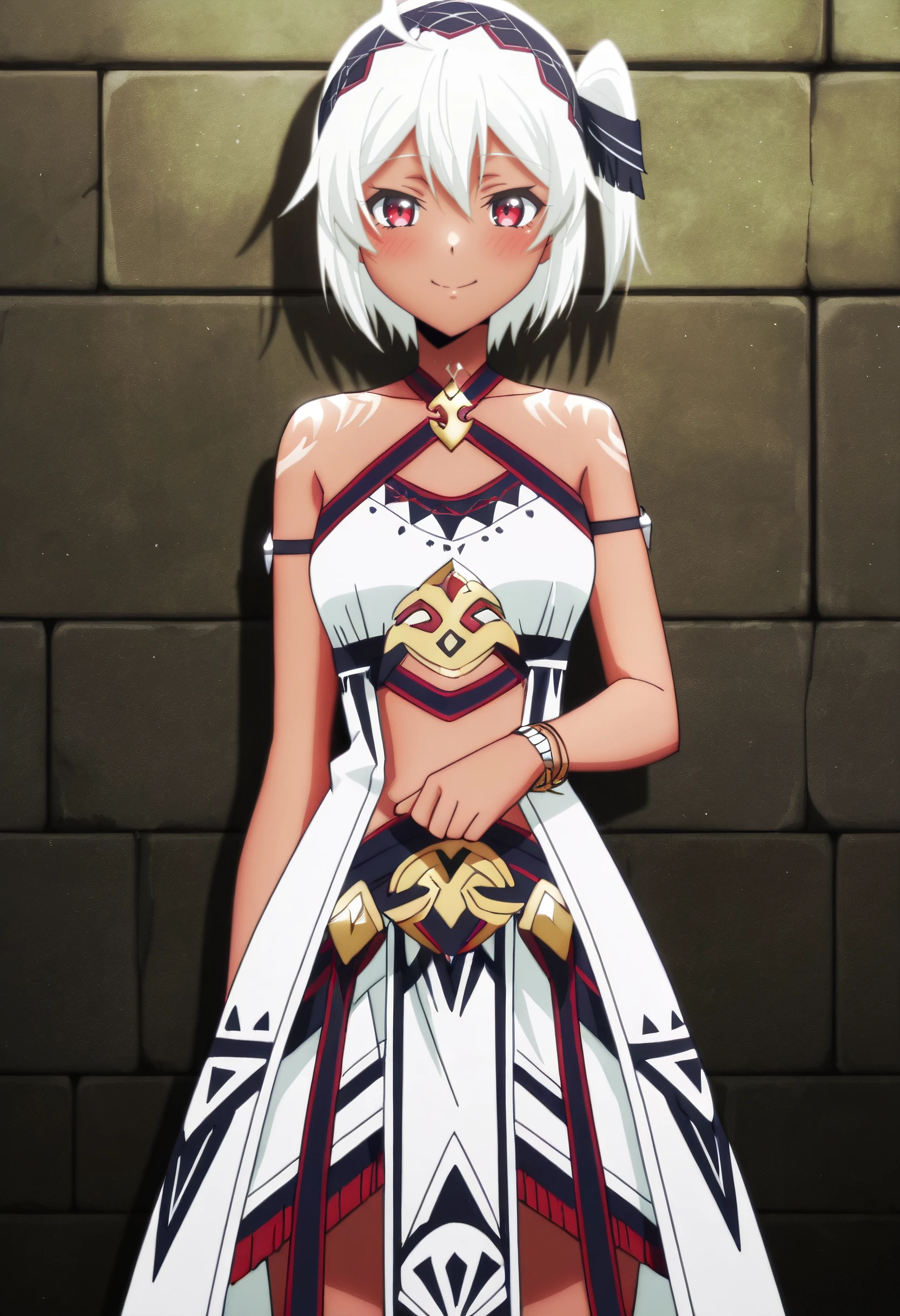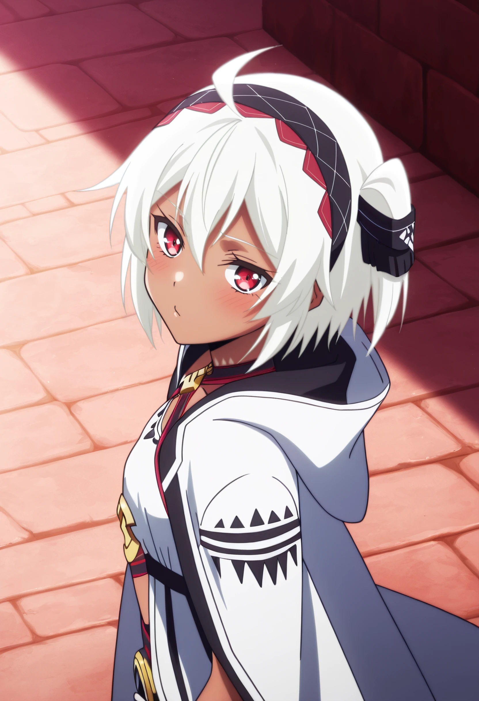 BNBMyne, white hair, short hair, red eyes, hair between eyes, bangs, dark-skinned female, dark skin, hairband, choker,