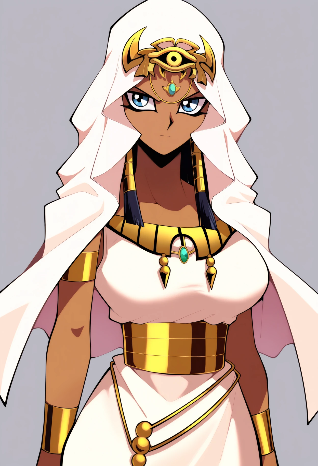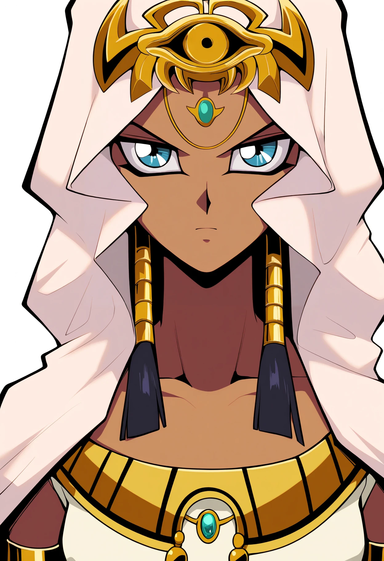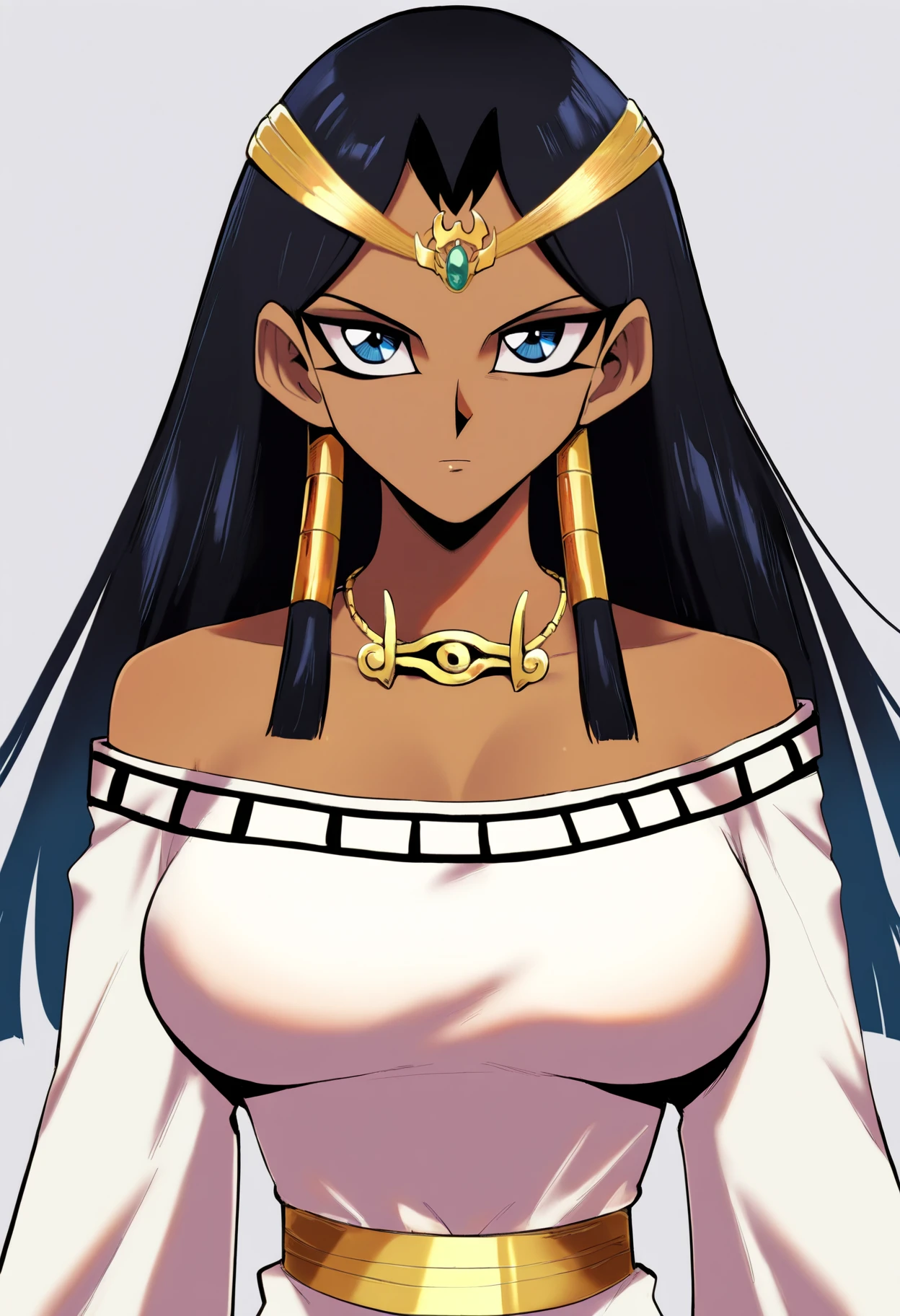 1girl, ishizu ishtar, black hair, blue eyes, long hair, hair tubes, dark skin