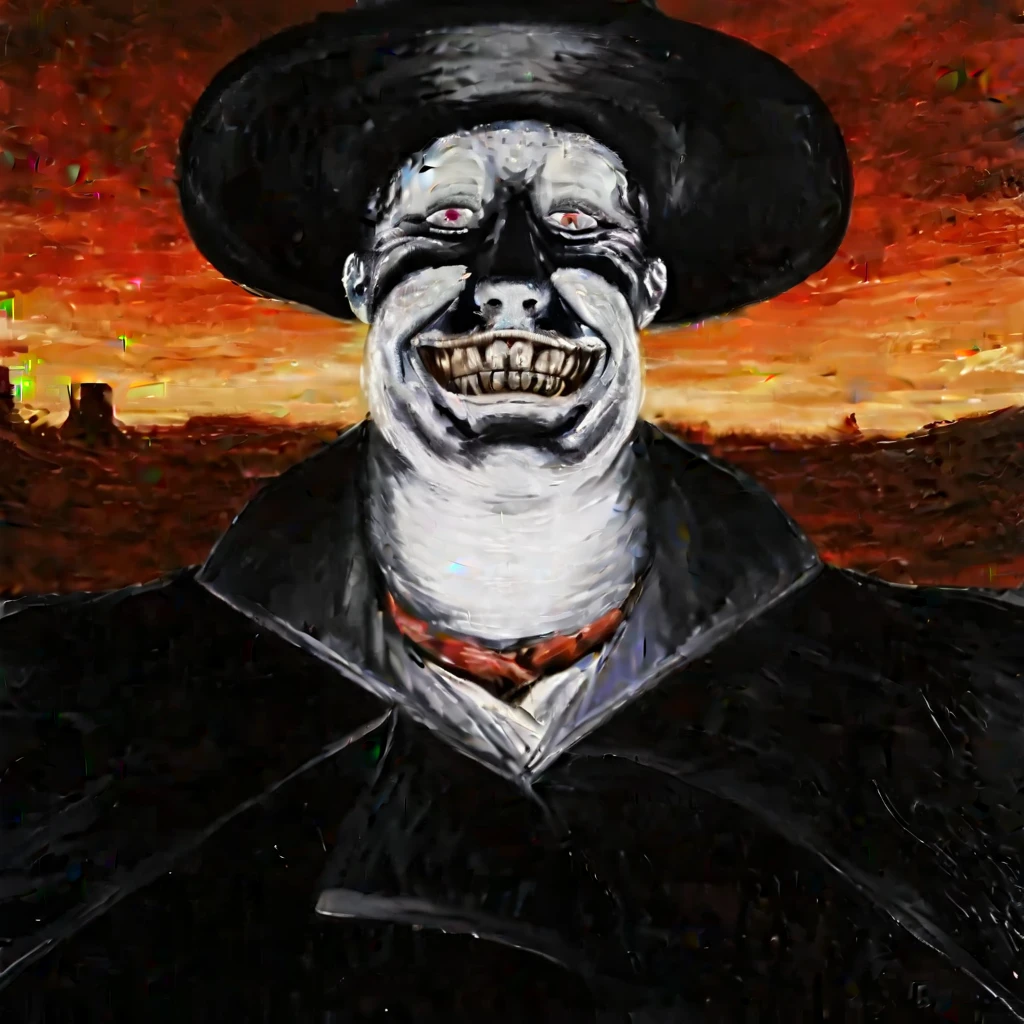 alone, top hat, evil smile, Sinister_Smile, shadow on the face, Red_Eyes, Yellow_Teeth, Black_Hat, Black_Coat, Red_Scarf, Macabre, Terror, Menacing_Smile, Disturbing_Expression, Grotesque_Style, Red_Sunset, Desert_Landscape, Orange_Sky, Mountain_Silhouettes, Painting, Intense_Colors, Dark_Contrast